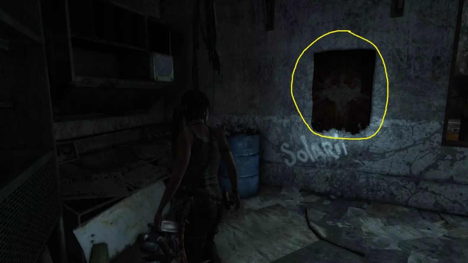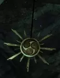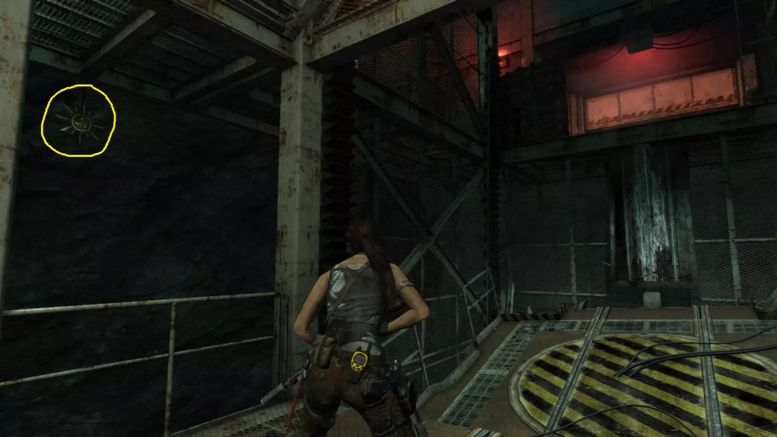 那个物体悬挂在天花板上。它的位置非常靠近劳拉射击第二个物体时站立的地方——在这张图片中,那个门口就在劳拉头部正后方的墙上。镶嵌图:从正下方看到的图腾,通过生存本能模式的余辉进行了视觉增强。 截图B - Sun KIller 3/5