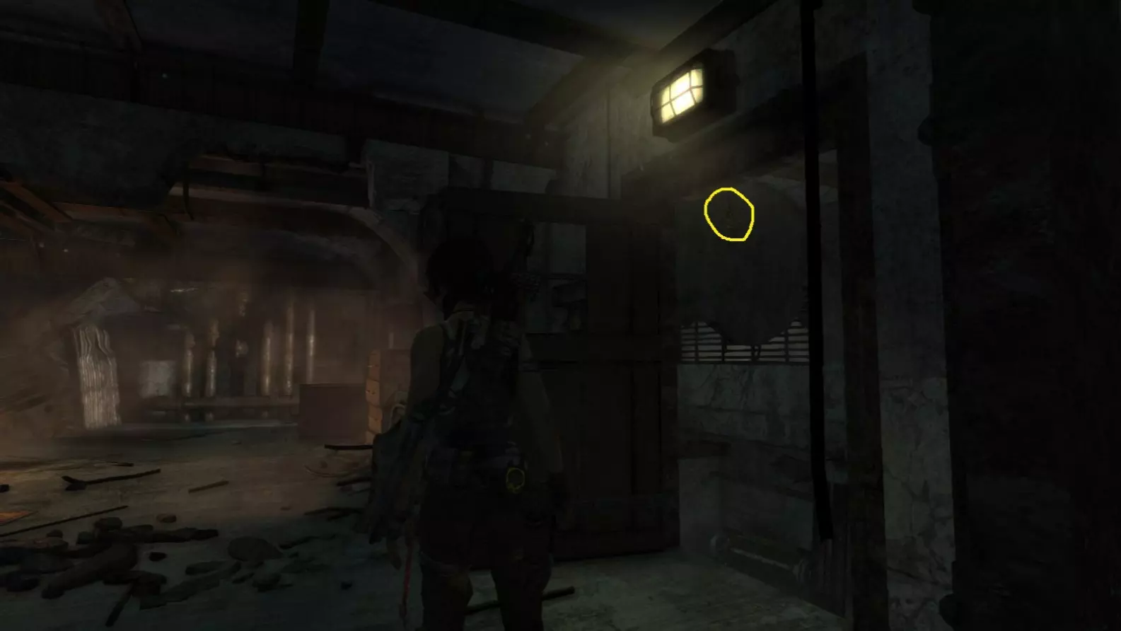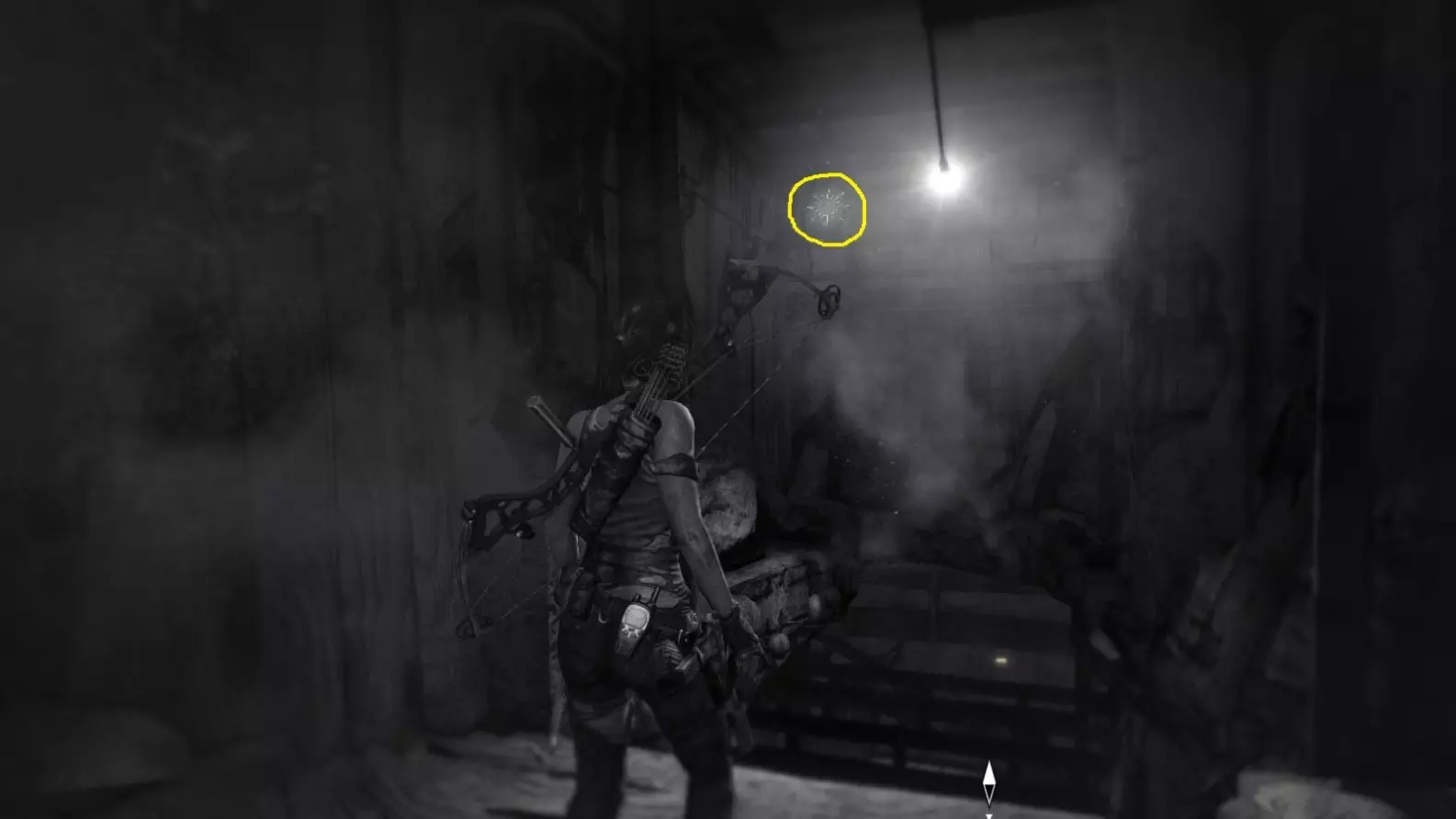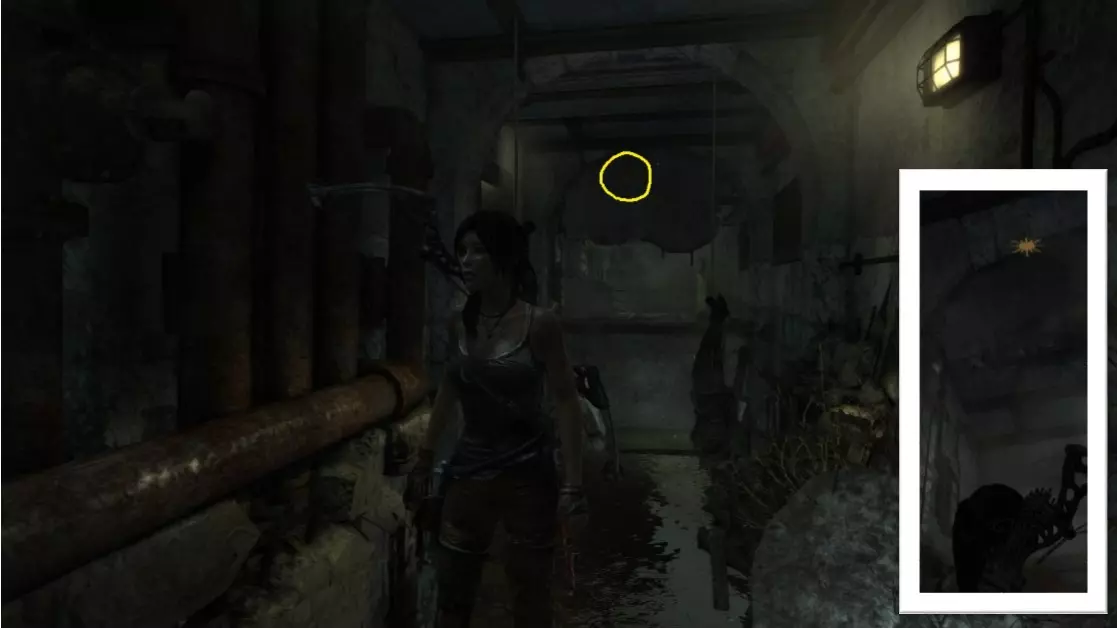 劳拉刚刚从墙上的缝隙挤入这个房间。正前方悬挂着一个闪亮的灯泡,遮挡了它后方悬挂的物体。使用生存本能(Q)可以看得更清楚,然后射击将其摧毁。 截图B - 太阳杀手 1/5