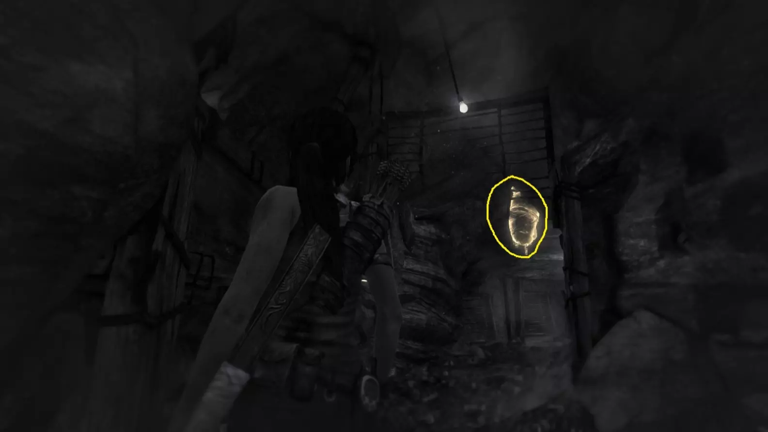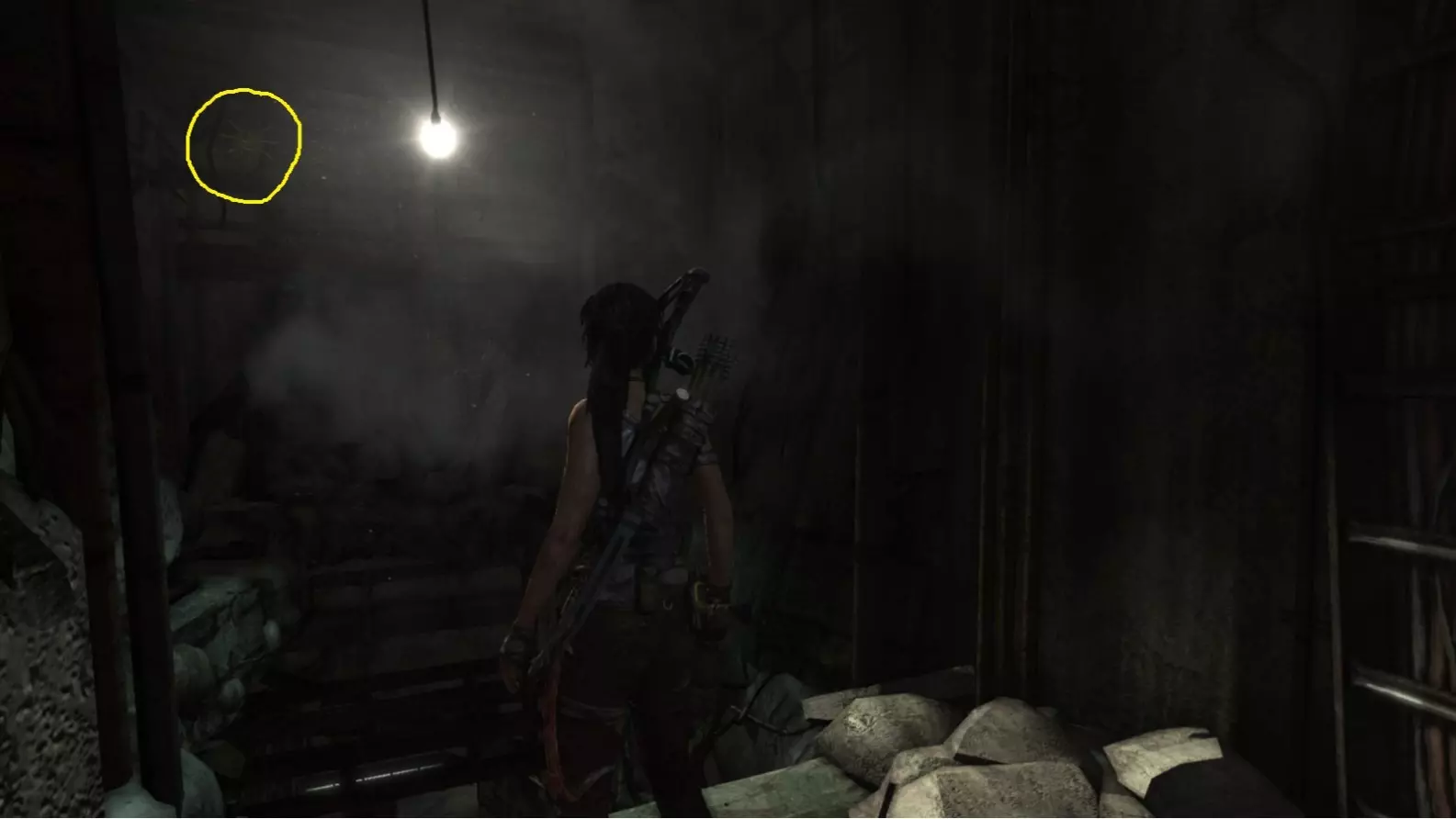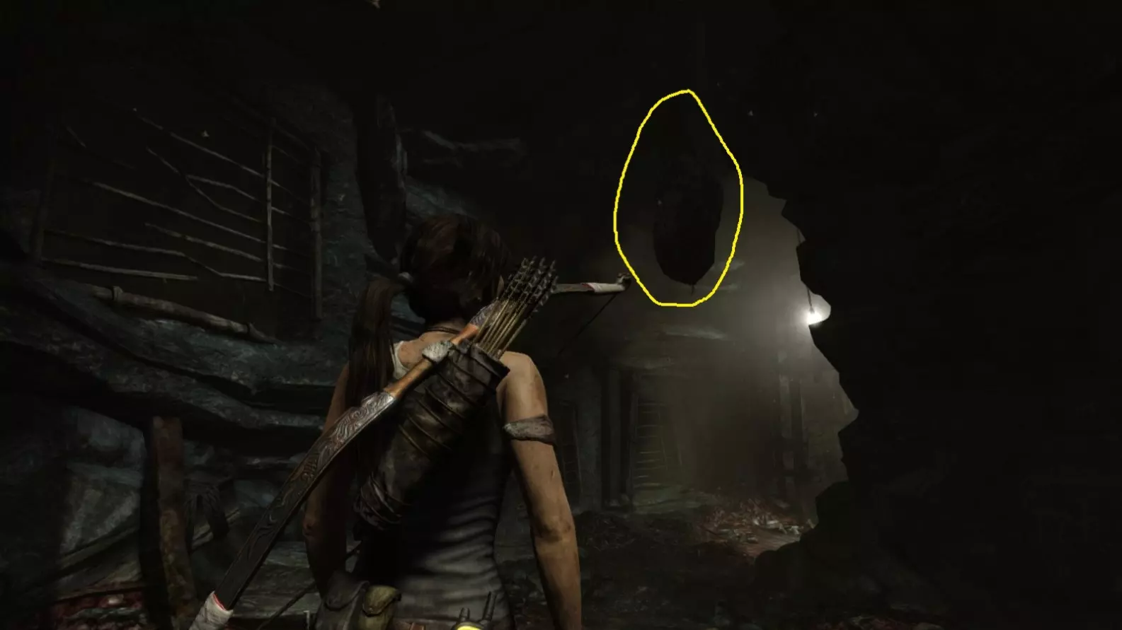 劳拉刚刚从墙上的缝隙挤入这个房间。正前方悬挂着一个闪亮的灯泡,遮挡了它后方悬挂的物体。使用生存本能(Q)可以看得更清楚,然后射击将其摧毁。 截图B - 太阳杀手 1/5