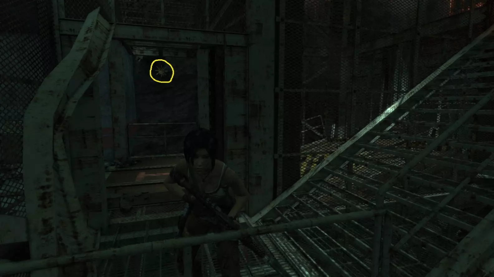 位于底层电梯井不远处,在铁丝网后面。射击铁丝网。 截图B - Sun Killer 5/5