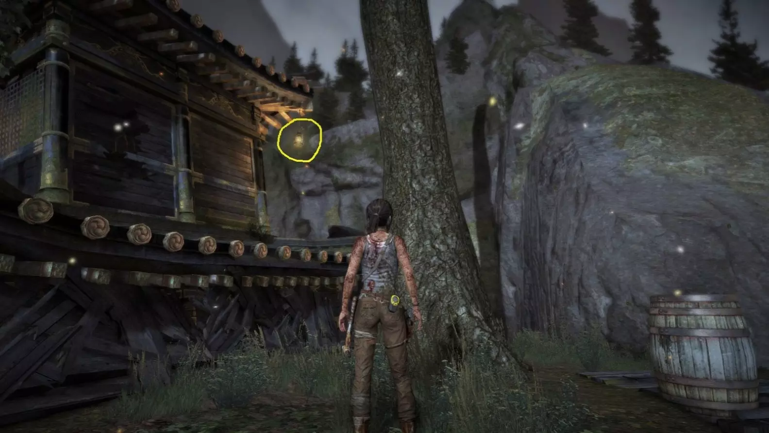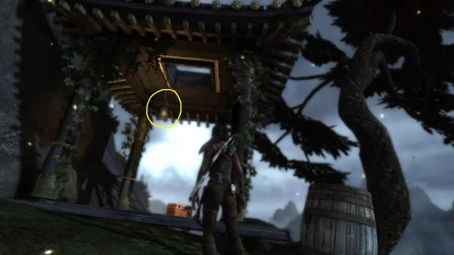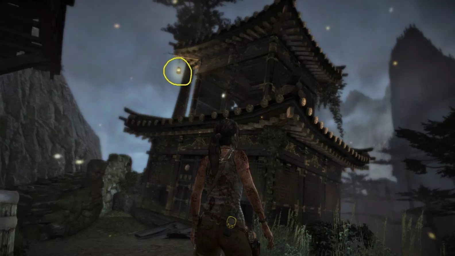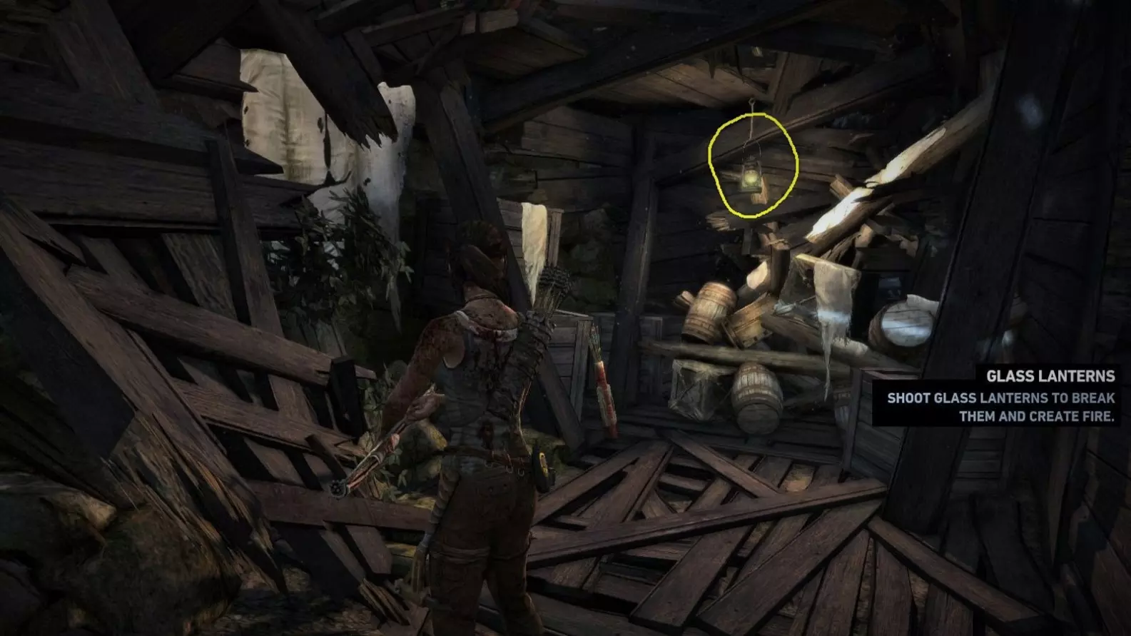 近距离视角。(如果劳拉摧毁灯笼后,同一位置再次出现灯笼,也要射击那个灯笼以确保安全。)