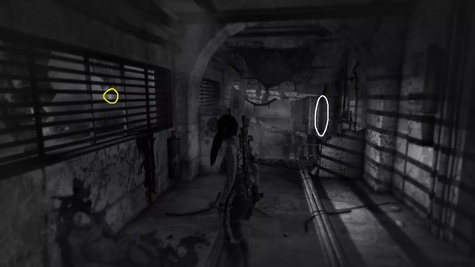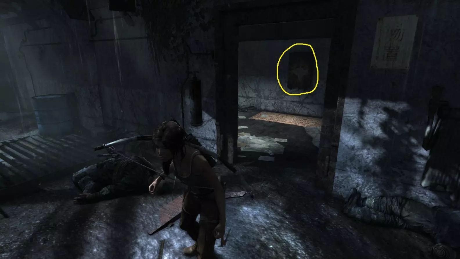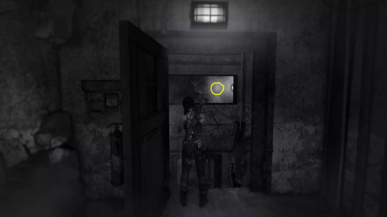 在【生存本能】模式(Q键)中也能看到。劳拉正站在走廊里,已打开的门(截图A)用白色圆圈标出。前往那个门口即可获得清晰的射击视角。