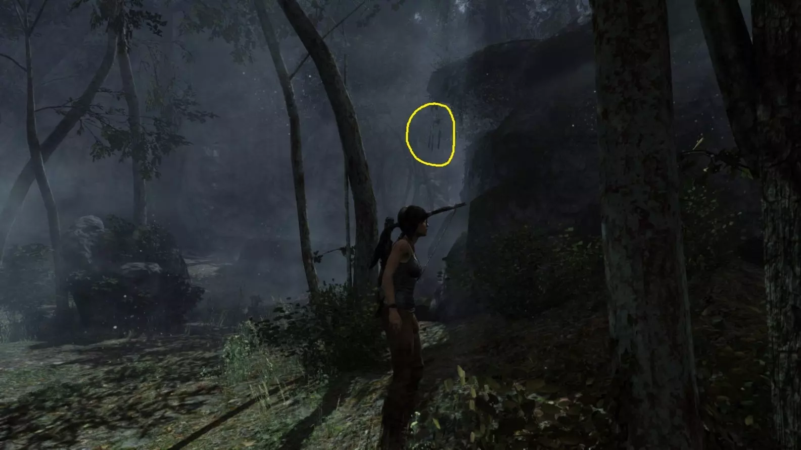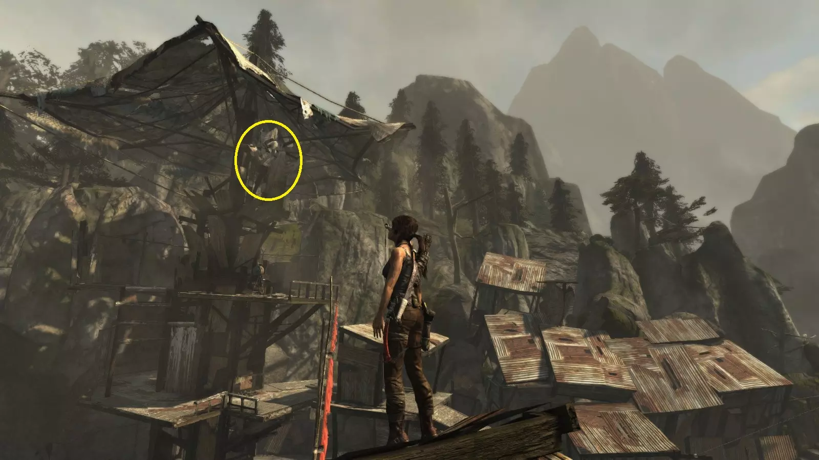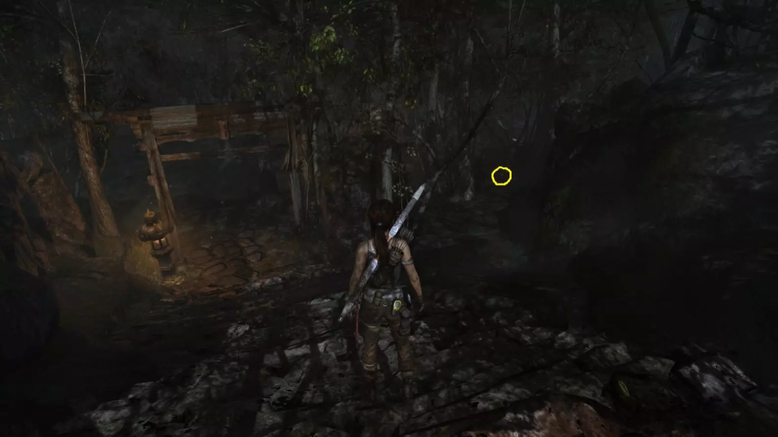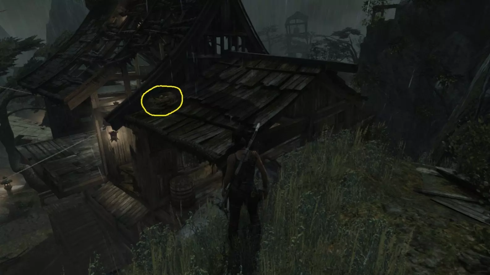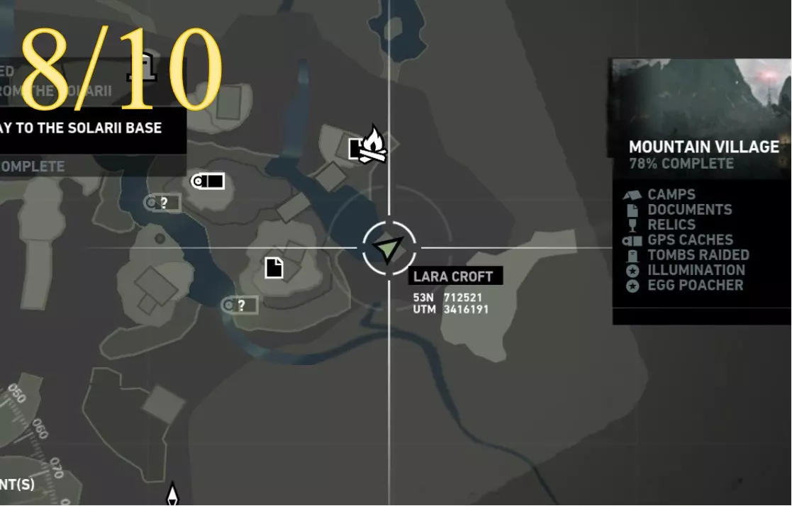 重要提示: 如果在劳拉初次探索该区域后需要返回第8或第9座雕像处,你将不得不长途跋涉才能再次到达那里。你无法从村庄高地营地出发,穿过营地东北方向的孤立木制建筑来回溯路线,因为劳拉无法跳跃或用绳箭回到第9座雕像所在的稍高位置。相反,你需要从村庄高地或村庄远眺营地出发,返回第7座雕像处,然后从那里继续向下移动(使用跳跃和绳索),直到回到靠近第8座雕像的山地下降日间营地,之后再前往第9座雕像。 截图A - 照明 8/10
