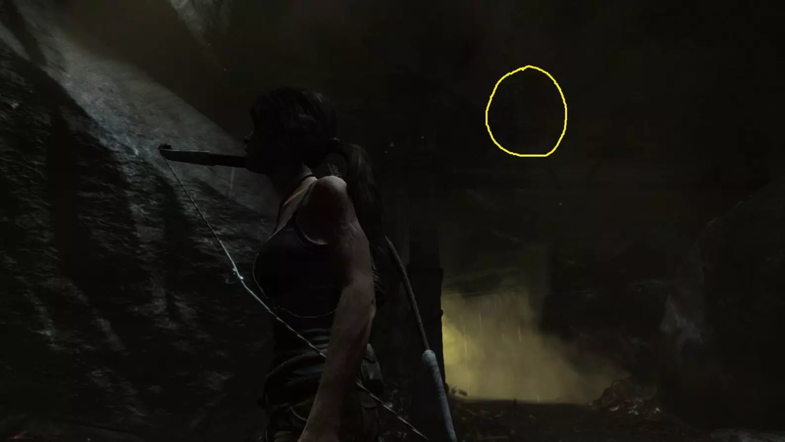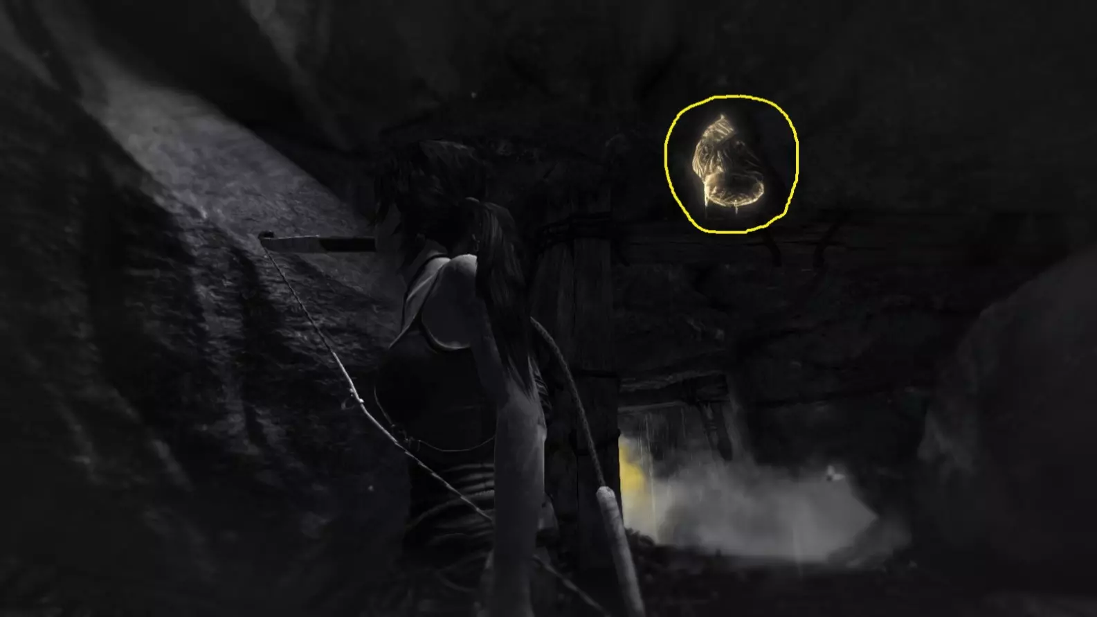 左侧是秘密墓穴的入口,右侧是副驾驶留下的蓝色烟雾,在劳拉的左方可以看到第6/10座雕像。她必须通过绳索下降到该位置。截图B - 光照6/10