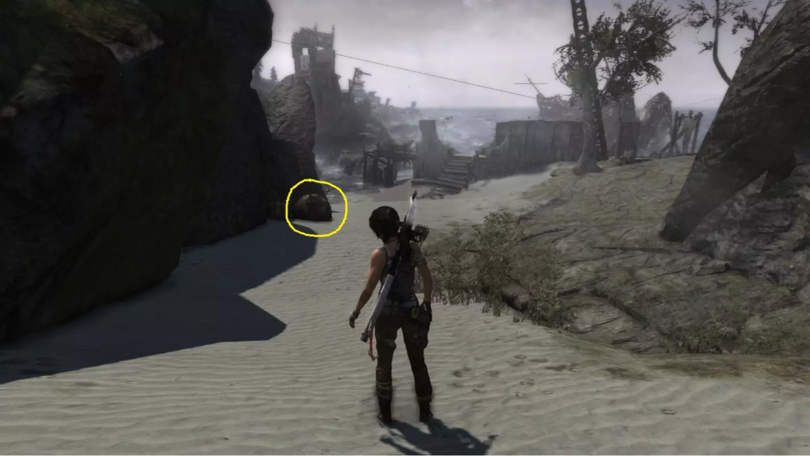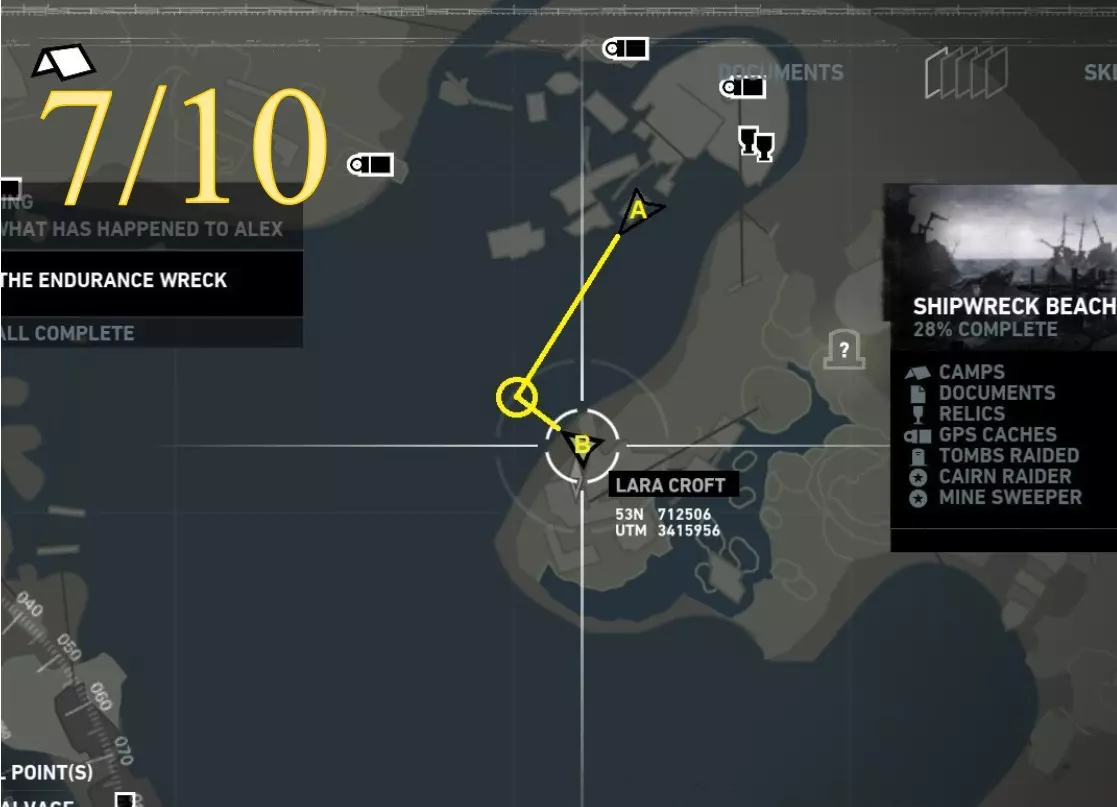 劳拉在地图上的A点视角,正透过岩石的开口望向海平面。使用生存本能模式(Q键)可以更清晰地看到目标。(从B位置射击。) 截图B - 扫雷者 8/10
