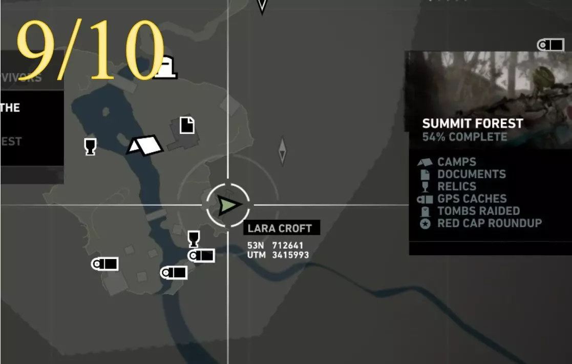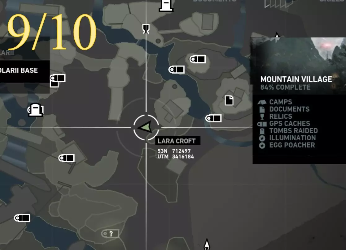 重要提示: 如果在劳拉初次探索该区域后,你需要返回第8或第9座雕像处,将不得不长途跋涉。你无法从村庄高地营地出发,穿过营地东北方向的孤立木制建筑来回溯路线,因为劳拉无法跳跃或用绳箭回到第9座雕像所在的稍高位置。相反,你需要从村庄高地或村庄远眺营地出发,返回第7座雕像,然后从那里继续向下移动(使用跳跃和绳索),最终回到靠近第8座雕像的山地下降日间营地,之后再前往第9座雕像。 截图A - 照明 9/10