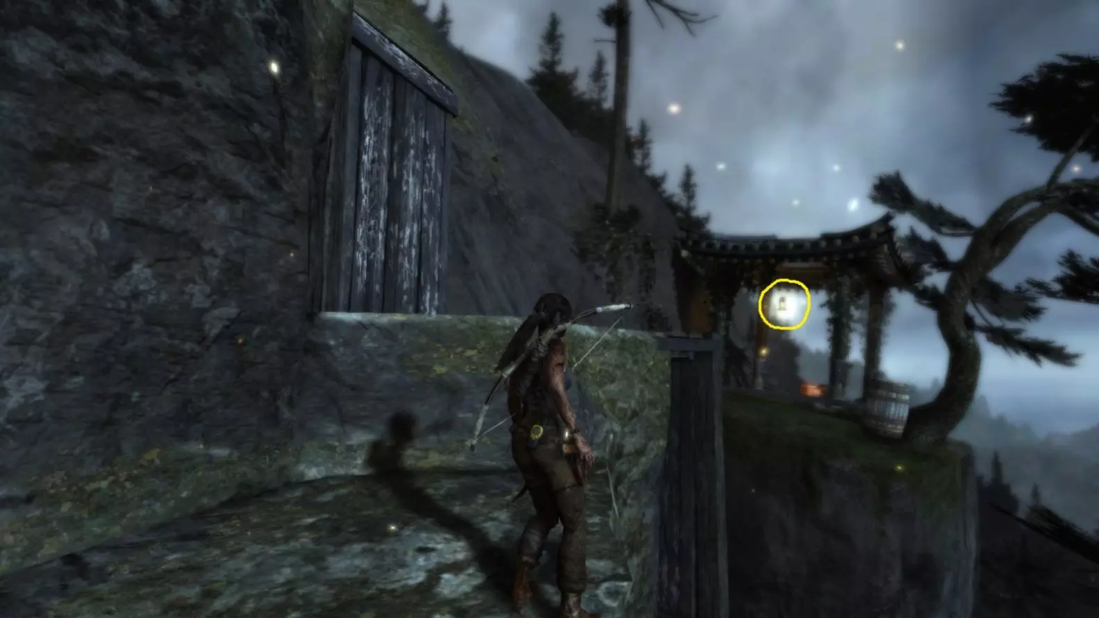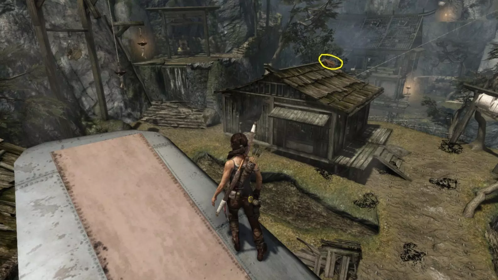 从第三个雕像(黄色小圆圈)处乘坐滑索向下。你会降落在悬崖边的一座小木屋旁,那里有第四个雕像(黄色大圆圈)。 截图B - 照明 4/10