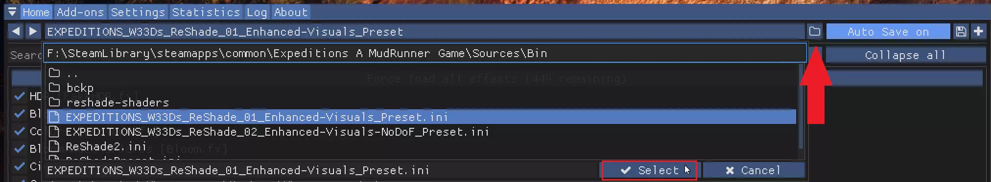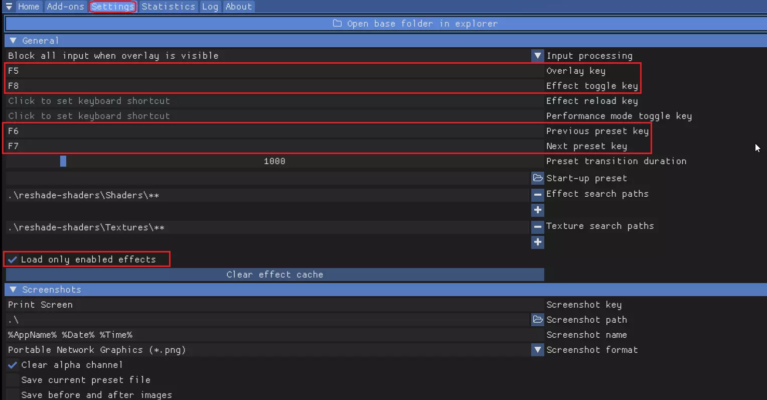 如何在游戏中设置ReShade 如果ReShade安装正确,每次启动游戏时,屏幕左上角会显示一条简短通知(如果启用了ultra预设,还会出现一些视觉效果)。 步骤 1. 在游戏中按【HOME】或【POS1】键启用/禁用ReShade覆盖层 2. 完成ReShade的简短介绍教程,或者 2.1 跳过教程,进入【设置】选项卡,按照截图所示进行各项设置 2.2 完成上述设置后,你可以使用F5-F8键轻松控制所有功能 2.3 推荐:勾选【仅加载已启用的效果】,以加快加载速度 (请不要在游戏启动时所有效果至少成功加载一次之前执行2.3步骤!)