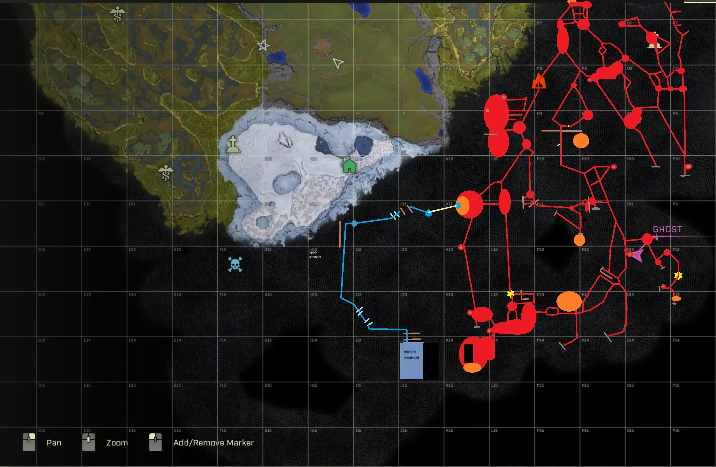 全虚空 sector 地图(阿什兰区域) 99%的路径和大部分洞穴已包含在地图中。 如果发现任何未标记的洞穴,欢迎评论告知。 虚空 sector:地图 规则1:请勿嘲笑 阿什兰区域应包含所有路径。 如果有人评论洞穴位置,可以添加更多洞穴地点。 冰原确实只是一片“平原”,没什么值得绘制地图的。 冰原中的一些洞穴相当特别,部分洞穴入口被冰而非石头堵塞。 G13、G14、H13、H14区域的隧道相互连接,探索起来极其复杂。该隧道至少有4个出口和多个洞穴,部分隧道区域没有负面效果。绿色=无洞穴蠕虫且安全的洞穴 灰色=无熔岩的洞穴 红色=存在熔岩+深坑危险 橙色=需要斜坡才能探索的熔岩洞穴 黄色=有熔岩的洞穴 粉色=多层洞穴,需要斜坡 蓝色=冰湖洞穴 紫色=有多层结构的凉爽冰洞穴 白色=超大洞穴 镐图标=非地面层洞穴/需要额外地砖才能到达 太阳图标=隧道 鸡腿=洞穴扫描仪显示存在洞穴,但我无法找到它