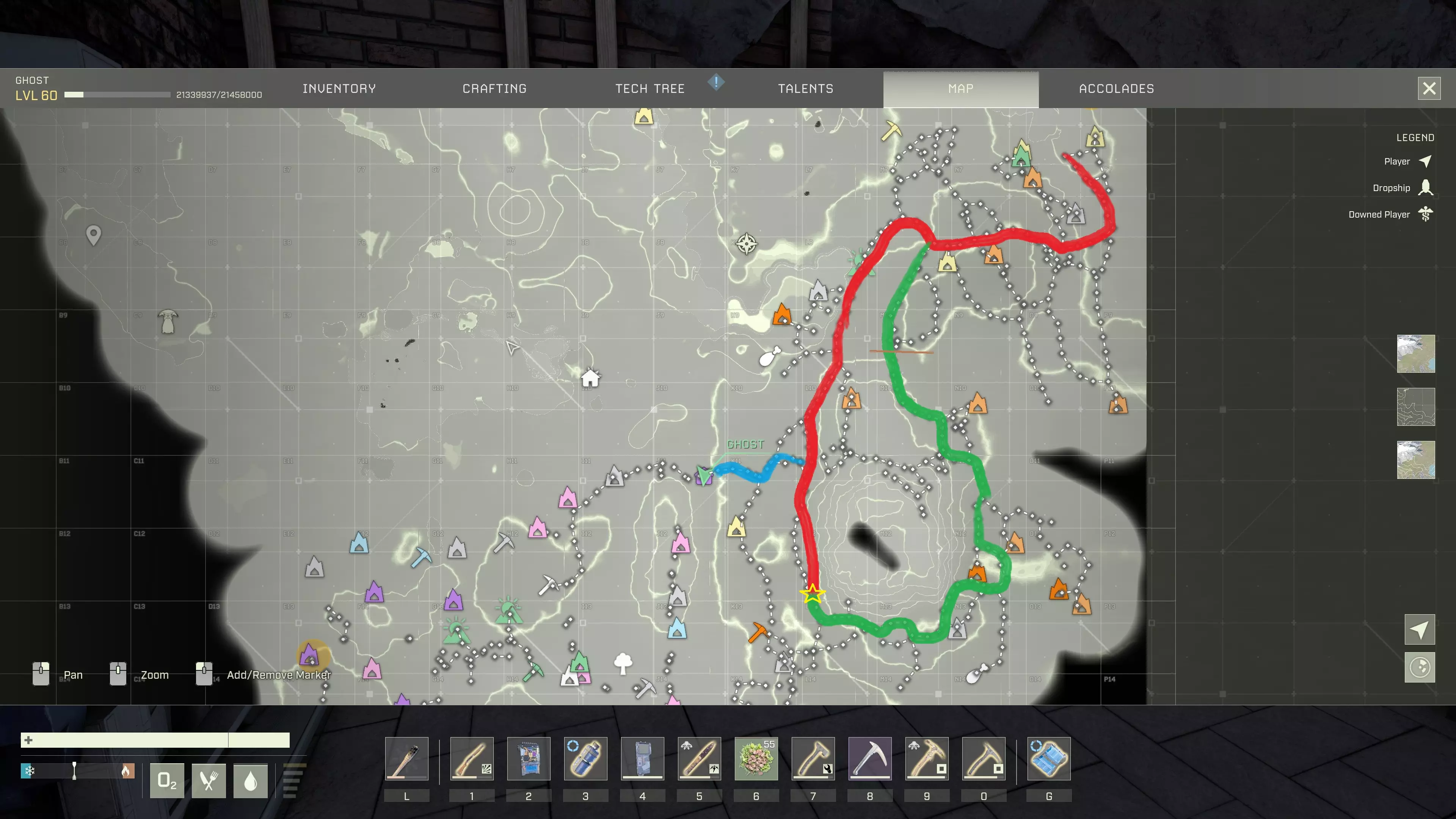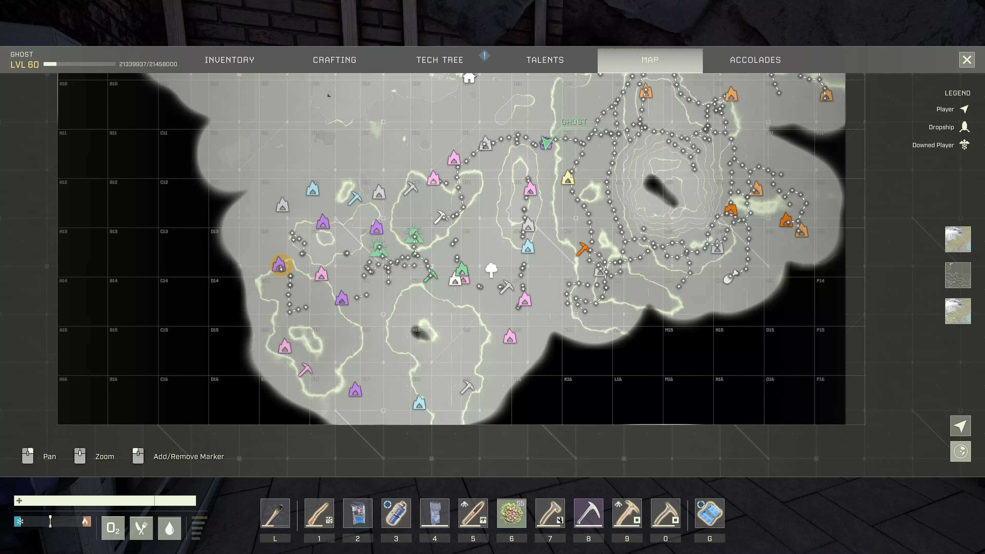 Thanks paint.exe for this map. Dont forget a like if this map helps. Null sector basics Skip to map part if you just want the MAP and mission guide , first part was trash talk How to get there The legit entrance of Null sector is at cave in grid O6 You need to go to lava biome 1.0 first with 1. cave tunnel at I4 all the way to I3 2. cave tunnel at L3 to K3 in swamp biome. 3. canyon at bottom right grid at L3. 4. canyon at Top right at L6 Then you need to go to lava biome 1.0 then lava biome 2.0 via the only cave in top left corner of M2. You can find interactive map quite easy so wont go details on that. Of course you can build until OOB as well to null sector. Limitation of null sector and how to counter it Null sector divide into 4 biome and each of them got wide area debuff for character and mounts as well. Ashland (+500% water consumption) Icesheet (+50% food consumption and reduced movement speed) Middle Icesheet (+50% food consumption) Upper Icesheet (+50% food consumption ) In addition, the deep freeze will NOT produce ice AND you can't use any orbital uplink tech (OEI) and you can't call dropship with the beacon. There are no water,oxide vowel, tree and fibre in null sector. How to survive in null sector for short period of time reference shopping list: Water 15L(3x Thermos/canteen) aluminum ramp x40 aluminum floor x20 concrete floor x20 concrete ramp x20 1x1 concrete shelter (if you know what i am talking about, dmm dev about dirt bug fix again) bedsheet non-wood hammer any pickaxe (of course Inaris "Neves" Pickaxe (-50% Over-Encumbrance Penalty) will be the best) campfire (of course workshop campfire is the best) 10 coal for campfire knife bow &arrow OR shotgun& ammo (100 is enough , you will try to avoid combat ) dried food x20 (reduce food consumption) Some health pots. concrete armour torch i will choose concrete armour over obsidian armour since it gives better cold debuff and u can counter most of the ashland night and icesheet with torch or/and hot drink. And most importantly a mount (BIRD), you can run with bird without water. Additional shopping list if you decided to build a base in null sector to avoid going back and forth from your distant base to null sector. Which is extremely useful when u decided to finish all null sector in openworld 3x3 concrete building 300x wood log water pipe tool electric wire tool miasma pickaxe Electric Masonry Bench (which can make concrete mix and any good building deployable) Electrolytic Oxygen Synthesizer Electric Water Purifier Rain reservoir Organic Residue Cleanser deep ore scanner(workshop version one for scanning frozen log node) ice borer portable biofuel tank(150L version) x1 biofuel tank (10L version) x1 Electric Dehumidifier Heavy Heater Material Processor electric furnace Solar Panel x2 Advanced Battery Rack x4 CONT4CT Device with all upgrade Orbital Exchange Interface+ranching station (place it at entrance of null sector in case ur mount disappear due to bug) With those item you can explore cave and build rest of the deployable in the cave later. best base location would be (at K11 cave between ashland and icesheet) Although there are so many limitation , you can stay in there forever if u are well-prepare. -You can get ice from icesheet by using Rain reservoir which will fill up when snow weather comes, combine it with Electric Water Purifier , you can always shovel for ice in icesheet as well. -Get oxygen by using Electrolytic Oxygen Synthesizer ,if you want to get oxide ore directly, there is always deep vein in the caves. -Obtain wood by using ice borer on frozen log deep vein in icesheet and smelt them with furance. -Obtain fibre by crafting ropes with leather and destroy them You can even build a "greenhouse" and farm fibre or wheats urself. Ref: 1. water. 15L of water is more than enough to survive for a mission with map. Closest water source near null sector was lake in O3 grid, which highly toxic and require purifier. Portable water tank(150L): use heavy G slot has glitch currently (march2025), you canNOT drink with it in inventory unless u deploy on the floor and it will always give RAIN water no matter what you fill with Water tank(50L) : use heavy G slot, probably the best container for hot drinks which work pretty well in icesheet. 2. Milliions of building deployable(mainly ramps) You need those to counter the terrain in null sector. Aluminium : light weight, cheap, and relatively resistant. (use for temp explore or in caves) clay, scoria : stay pretty long time, downside is quite heavy. concrete: you want those if you want ur bridge/ladder become perm. definitely use those on major route (across the lava lake at K11 cave between ashland and icesheet) Null sector : Ashland This mission divide into 3 parts 1. Craft 100 trail beacon, and beacon tool (not sure if this is skippable) 2. deploy beacon to find the outpost (quite sure this is skippable as you can finish it by directly rush to star at Top of L13) 3. locate the evidence Recommend method to finish the quest: craft a beacon tool, mount a bird, and ride it to L13 without deploying any beacon by using the map, grab a the damaged audio device and 100 beacon inside the building.