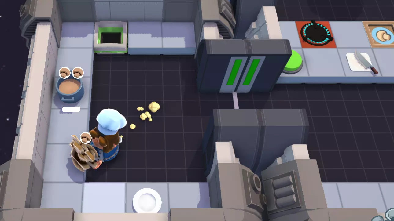 在进入从下方传来的移动机舱(内含一个空盘子和未煮的已放全部原材料的汤锅)时,需带着下一个菜单的原材料进入,且先取锅子开始炖煮,再取出盘子。 下方厨师的操作细节: 1. 进入刚移动下来的机舱时,端着盘子进入,而非空手进入; 2. 切菜时直接捧着一份未切的食材进入主机舱,切好后再捧着这份切好的食材离开主机舱,确保每次移动时手上都有物品,且无需移动汤锅。(这也是上方厨师要将汤锅放在一个容易够到的桌面位置的原因)