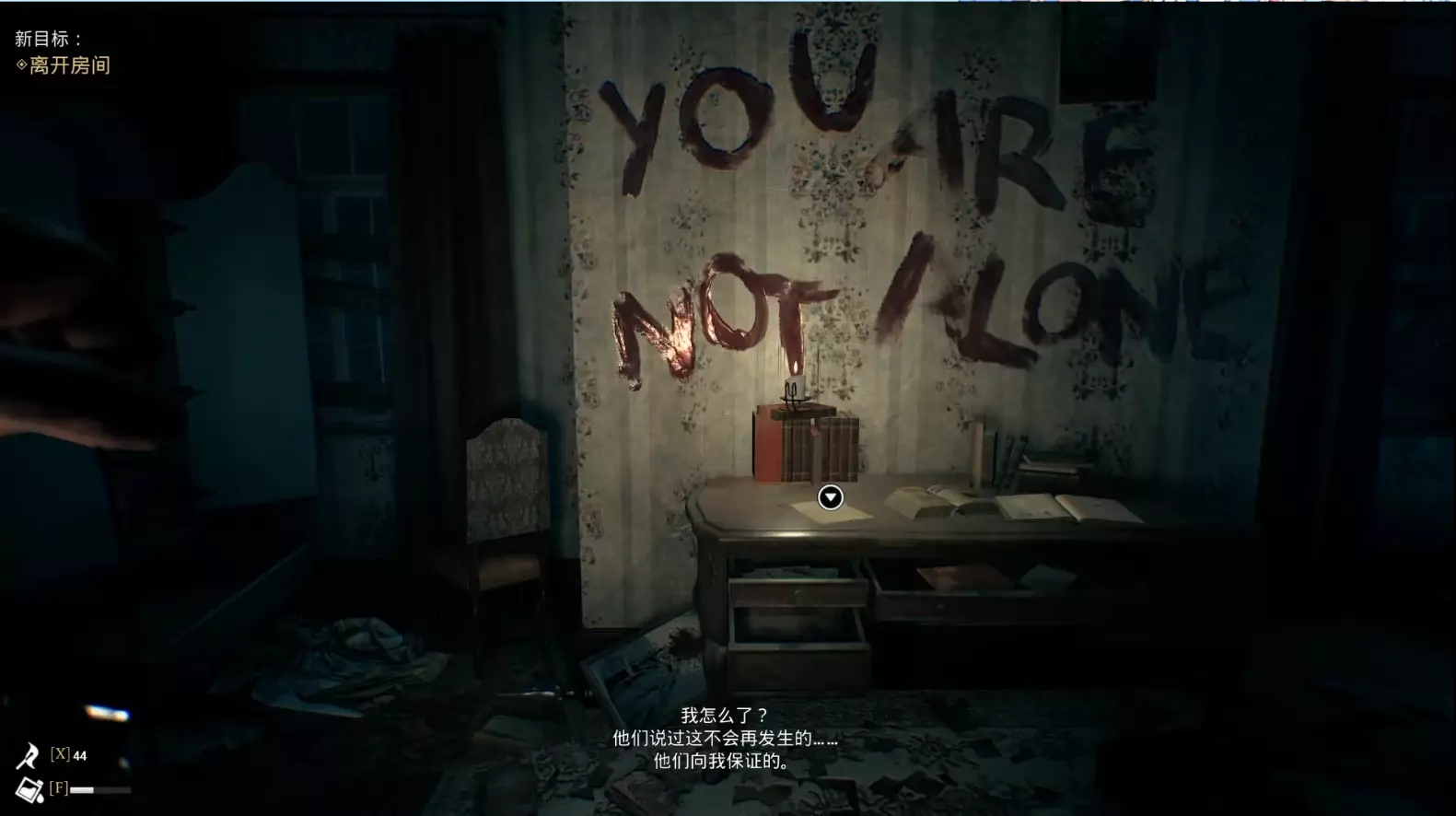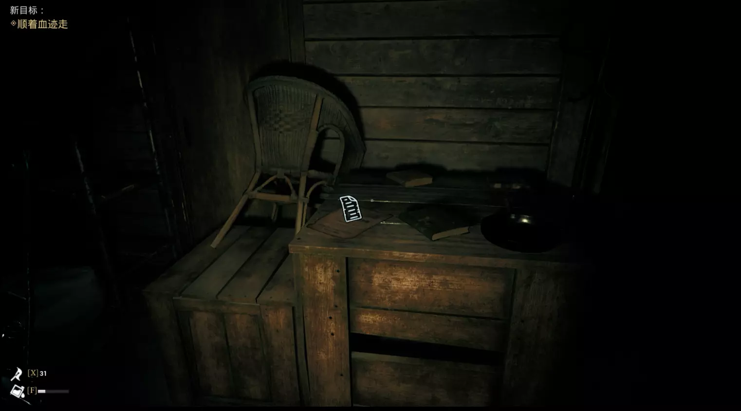继续推进剧情,开始追逐战。 在追逐战结束后,左手边柜子上可以收集到【沼泽地女人的第二张字条】。