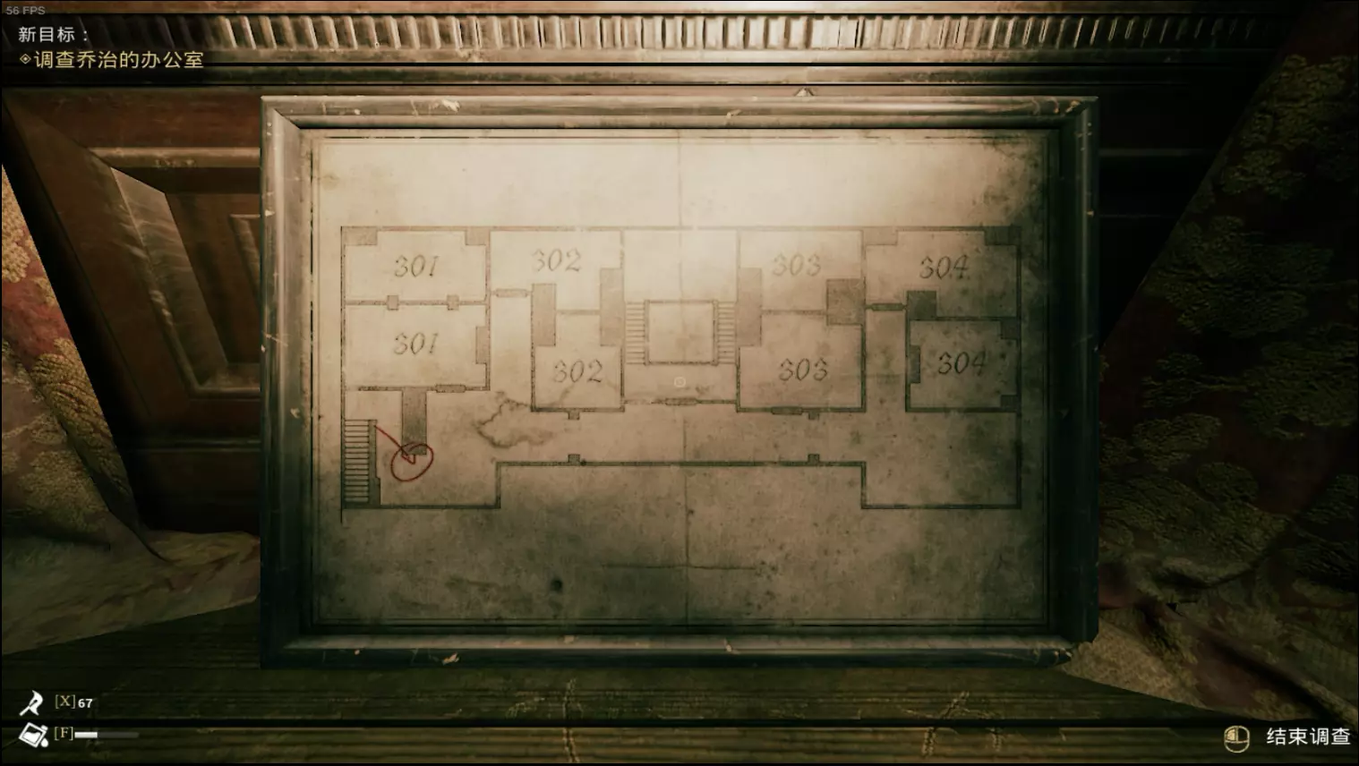 至此本章收集物品全部完成 解谜提示:找出每一页里面【不在此处】的数字,对应左图位置的孔位就是正确密码 打开保险箱并查看里面的笔记后将进入第六章,在此前请确保以上物品已收集完毕 第六章 侦探其人(地图) 补录一下地图,迷路的话可以看一下,如果正常按剧情流程走应该不太需要 一楼地图