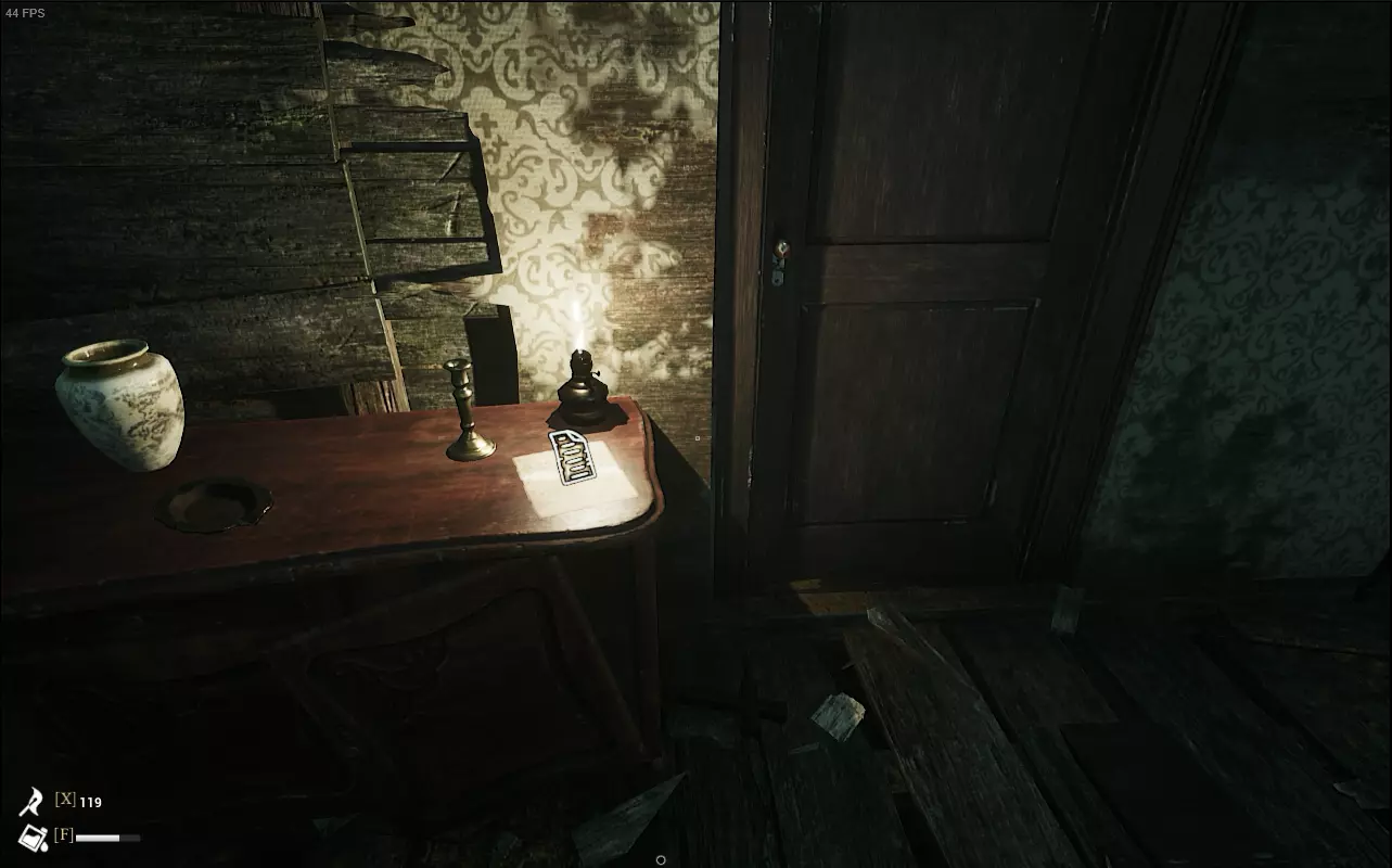 继续前进,遇到被上锁的白色门,进入右侧的小道。在小道右手边的长柜上可以收集到【沼泽地女人的第一张字条】。