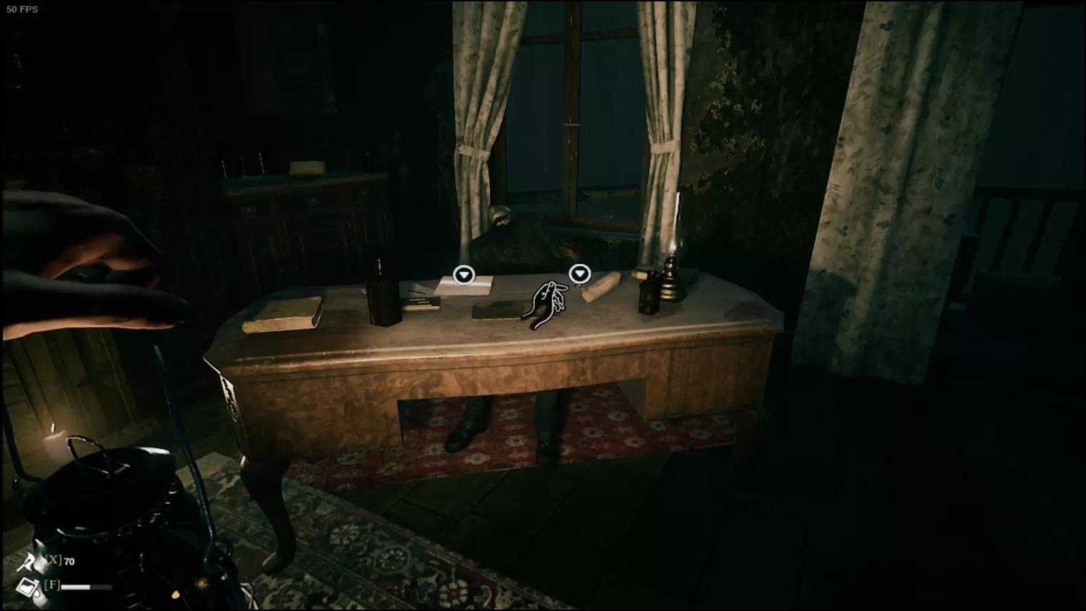 继续推进剧情,从二楼夹层跌落至一楼办公室。在办公室窗边的小桌上可以收集到【护身符】。
