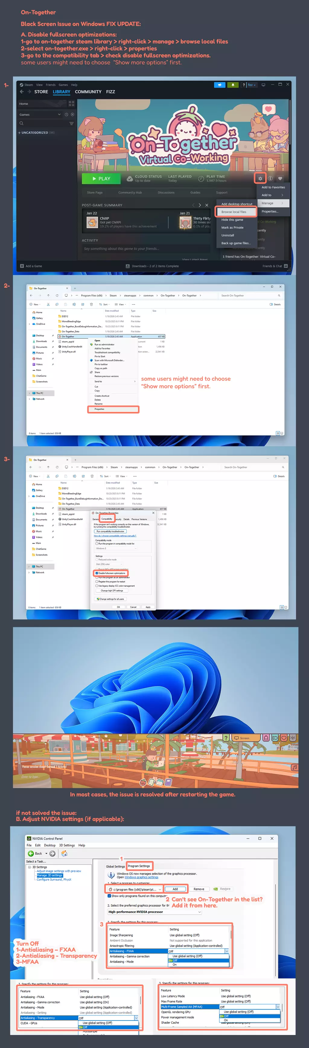 《On-Together》黑屏问题故障排除指南 本指南由开发者编写,专门用于解决桌面/贴纸模式下的黑屏问题。 黑屏/无透明度问题在部分Windows设备上可能因设备设置而出现。若遇到黑屏,请按以下步骤依次尝试: Windows黑屏问题解决步骤: A. 禁用全屏优化: 1. 打开Steam库,找到游戏,右键点击,选择管理,然后浏览本地文件。 2. 找到游戏可执行文件,右键点击,选择属性。 3. 进入兼容性选项卡,勾选禁用全屏优化。 (部分Windows 11用户可能需要先点击显示更多选项,再选择属性) 若问题未解决: B.调整NVIDIA设置(如适用): 4. 打开NVIDIA控制面板,为游戏关闭“抗锯齿 - FXAA”“抗锯齿 - 透明度”和“MFAA” 5. 重启游戏。 若未看到兼容性选项卡: 在本地文件文件夹中,右键点击on-together.exe文件名以打开正确的属性窗口。 注意:若右键点击的是项目而非文件名本身,可能会打开不同的属性窗口。若窗口显示On-Together图标且标题为On-Together.exe属性,则为正确窗口。 3. 正确打开后,进入兼容性选项卡并勾选禁用全屏优化。 这些步骤通常可解决问题并使设备兼容覆盖模式。