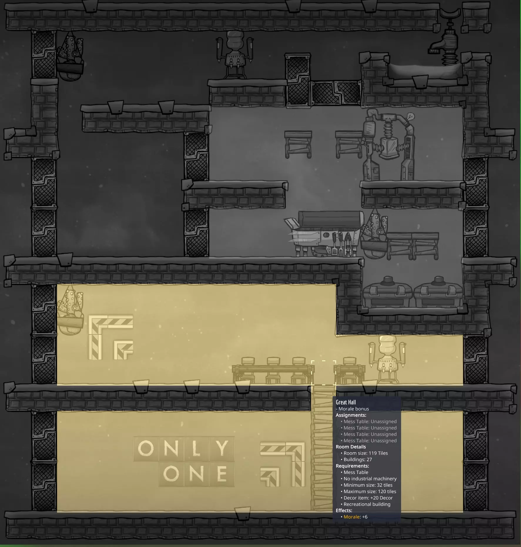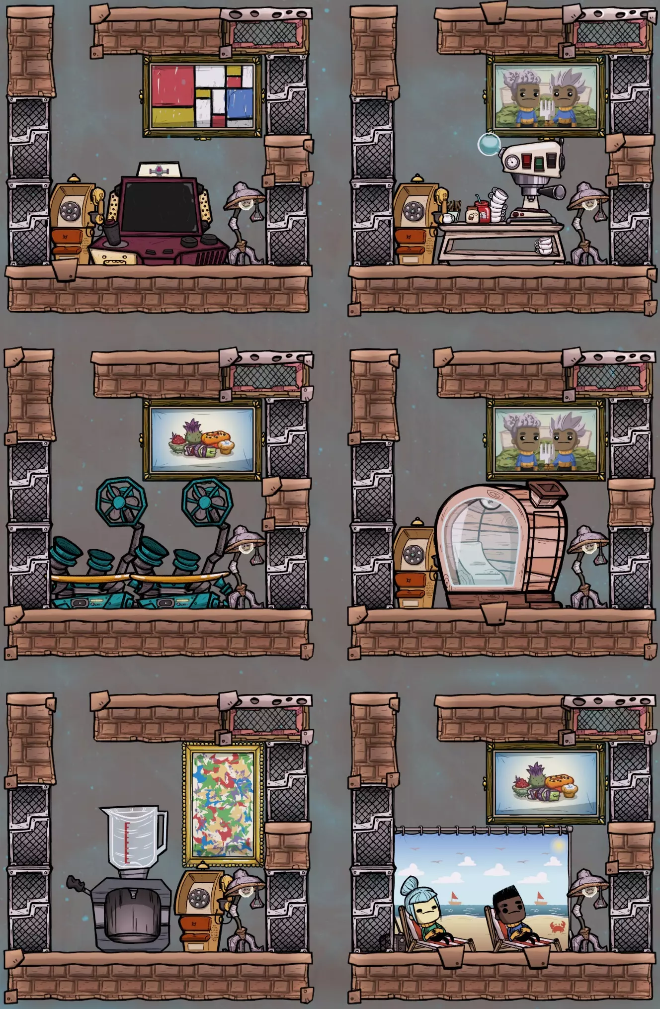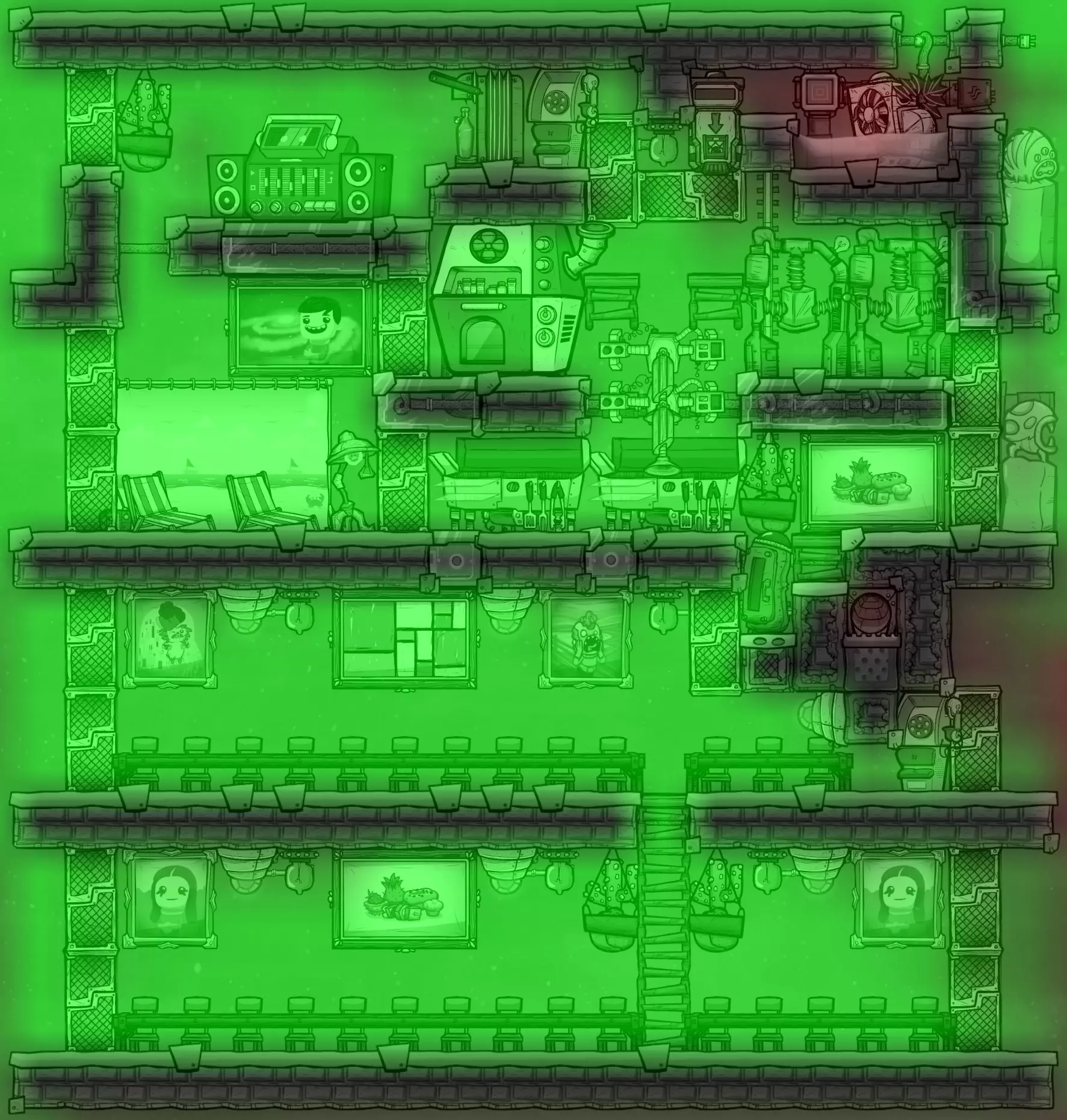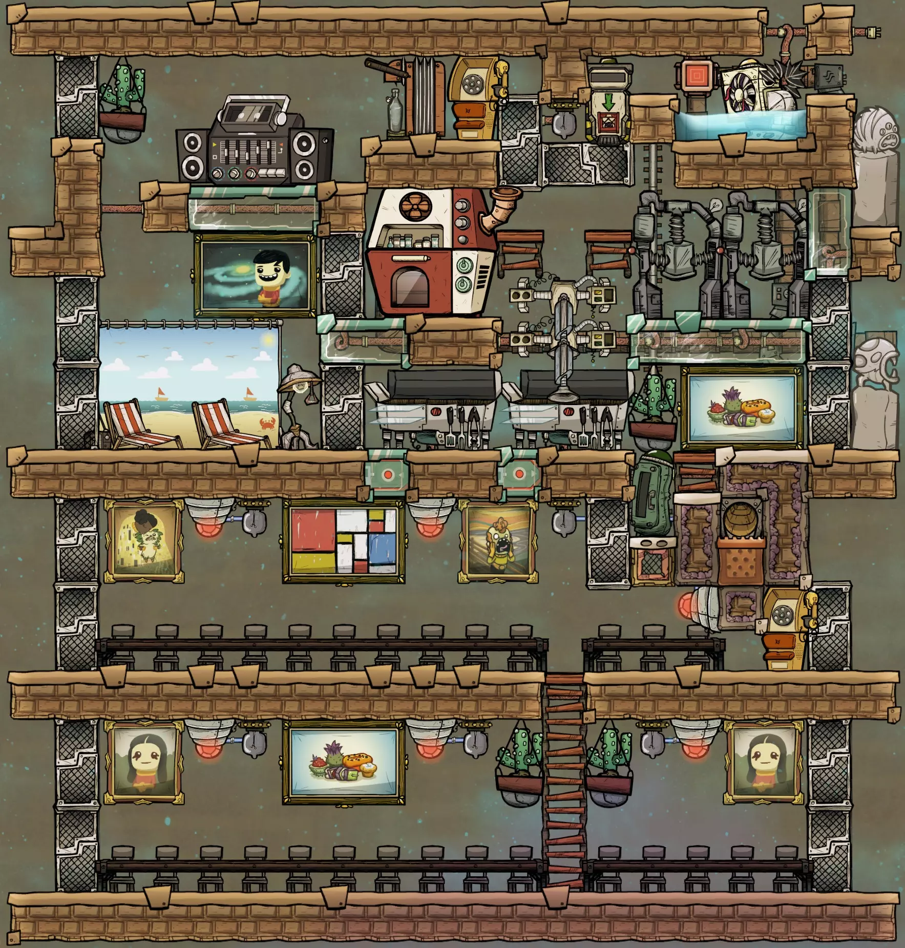 这片区域为2x3大小,可放置两把沙滩椅、两个机械冲浪板(或各一个),或者一个3x3的大型娱乐设施加一部派对电话。无论选择哪种方案,都有空间放置一幅大型画作,以提升燃气灶附近的装饰度。 装饰轰炸 除了微生物培养器正前方,很容易在三个房间内达到并超过最大士气值。将打印舱设计在娱乐室的方案会使装饰度略有降低,但仍保持较高水平。有多个区域可以选择安装窗户瓷砖,以帮助装饰效果在楼层间传播。这对于微生物培养员来说尤其方便,能让他们看到下方的物体,以及厨房外梯子通道里的雕像或其他装饰物品。 “重要内容先行”部分的截图展示了带有窗户瓷砖和装饰物品的示例布局。下方截图则显示了达到最大装饰度后的示例覆盖效果。