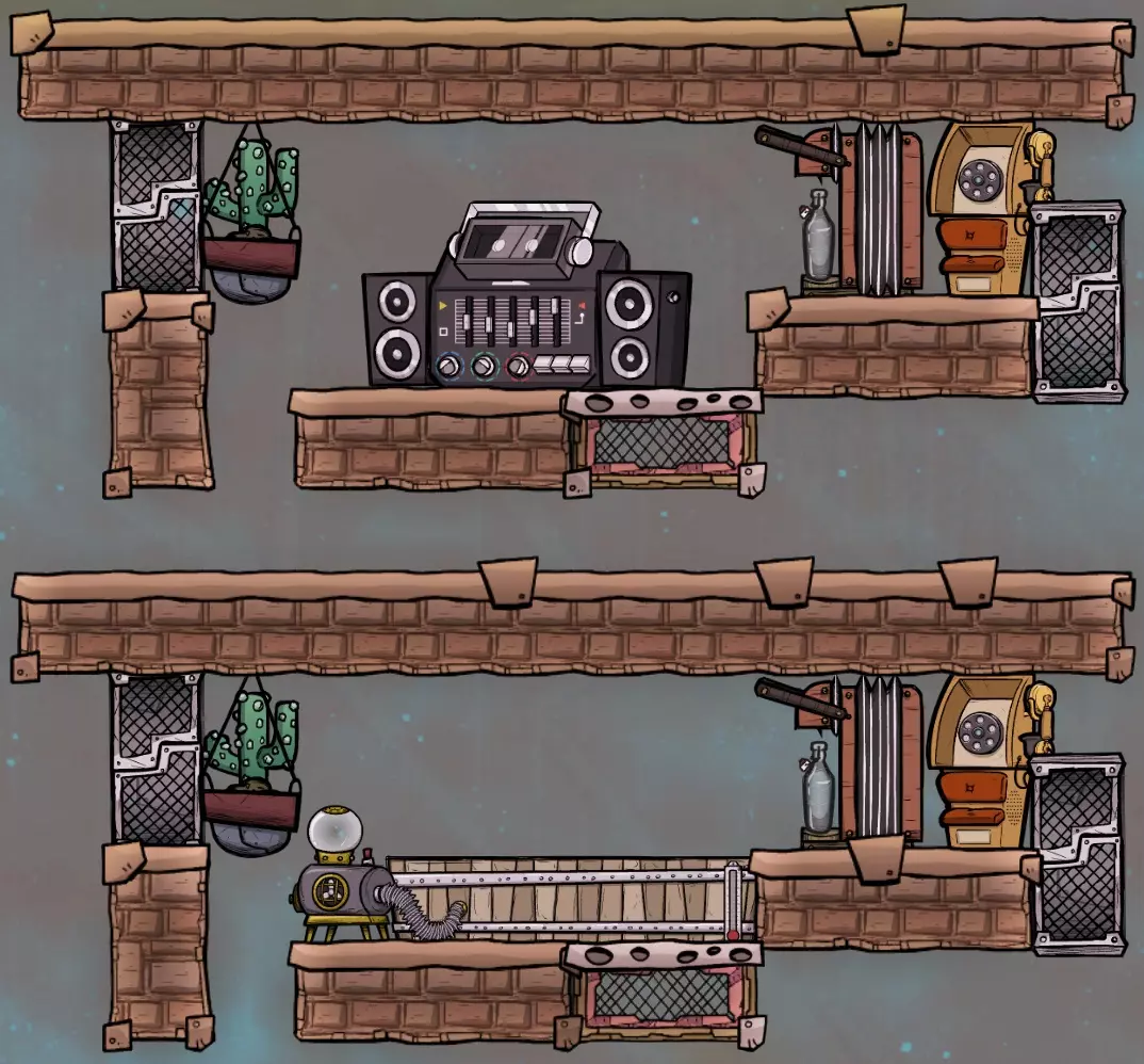 如果你在这里使用打印舱而非落地灯,会有一个区域无法被光照到,导致烧烤架无法获得“明亮工作区”增益(+15%任务完成速度)。这种情况下,顶部截图中箭头所指的地砖可以替换为窗户地砖,让上方的光线能够透过。这样一来,所有烹饪用具和餐桌都能获得充足光照并提供增益。 注意:我在发布指南后发现,如果将指示的地砖替换为窗户地砖,落地灯是完全多余的。落地灯原本的作用是照亮烧烤架最左侧的地砖,我曾以为该区域必须被照亮才能获得增益。事实证明,只需点亮中心地砖即可,就像打印舱示例中那样,使用天花板灯和窗户地砖就能实现。因此,你可能需要先安装灯具,直到找到玻璃或钻石,然后建造窗户地砖,并将灯具占用的空间重新用于放置更多装饰或其他娱乐建筑。 地砖升级 最后需要考虑的一点是,将设计中的一些基础地砖更换为其他特殊用途的地砖。战略性地放置透气地砖可以帮助二氧化碳通过房间向下扩散,但这也会降低装饰度。窗户地砖非常适合装饰,本身能增加一点装饰度,还能提供楼层间的视野,让装饰效果可以垂直传播。最后,任何电器或杂物桌下方的地毯砖都能提供缓解压力的增益效果,这在较高难度下非常有用。本指南中的一些示例截图展示了气流和窗户砖的应用。 - 娱乐室升级 在某个阶段,你可能会想要升级娱乐室,为复制人提供更多娱乐方式。这并不是特别重要,因为该房间不会直接提供士气加成,但据称它能增强复制人使用房间内设备时获得的士气提升和/或压力减轻效果。 无论是否包含打印舱,两种设计在房间上半部分都有相同的配置选项。你可以放置点唱机或热水浴缸(这是最大的娱乐建筑,尺寸为5x3),并在现有的派对专线电话旁添加一个苏打水喷泉。如果你不想要点唱机或热水浴缸,除了榨汁机外,任何其他娱乐建筑都能放进这个空间。