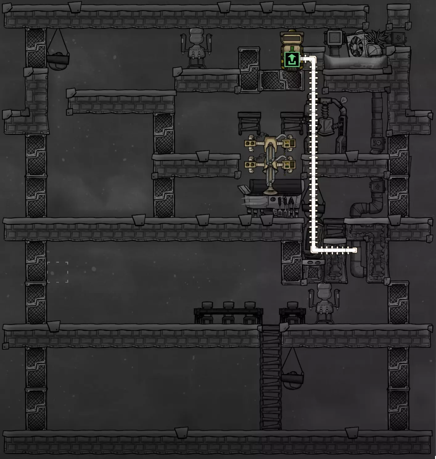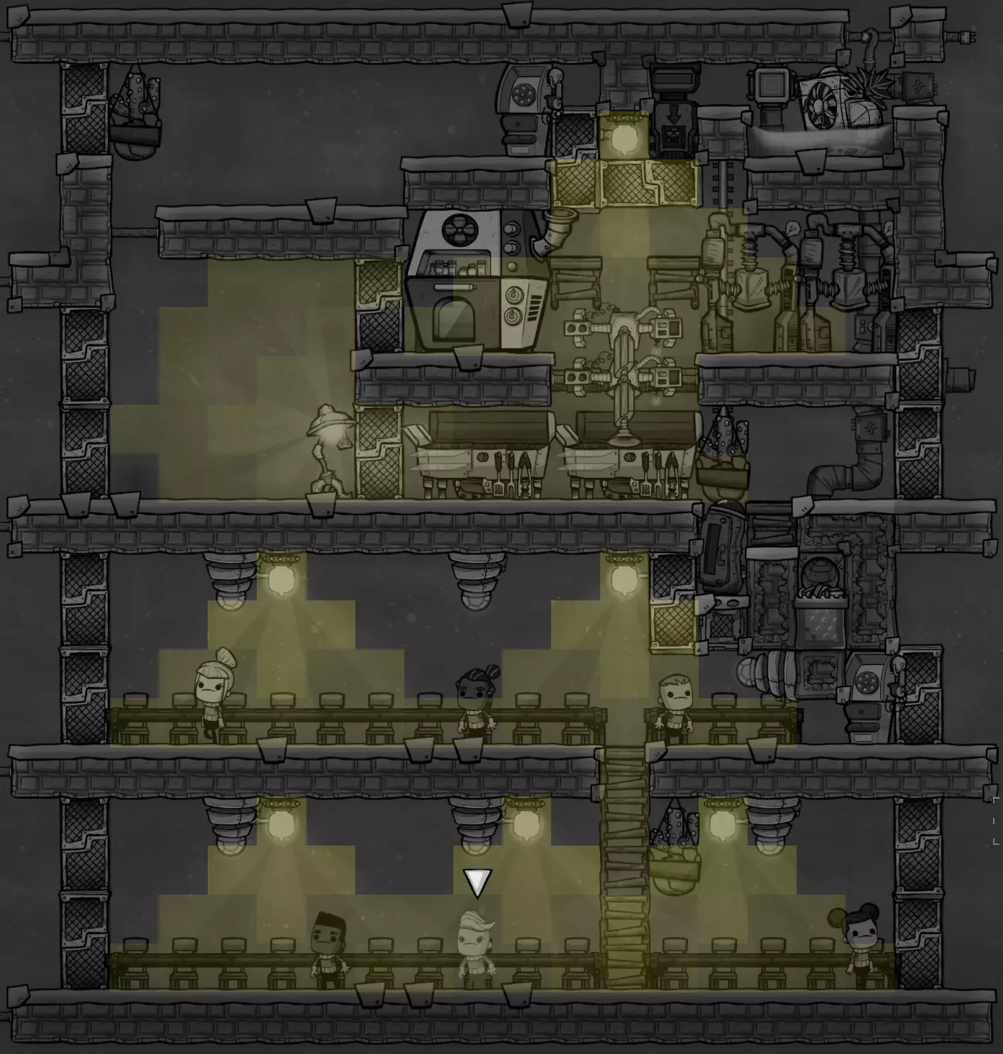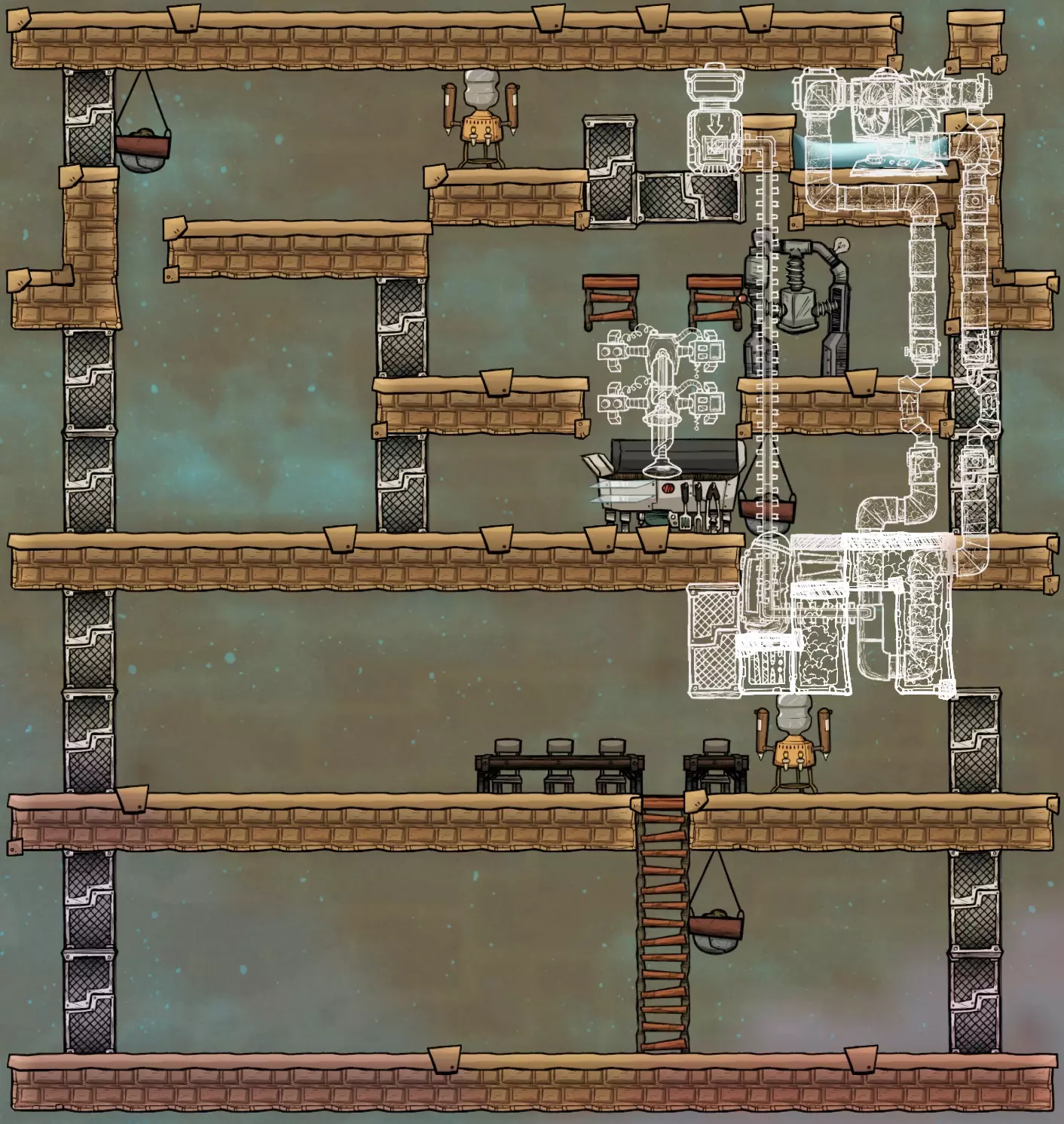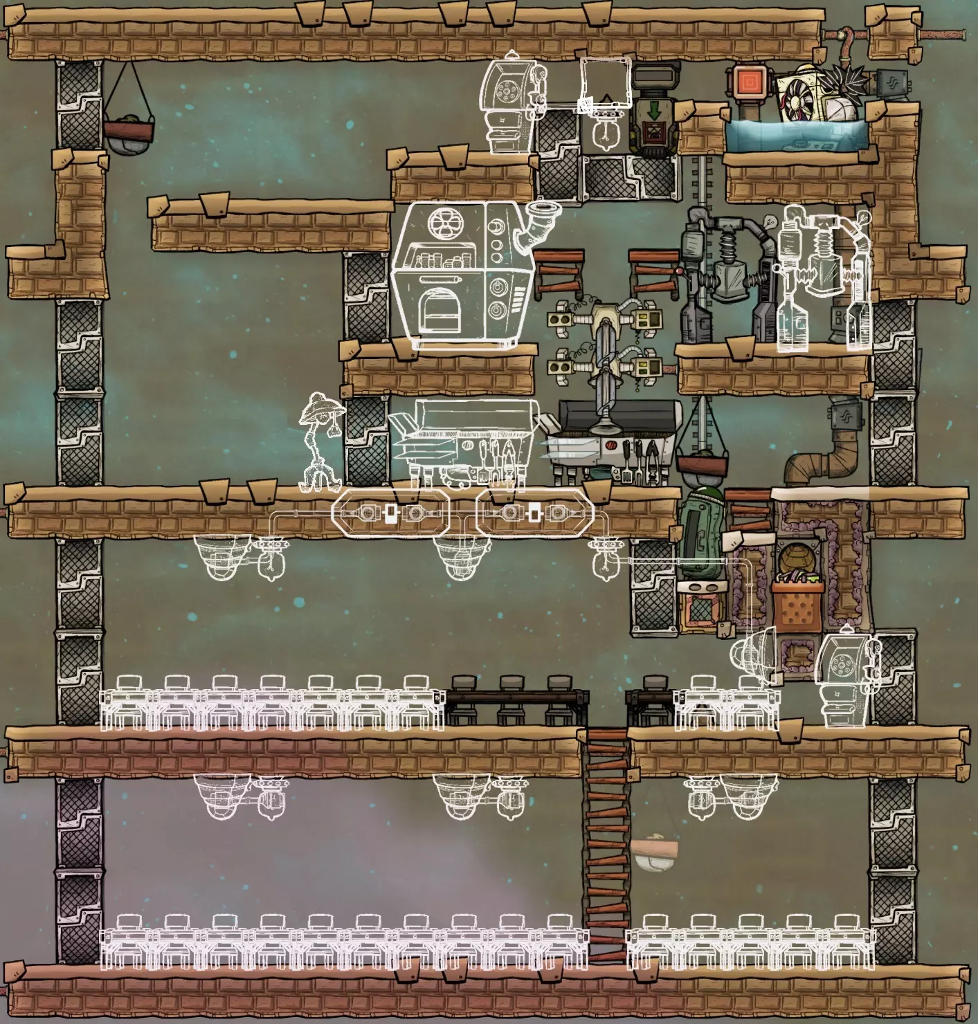 初期我们使用简易二氧化碳坑,配合配给箱来收集散落在地图各处的食物。这虽然不是最佳方案,但在能够冷冻食物之前,这是个有助于保存食物的好方法。我还假设这个结构是在游戏初期就开始建造的,所以展示了四张餐桌。当你增加新的复制人时,只需添加更多餐桌即可。 排空器应该用来排空从手动水泵接取的五瓶200千克的满瓶水(总计1000千克)。这些水会扩散到三个格子中,每个格子留下333.33千克,刚好低于会引发洪水的350千克阈值。你也可以使用污染水、盐水或浓盐水来节省普通水,因为它们的比热容和导热系数特性几乎相同。在这方面,比水变体更好的两种液体只有核废料和超冷却液,不过我猜你现阶段还无法获取这两种液体。除非你是在沼泽生物群落开局,否则我不推荐使用污染水,因为它会释放气体,但如果你能处理好污染氧,那它会是个不错的选择。如果你使用的是浓盐水(不是盐水!),你可以再倒空第6个200千克的瓶子,这样总量就是1200千克,每格400千克,刚好低于触发淹没所需的420千克。 注意,如截图所示,第三层和第四层只需要两个花盆中的一个。如果你要建造四层设计,我推荐右边的花盆,否则你只能选择左边的那个。一旦该建筑完工并在底部种植槽中种下种子,大厅就会在房间覆盖界面中启用,提供+6士气。