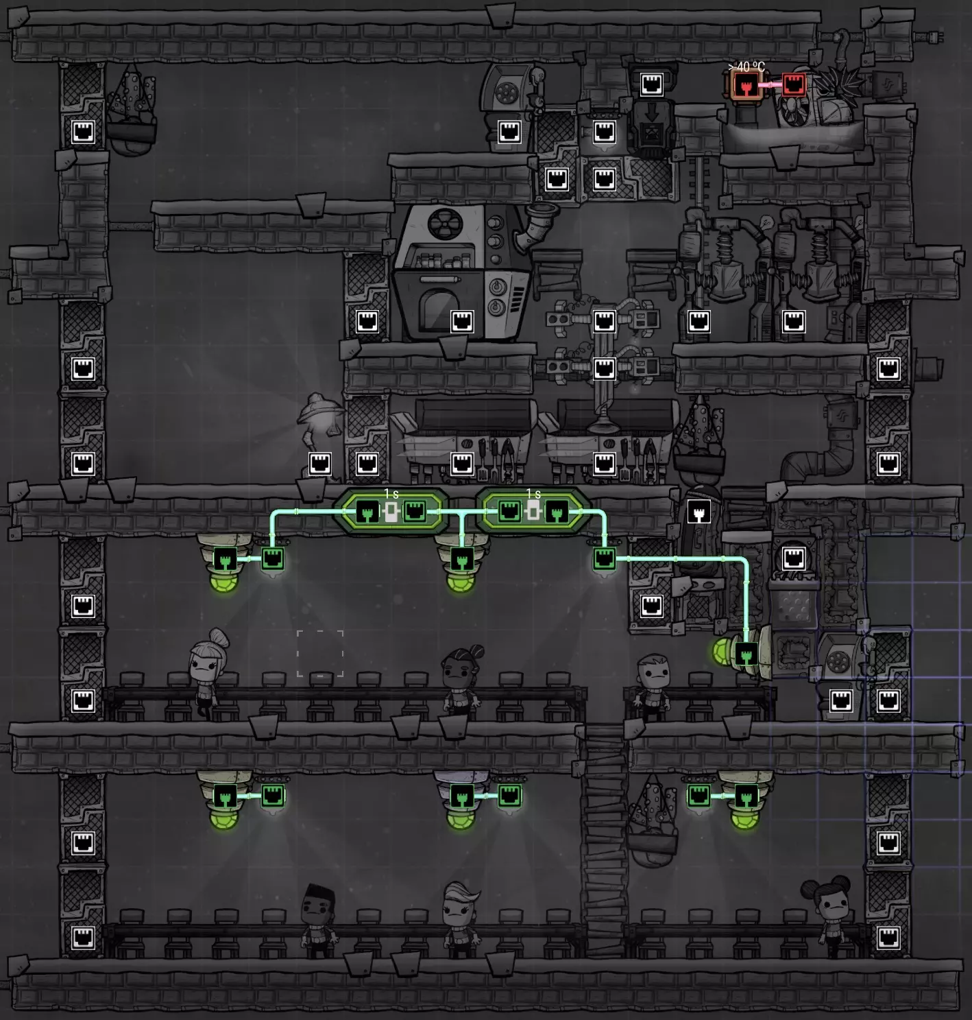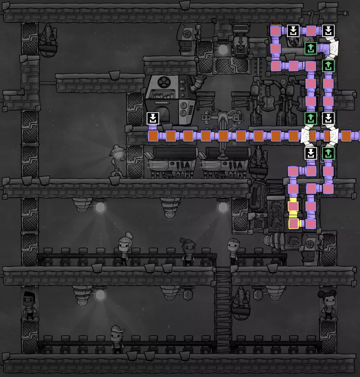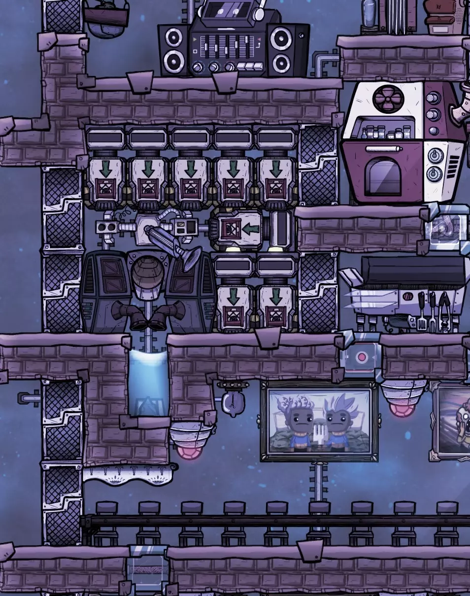 如图所示,我建议在某些时候用派对线路电话替换原来的水冷器。大多数人无论如何都会关闭水冷器以节约用水,因此虽然它们在游戏初期启用了房间覆盖效果,但提供0点士气加成。电话占用一半的空间,而且如果不给它们供电,它们提供的装饰效果和士气加成完全相同,都是0点。唯一的缺点是它们需要消耗金属矿石而不是原始矿物,因此这类似于“精炼金属”的机会成本。不过,如果你给它们供电,当两个复制人互相通话时,它们可以提供+2士气加成;如果与太空中的复制人通话,则可以提供高达+4的士气加成。 燃气灶:当你决定添加燃气灶时,为天然气添加管道系统会很容易。上方、下方和左侧有足够的空间铺设管道,如果你倾向于向右铺设,我们在冷却循环系统上设置了专门的桥梁。通过尽可能将管道隐藏在瓷砖内,我们可以将其对装饰度的负面影响降至最低。