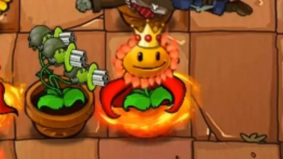 这是植物大战僵尸的“浴火三线射手”困难模式玩法展示,画面中可见向日葵女王等植物,玩家布置植物抵御不同类型僵尸的进攻,过程中获取阳光来部署更多作战植物。