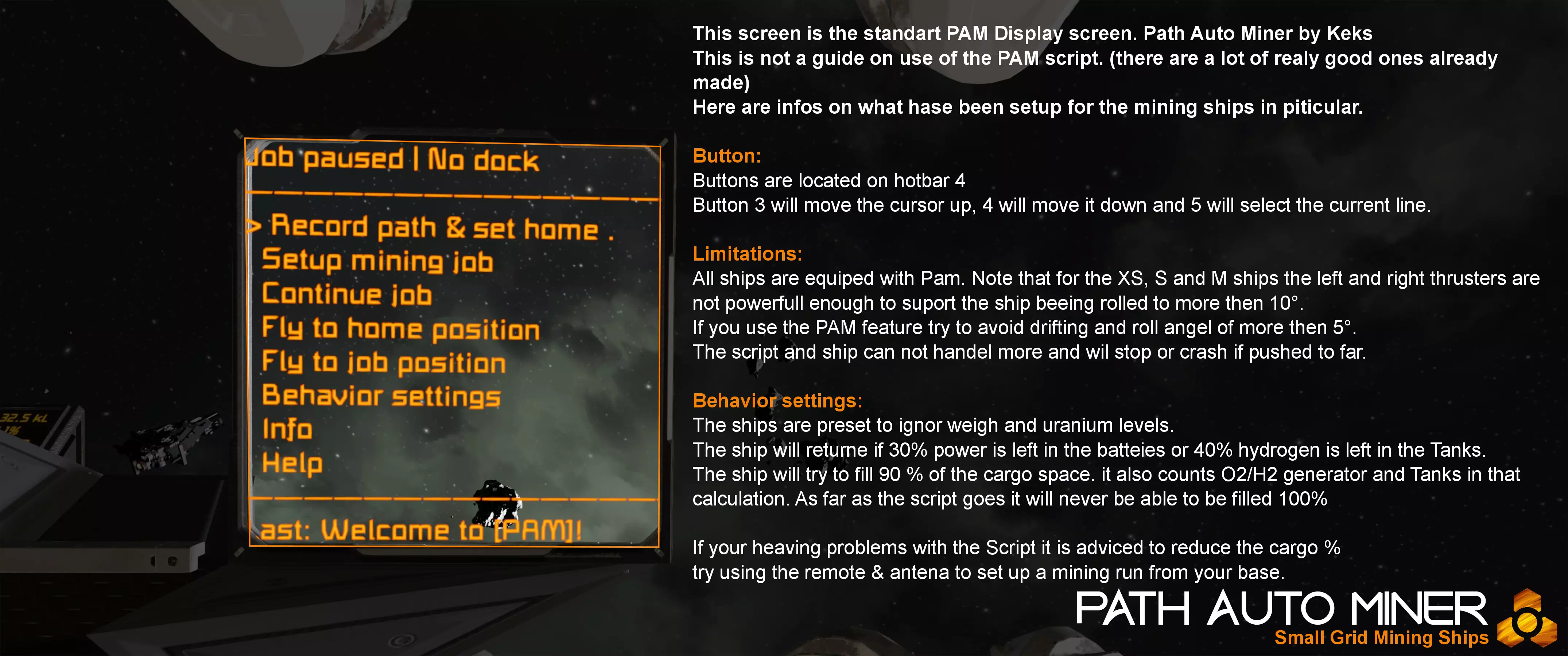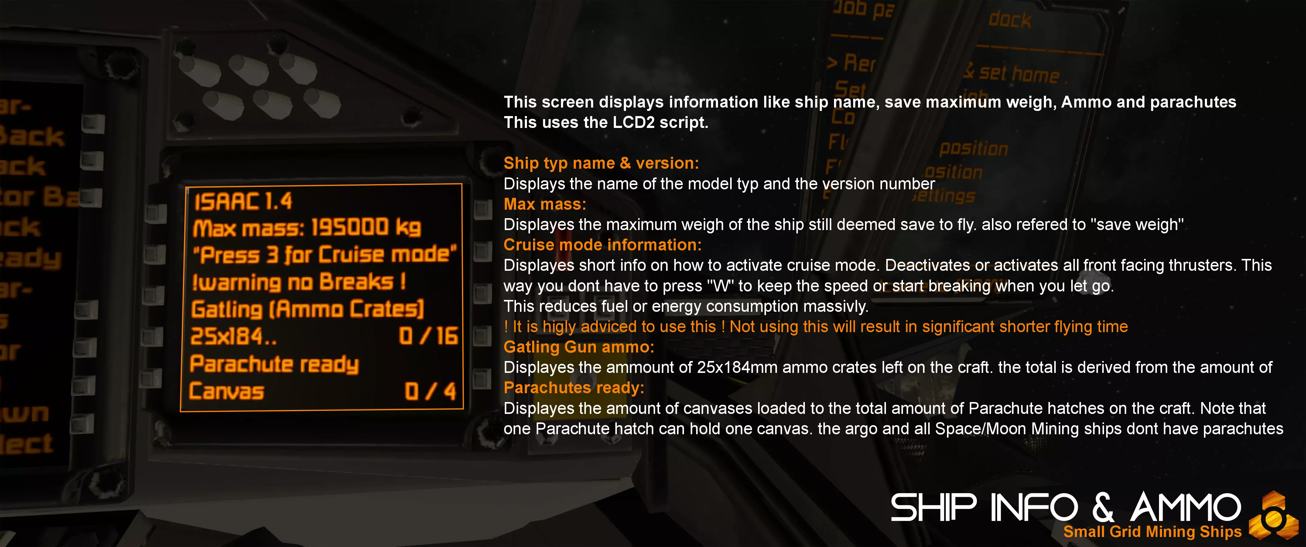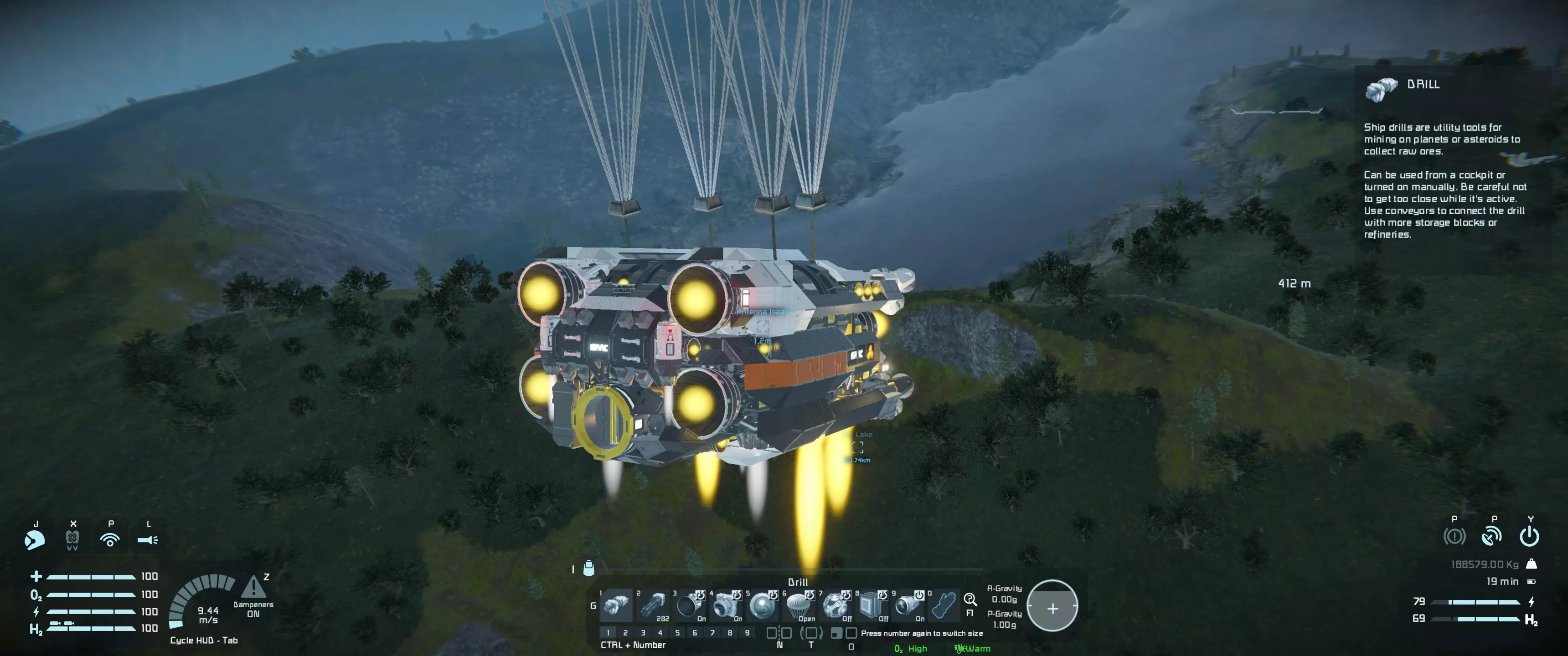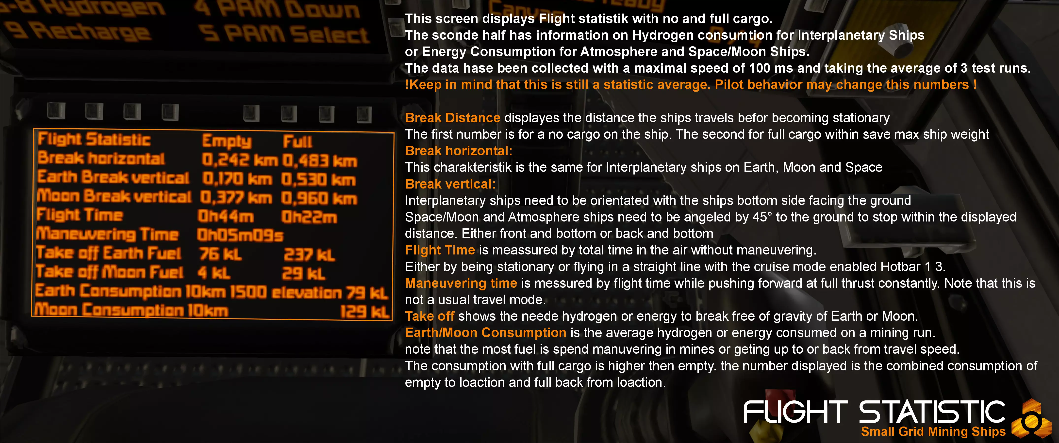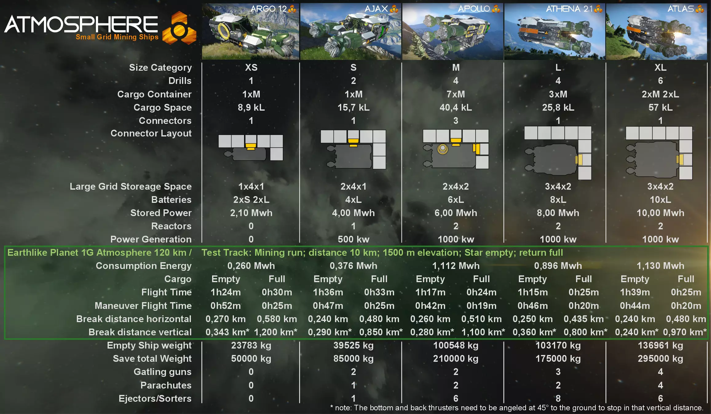 若遇紧急情况需要停车,请前往快捷栏1并按下8和9。飞船将启动所有推进器并部署降落伞。将飞船与地面或你想要停止的方向保持45°角。这样,前部和底部推进器将全部启动,以最短距离停下飞船。请注意,大气层和太空/月球采矿船的垂直制动数据已通过该功能测试。