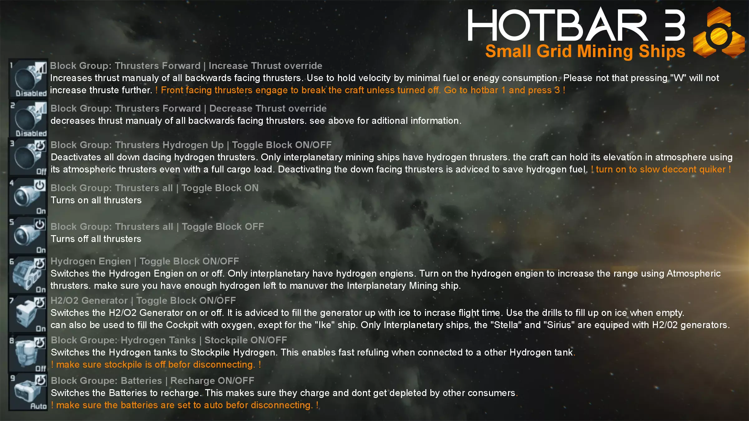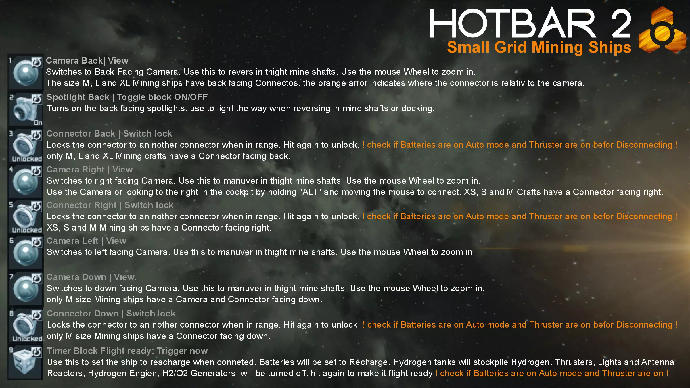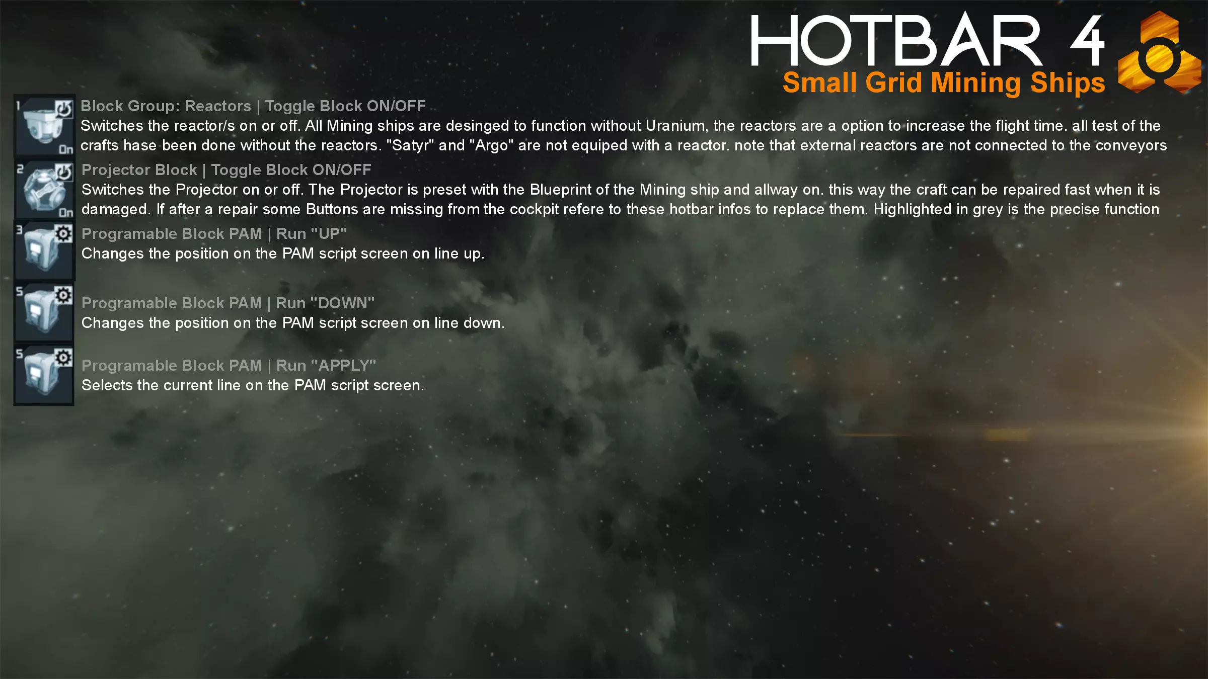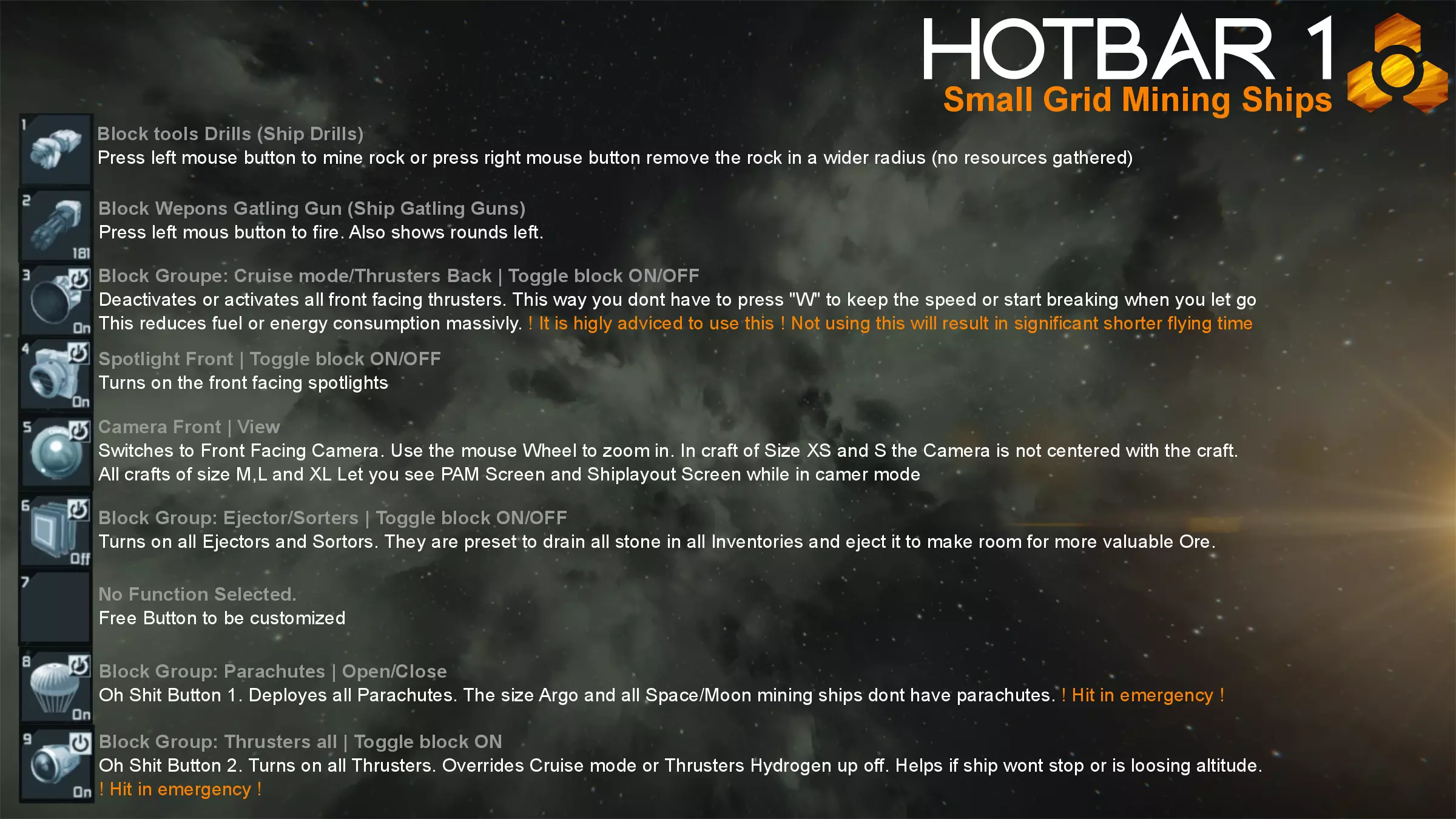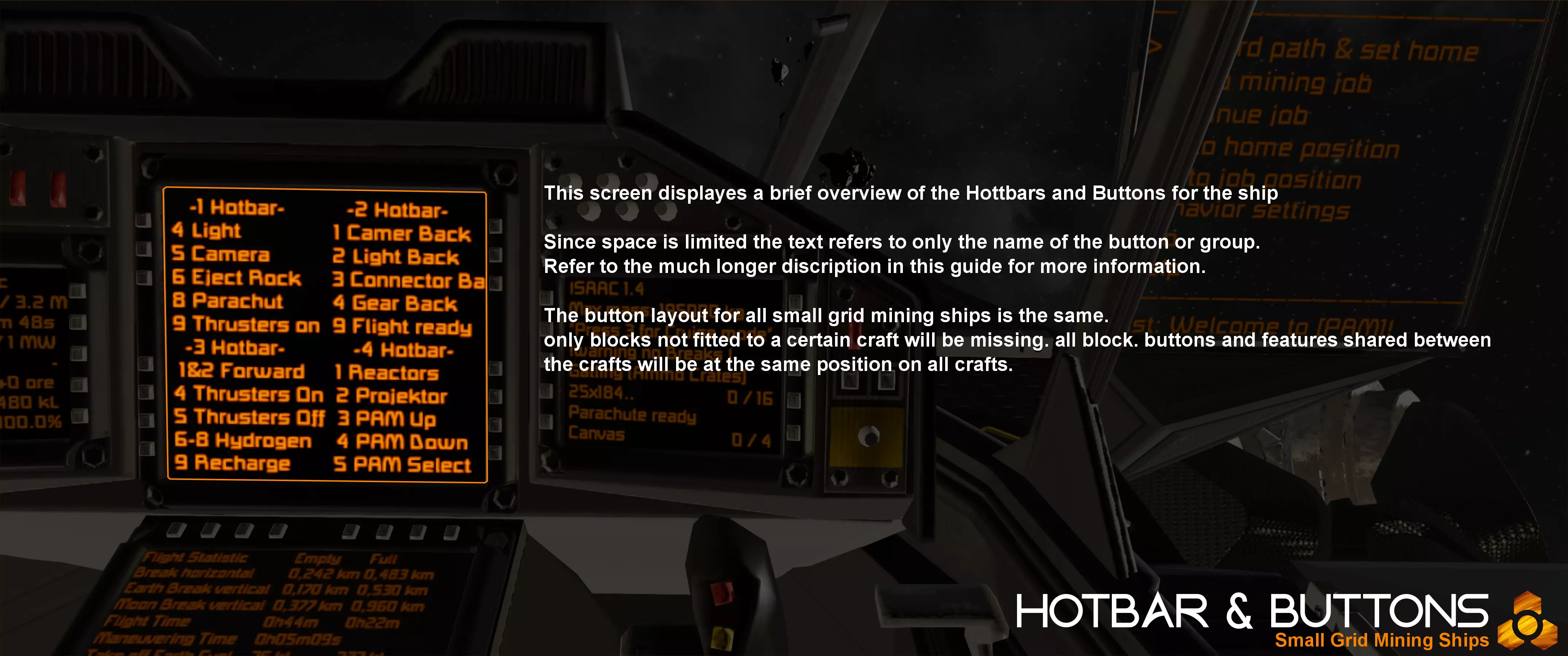 为确保所有飞船可靠且易于使用,它们已进行了数周的测试。 快捷栏/控制 DMI的小型网格采矿船设计得尽可能统一。所有飞船采用相同的按钮布局,若某艘飞船未配备某个模块或功能,相应按钮将保持空置。 飞船使用4个快捷栏: 1. 飞行操作