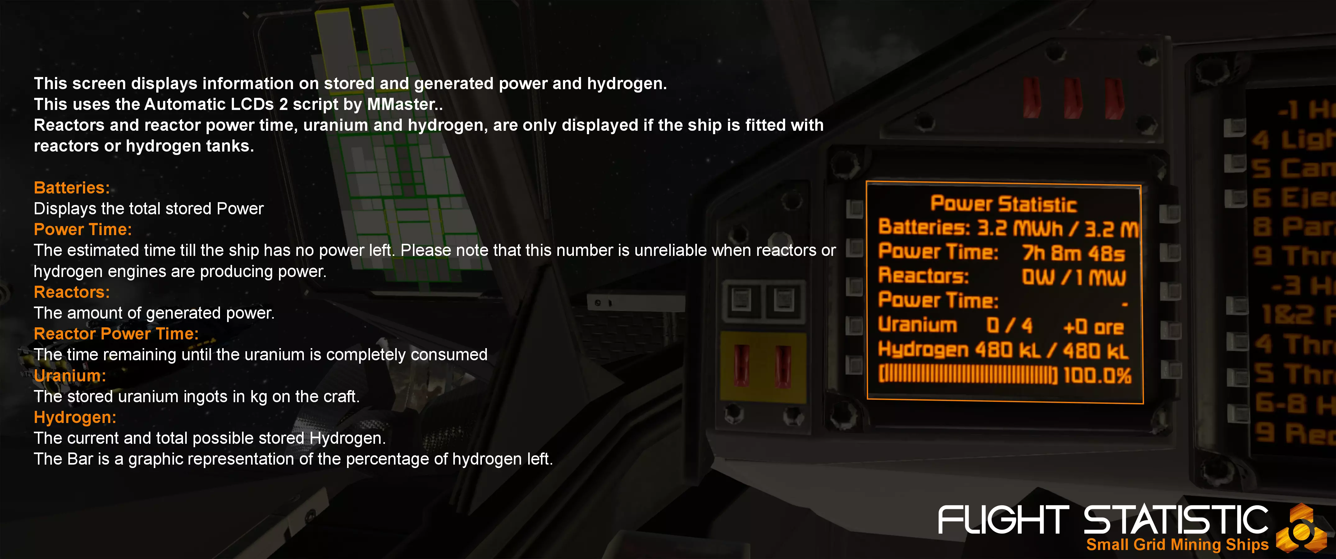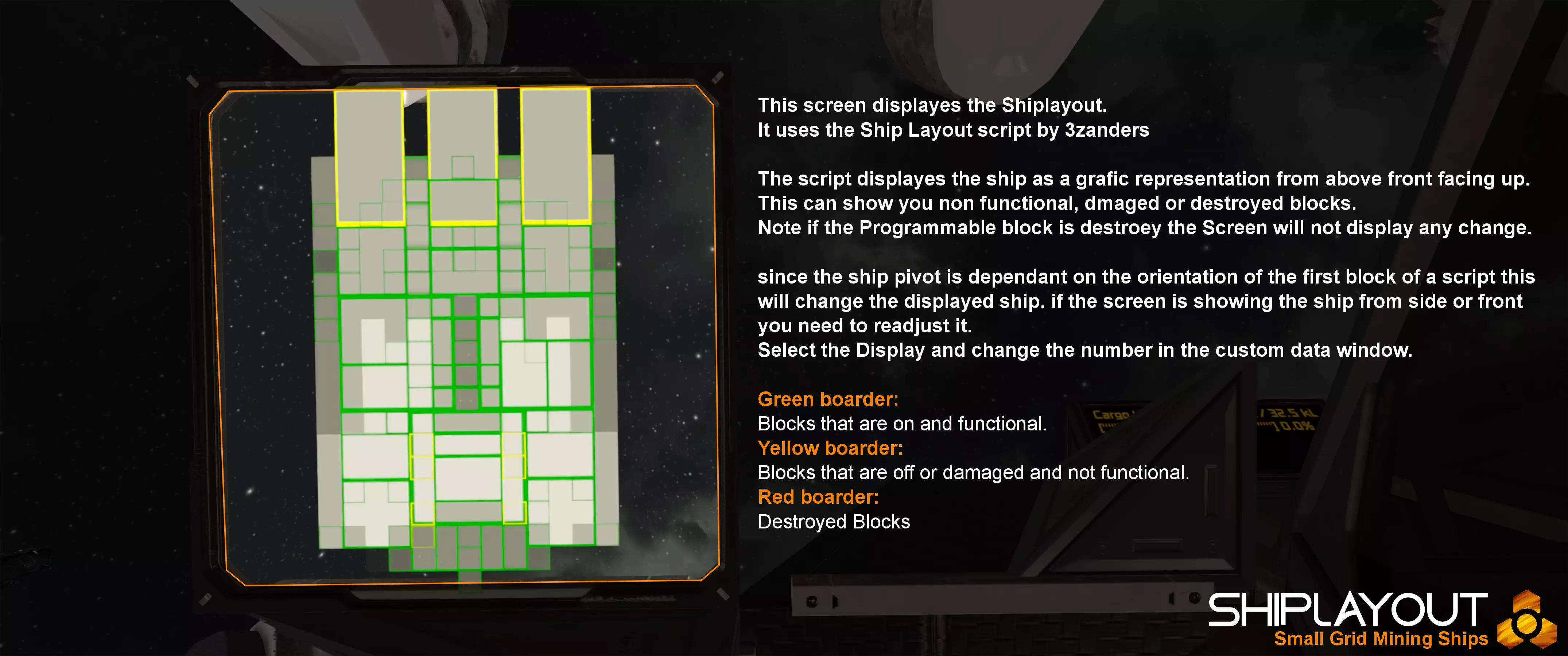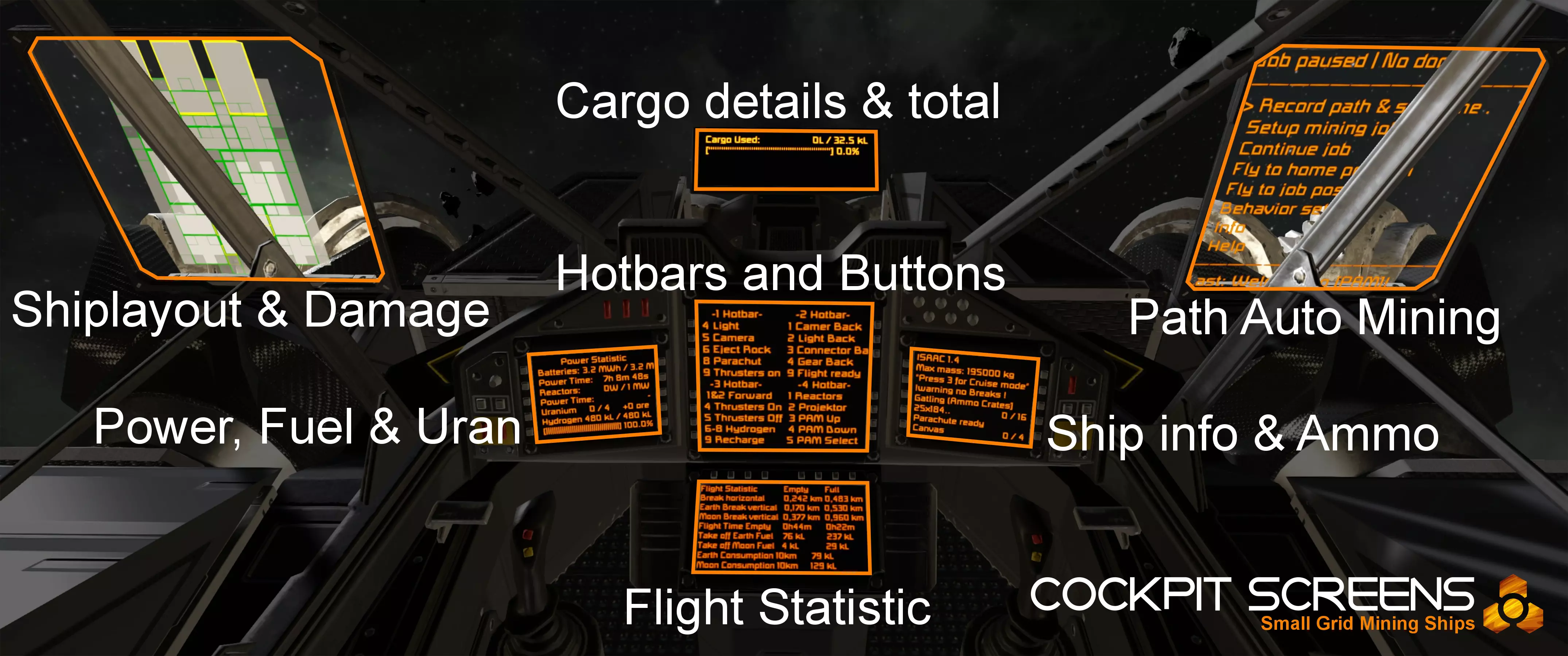 请注意,M级和L级采矿船的PAM和Shiplayout屏幕位于驾驶舱顶部。XS级采矿船的货舱屏幕位于驾驶舱右侧。以下是屏幕从左到右、从上到下的详细说明。