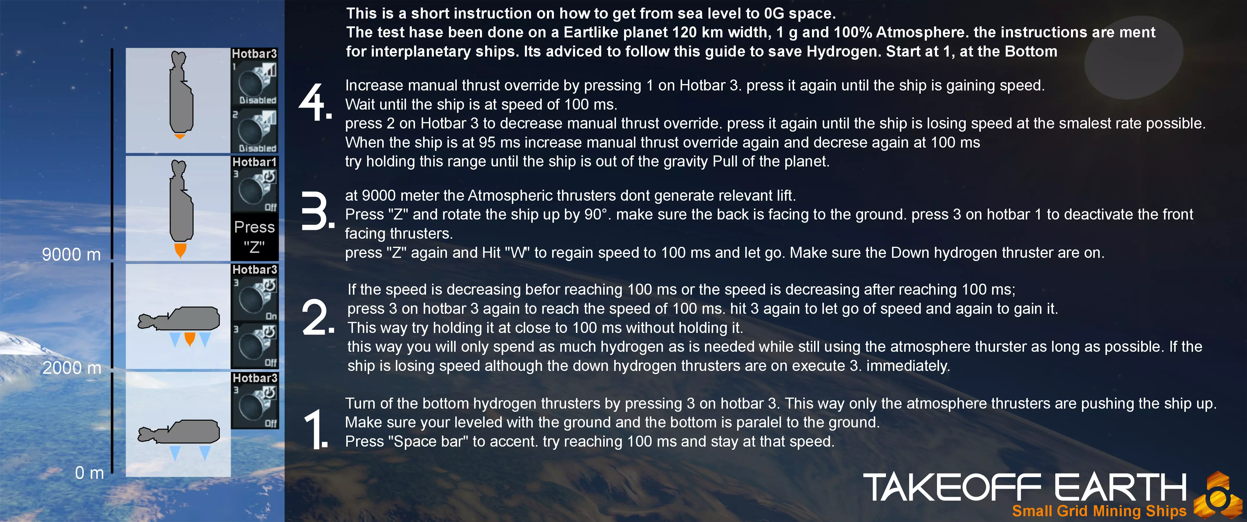你的燃油节省记录是多少? 太空到行星 如果你尝试以最少的燃油消耗降落在行星上,请按照以下步骤操作: 1. 瞄准你想要着陆的行星位置。 2. 切换到快捷栏1,按下3键并加速至100米/秒。 3. 在2000米高度时,确保向下的氢推进器已开启。如果没有,按下快捷栏3的3键。 4. 满载时,在1100米高度将飞船与地面保持水平。 5. 空载时,在750米高度将飞船与地面保持水平。 有关水平和垂直制动的测试制动数据,请参考飞船矩阵。