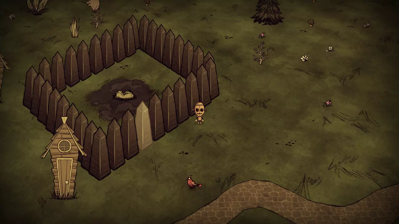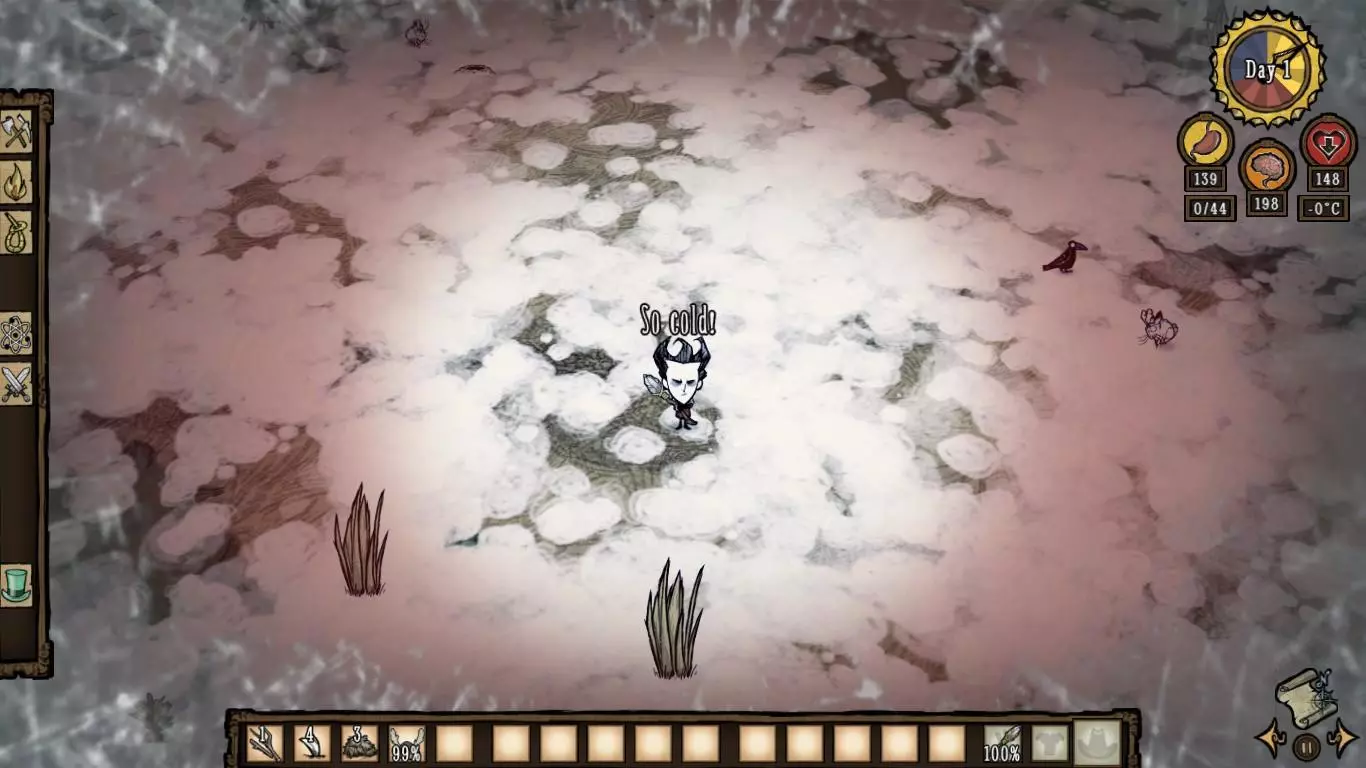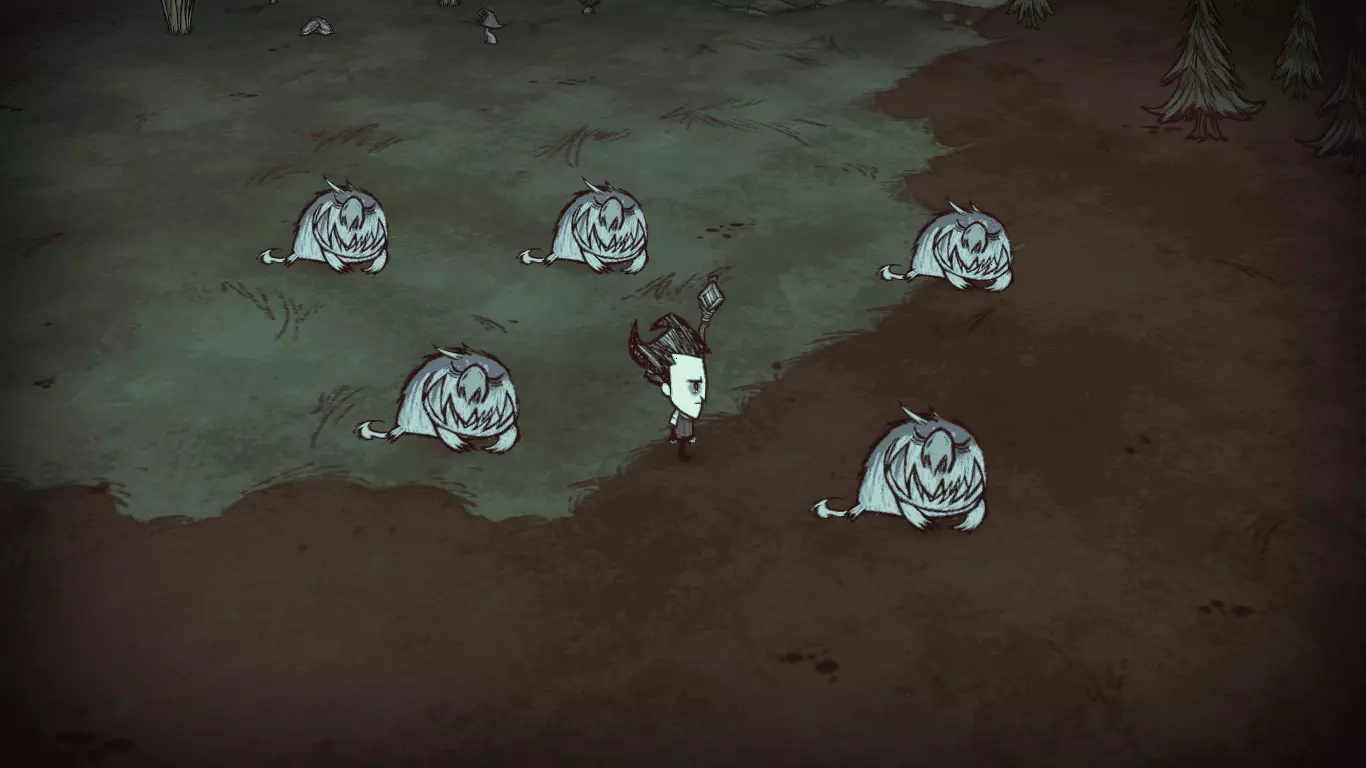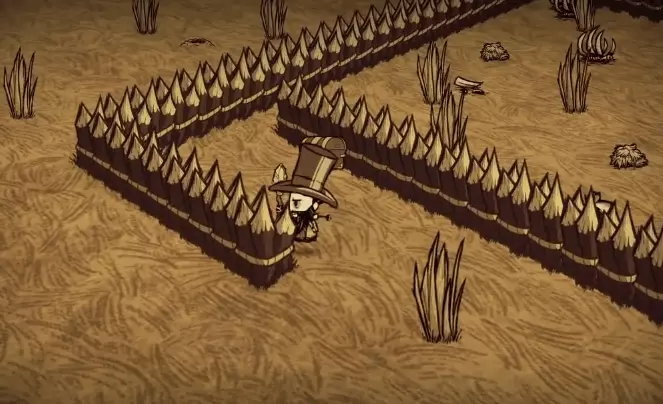 技巧: • 掌握好过方尖碑的方法,在穿过要求低精神值的方尖碑后需马上补充精神值以免被影怪攻击。 • 如果出生地周围资源较丰富,可以建立基地慢慢解锁大部分道具,为之后的关卡做好充分准备。 • 外出时屏幕结冰就要生火,等暖石烤热再继续探索,因此需要收集大量的干草和木头。 • 海象牙制作的行动手杖对之后的章节帮助很大;海象帽可以有效地回复精神值和保暖。 • 食物主要来源有兔子、大象、疯猪、高鸟等,建议制作烹饪锅最大效率利用食材。 3. 步步为营 The Game is Afoot 随机出现在1~4章 “什么?你还在这里?真厉害,但你或许应该见好就收了。”——麦斯威尔向玩家打招呼 玩家在一片被草地围绕的沼泽上醒来,周围有一个箱子,里面有7个木头、一个冬帽和3个燧石(罕见的特殊情况下,箱子里有10个腐烂物和4张蓝图)。刚开始,这个世界是冬天,在10天之后将会迎来永夏。基座和零件散落的地区入口均有敌对生物封锁路口(高鸟群、杀人蜂巢、蜘蛛巢、狗窝、触手群等等),有些地区还需要穿越虫洞才能抵达。在这个世界中资源十分丰富,玩家可以尽可能解锁制造栏和收集带去下一关的物品。