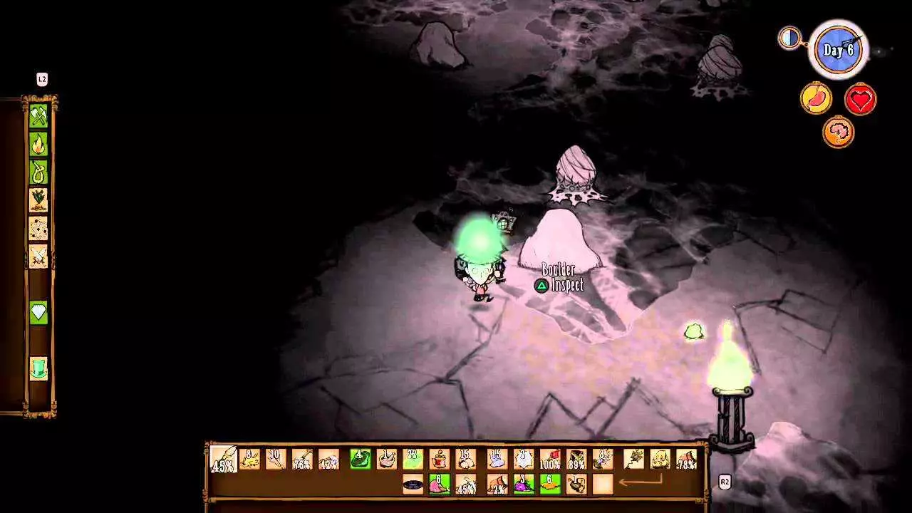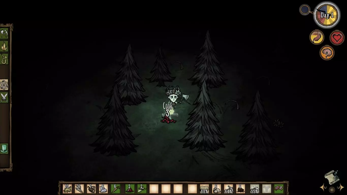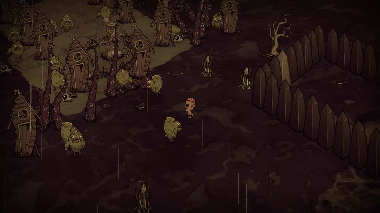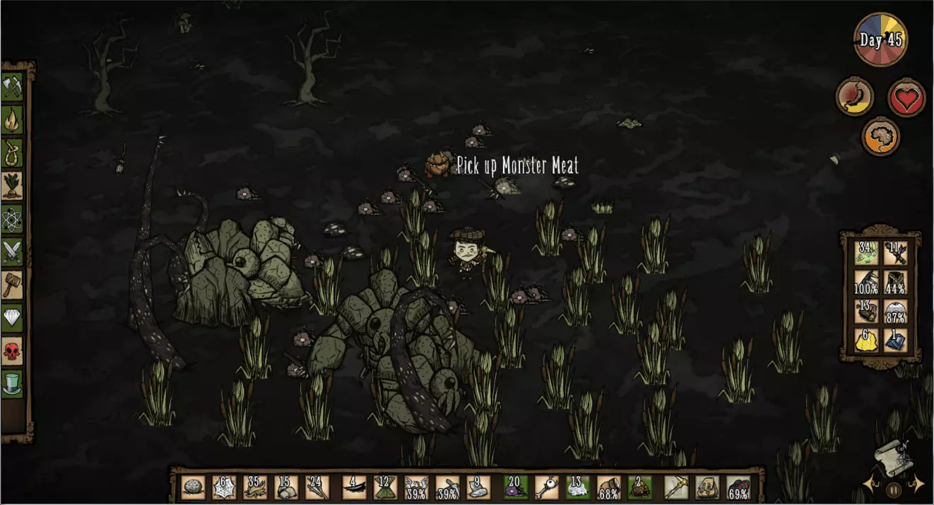 技巧: • 掌握好过方尖碑的方法,在穿过要求低精神值的方尖碑后需马上补充精神值以免被影怪攻击。 • 如果出生地周围资源较丰富,可以建立基地慢慢解锁大部分道具,为之后的关卡做好充分准备。 • 外出时屏幕结冰就要生火,等暖石烤热再继续探索,因此需要收集大量的干草和木头。 • 海象牙制作的行动手杖对之后的章节帮助很大;海象帽可以有效地回复精神值和保暖。 • 食物主要来源有兔子、大象、疯猪、高鸟等,建议制作烹饪锅最大效率利用食材。 3. 步步为营 The Game is Afoot 随机出现在1~4章 “什么?你还在这里?真厉害,但你或许应该见好就收了。”——麦斯威尔向玩家打招呼 玩家在一片被草地围绕的沼泽上醒来,周围有一个箱子,里面有7个木头、一个冬帽和3个燧石(罕见的特殊情况下,箱子里有10个腐烂物和4张蓝图)。刚开始,这个世界是冬天,在10天之后将会迎来永夏。基座和零件散落的地区入口均有敌对生物封锁路口(高鸟群、杀人蜂巢、蜘蛛巢、狗窝、触手群等等),有些地区还需要穿越虫洞才能抵达。在这个世界中资源十分丰富,玩家可以尽可能解锁制造栏和收集带去下一关的物品。