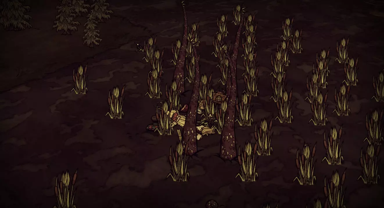 生存模式的沼泽地形中,芦苇丛里有大量触手隐藏在地下。这里是稳定获取芦苇的好地方,但在清理完触手群前,千万别贸然去收割芦苇,否则可能会不明不白地死亡。你可以在附近建造猪人房、兔人房或蜘蛛巢,让它们帮忙逐步清理触手。洞穴里也有类似的情况,不过那里的芦苇会变成荧光草。 蜘蛛陷阱