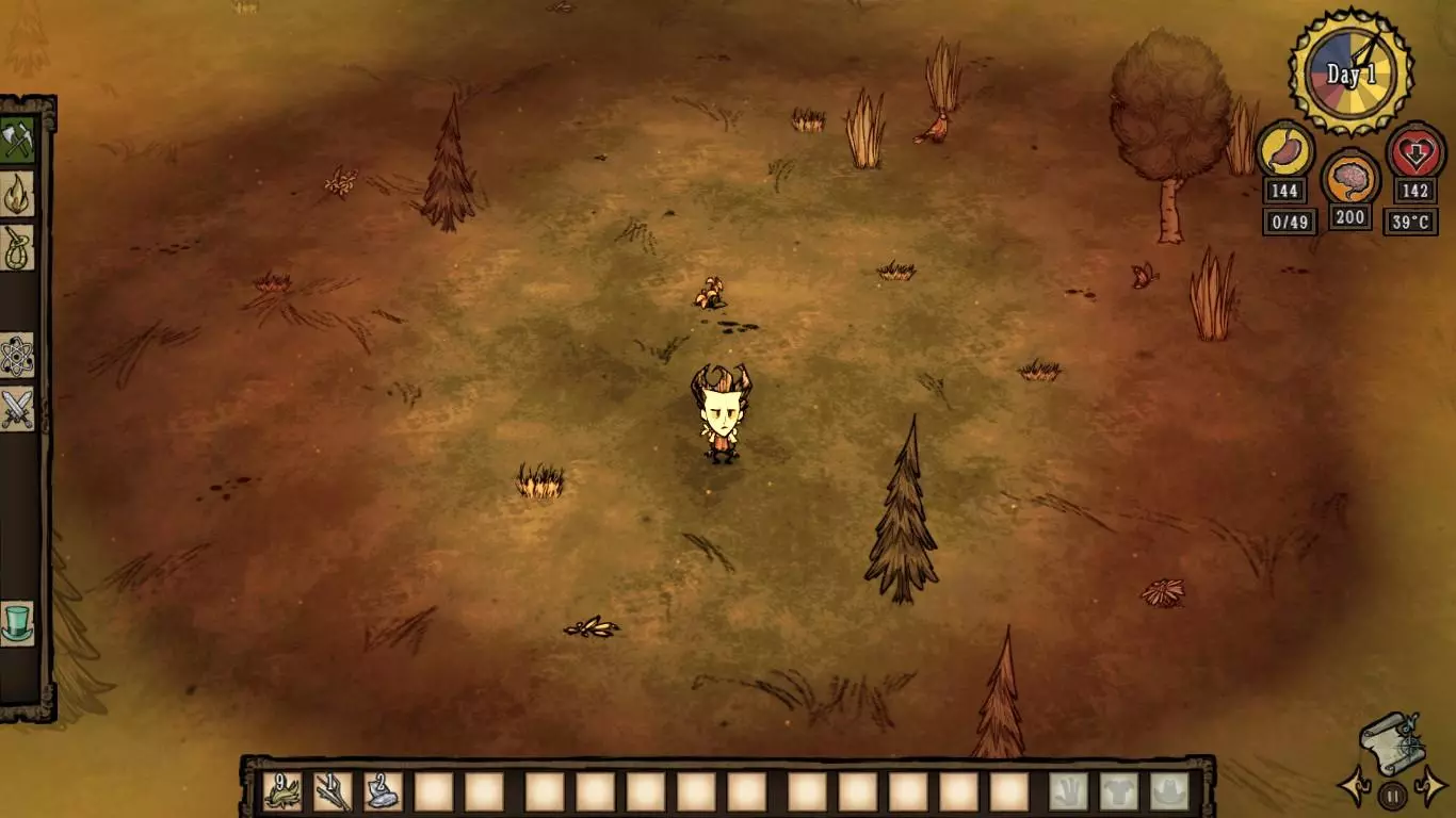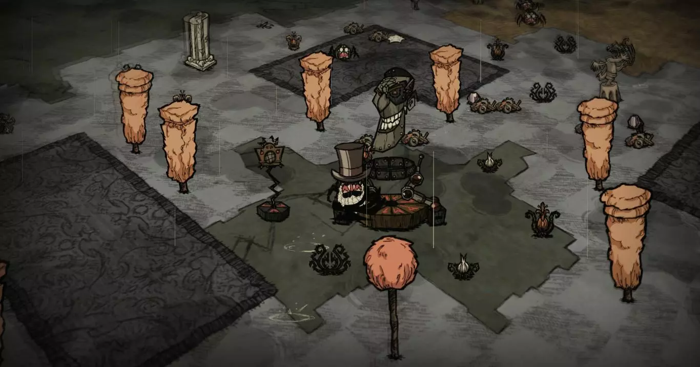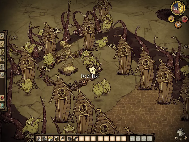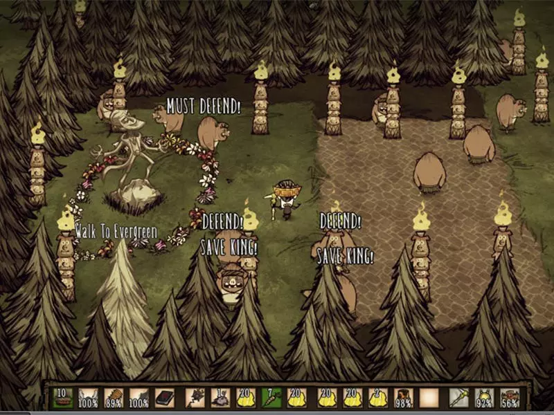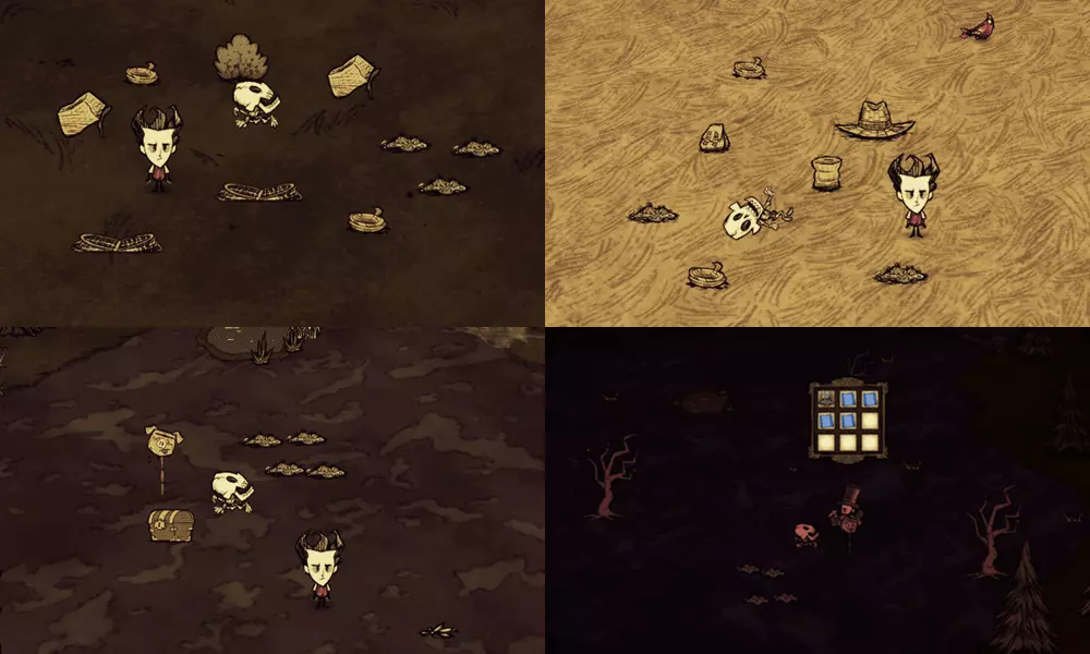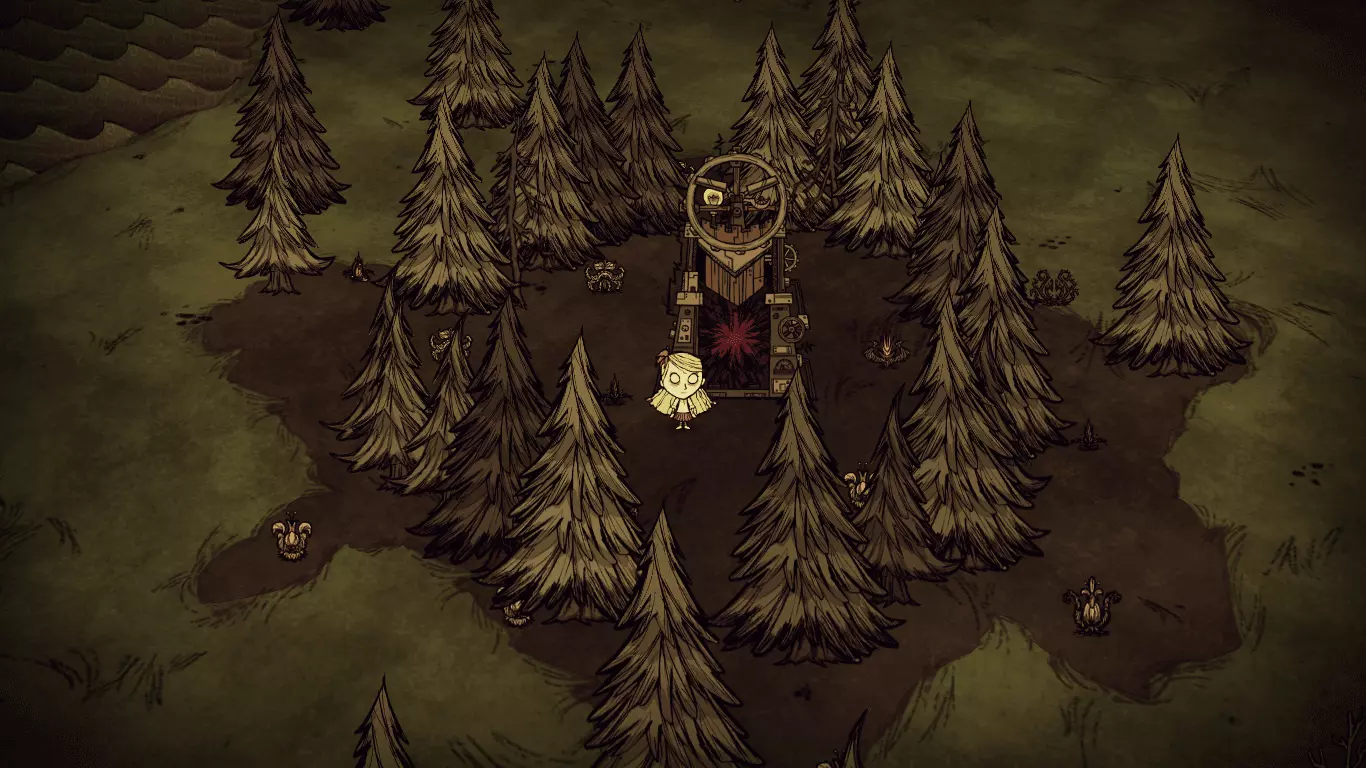 技巧: • 在遇到的第一个森林地形收集尽可能多的木头、干草、小树枝、燧石等必需品。 • 记住每个虫洞通向的地方,减少不必要的重复跳同一个虫洞的次数。 • 遇到沼泽地形可以等触手、蜘蛛和鱼人互相残杀得差不多的时候去捡战利品。 • 花环和高礼帽可以持续恢复精神值;拾取鲜花也可以增加精神值。 5. 两个世界 随机出现在3~4章 “喂,朋友。我们来做个交易吧。你可以留在这里,甚至定居下来。我会给你食物、黄金、猪,任何你需要的东西。我想要的回报只是休战。”——麦斯威尔向玩家打招呼 玩家在资源丰富的地形上醒来,周围有石头篝火、帐篷和一些常青树、胡萝卜、浆果林。在这座岛屿上,各种资源十分丰富,白天也格外漫长,简直如同天堂一般。然而,这里却没有传送所需的零件和基座。玩家需要通过虫洞前往另一座岛屿,寻找零件和基座,以便传送至下一关。另一座岛屿上布满了大量怪物和陷阱,处境十分危险。