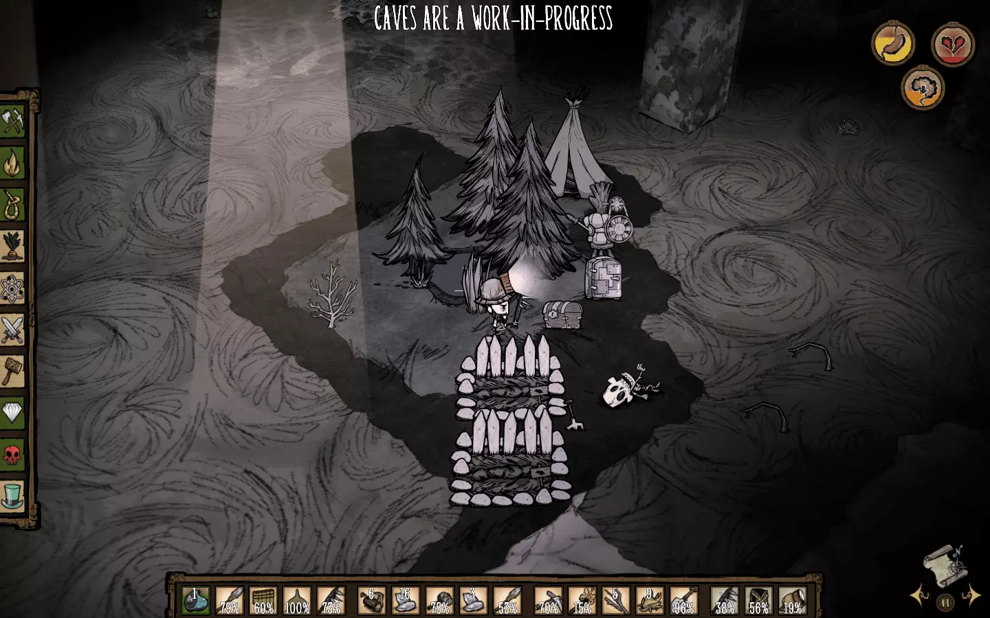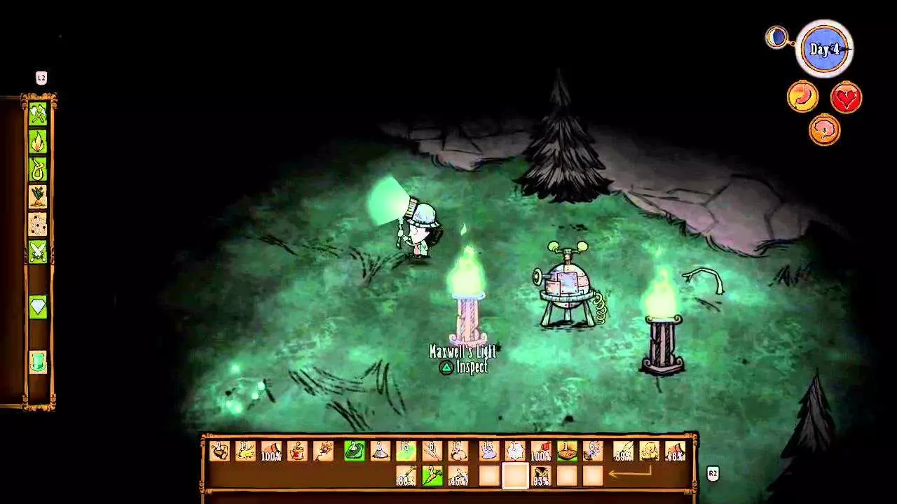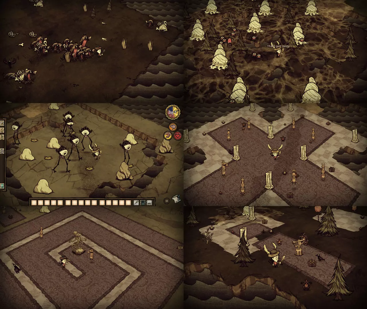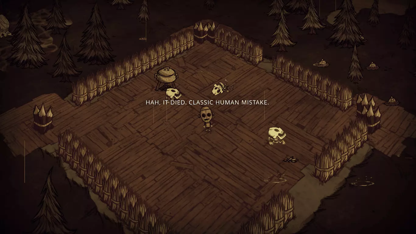 技巧: • 在遇到的第一个森林地形收集尽可能多的木头、干草、小树枝、燧石等必需品。 • 记住每个虫洞通向的地方,减少不必要的重复跳同一个虫洞的次数。 • 遇到沼泽地形可以等触手、蜘蛛和鱼人互相残杀得差不多的时候去捡战利品。 • 花环和高礼帽可以持续恢复精神值;拾取鲜花也可以增加精神值。 5. 两个世界 随机出现在3~4章 “喂,朋友。我们来做个交易吧。你可以留在这里,甚至定居下来。我会给你食物、黄金、猪,任何你需要的东西。我想要的回报只是休战。”——麦斯威尔向玩家打招呼 玩家在资源丰富的地形上醒来,周围有石头篝火、帐篷和一些常青树、胡萝卜、浆果林。在这座岛屿上,各种资源十分丰富,白天也格外漫长,简直如同天堂一般。然而,这里却没有传送所需的零件和基座。玩家需要通过虫洞前往另一座岛屿,寻找零件和基座,以便传送至下一关。另一座岛屿上布满了大量怪物和陷阱,处境十分危险。