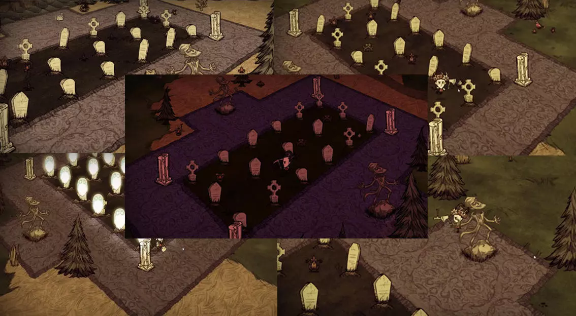在生存模式中,麦斯威尔的雕像旁整齐排列着几排墓碑。使用铲子挖掘墓碑可获得道具,但同时会出现鬼魂。【麦斯威尔的沼泽】