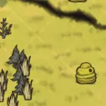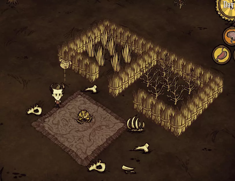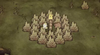 戴上花环白天可以缓慢恢复精神值,夜晚则会减慢精神值的下降速度。 基地选址: 在第5至6天左右,我们就可以放置石头篝火和科学机器来建立基地了。 一个好的基地应尽量满足以下条件: 1. 附近资源丰富(干草、小树枝和浆果丛都可以移植,树木也可以自行种植) 2. 拥有稳定的食物来源(例如兔子洞、牛群) 3. 靠近地图中心 【饥荒】的地图形状是以一个中心点向周围发散,通常有4至5个分支区域。
