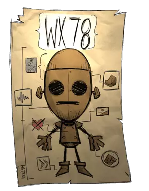 机器人WX-78 昵称:没有灵魂的机器人/机器人 座右铭:感同身受组件没有响应。 精神值:100~300 生命值:100~400 饱食度:100~200 空手伤害:1倍 能力: 1. 不挑食(任何快腐烂的食物的效果与新鲜的相同。吃怪物肉仍然有惩罚) 2. 通过雷电充能,会被雨水腐蚀 3. 可以靠吃齿轮升级(升级会提高三维) 总结: 机器人被闪电击中会立即回满血并降低33点精神值,进入过载状态。过载状态身体发光且移动速度变快。下雨会持续掉血,而且在DLC中增加了湿度系统,机器人只要湿度不为0就会持续掉血。所以如果用机器人遇到春天开局就比较头疼了。前期三维实在很渣,后期吃了齿轮就很给力了不推荐新手玩家使用。