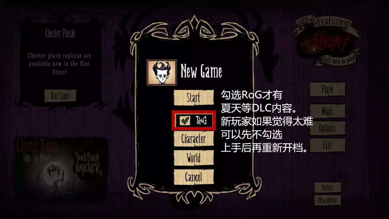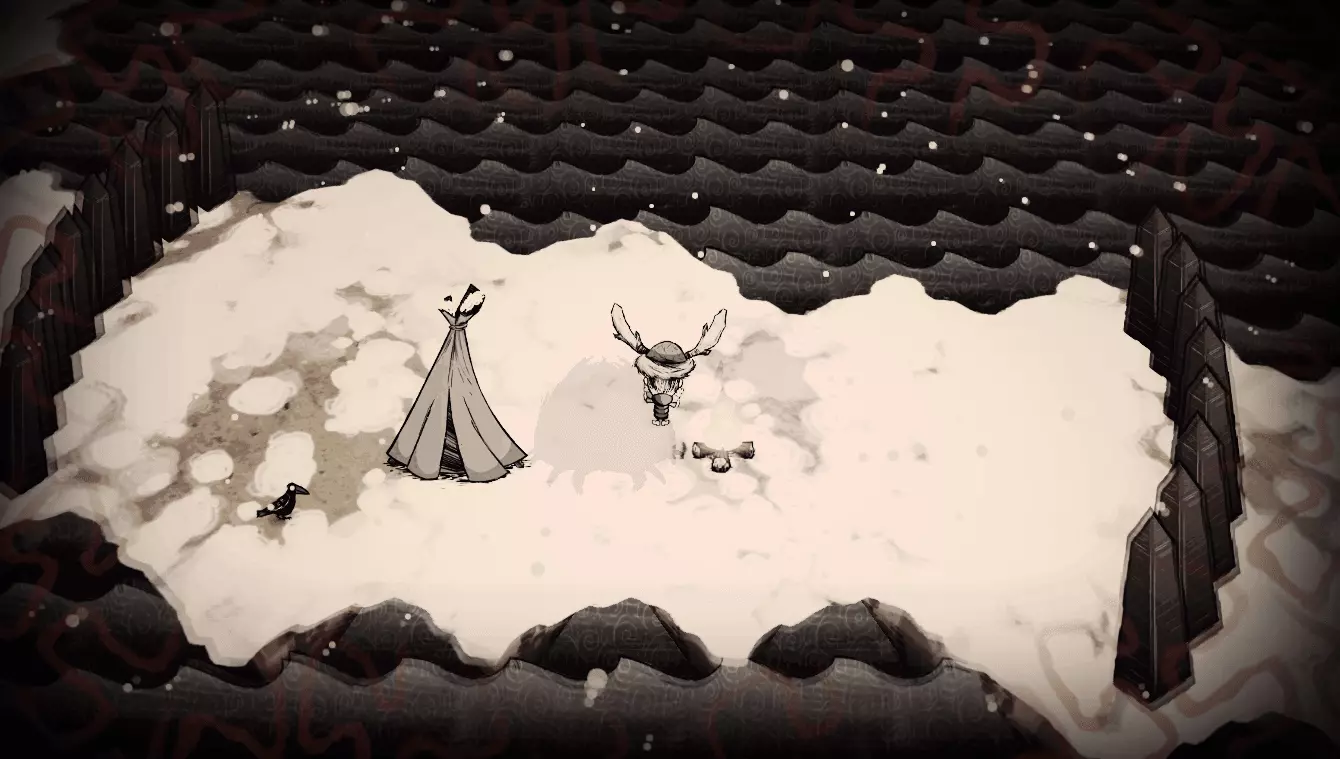 技巧: • 如果【冰冷的接待】出现在第一章,可以尽量解锁制造栏。 • 如果不在第一章,可以制作一些农场,雨水充足会让农场收获周期很短。 • 兔子、高鸟和青蛙是主要的食物来源。 • 雨伞可以很好地防止精神值降低,采集花朵,制作高礼帽、睡袋和帐篷可以有效地回复精神值。 • 有一些路口被蜘蛛巢挡住,可以慢慢清理;硬闯的话需要装备好护甲。 • 下一章有可能是群岛、步步为营和冬季之王,推荐携带牛帽进入下个世界。 2. 冬季之王 随机出现在1~4章 “好吧,看看你,居然活下来了。搞定一个,还剩四个!”——麦斯威尔向玩家打招呼 玩家在草地上醒来,麦斯威尔提醒我们永冬已经降临,同时点燃周围的树木给予人物较短的活动时间。附近有骷髅和背包,背包里有一张随机的蓝图、一个暖石、一些木头、干草和一个火把(有时还会有红宝石和噩梦燃料);背包旁还有探测器、兔子耳罩和斧子。这个世界挑战难度较大,我们需要随时注意角色体温,饱食度和精神值也下降得较快。在第7至9天时,巨鹿会来袭,务必要提前做好三件套和补血补精神值的料理应对。有的零件入口会有狗窝挡路,同样需要装备护甲小心应对。部分零件或基座会被方尖碑挡住,穿过方尖碑对精神值有特殊要求:有的要求精神值高于80,有的则要求低于30。减少精神值的方法有:拾取或食用恶魔花(-5)、食用怪物肉(-10)、挖掘坟墓(-10)、食用生绿蘑菇(-50);增加精神值的方法有:拾取鲜花(+5)、食用烤熟的绿蘑菇(+15)、靠近猪人伙伴(+25/分钟)。