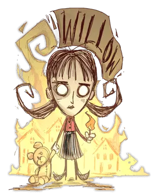 薇洛 昵称:纵火犯/火女 座右铭:事物在燃烧时更加美丽。 精神值:120 生命值:150 饱食度:150 空手伤害:1倍 能力: 1. 免疫火焰伤害 2. 有一个可爱的打火机 3. 紧张时会放火 总结: 开局自带一个无限耐久的打火机,但照亮范围比火把小。她在靠近火的时候会缓慢恢复精神值(要非常近)。 个人不是非常推荐新手玩火女,因为火女精神值上限低,精神值低的时候会随地乱点火,很容易把家给烧掉或者造成森林大火。当然如果注意精神值,不要让薇洛紧张,在晚上和冬天打火机还是非常好用的。