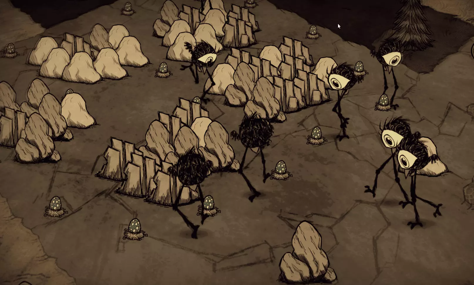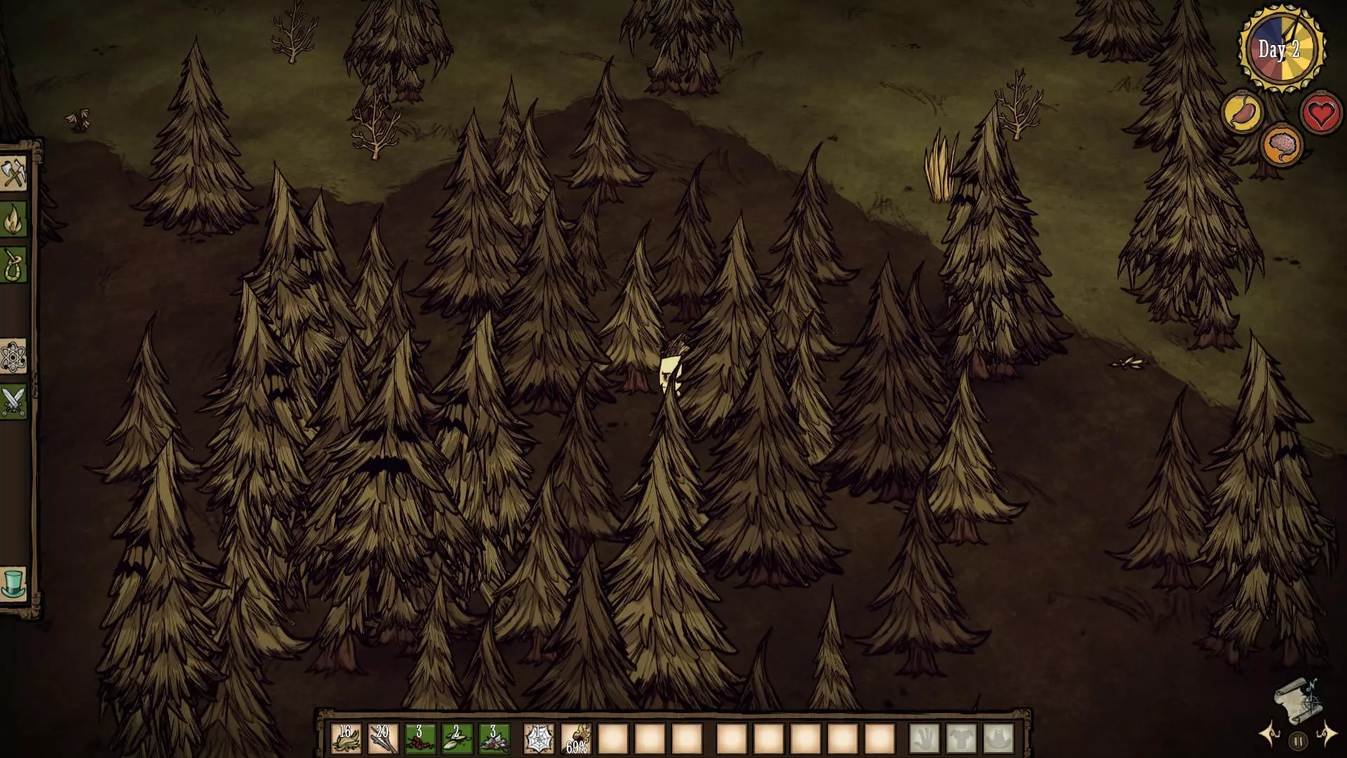 《森林》 很常见的一种地形,分布在地图各处。拥有大量的常青树和小树枝。 森林里的蜘蛛巢