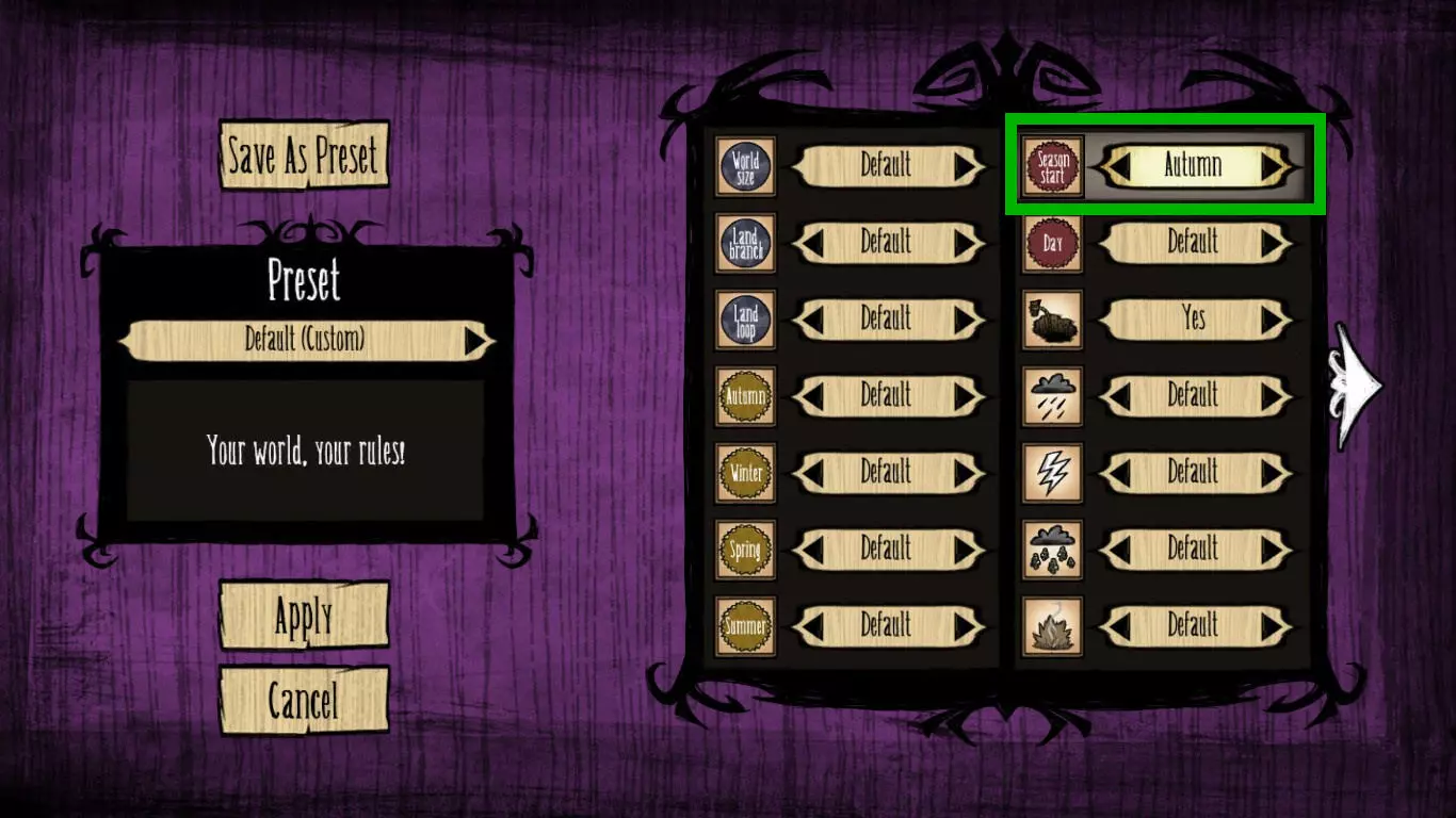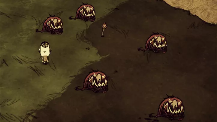 技巧: • 尽量在初始出生的岛屿收集资源,做好防具备好食物再前往第二个岛屿。 • 第二个岛屿虽然危险,但怪物战斗后掉落的食材十分丰富。 • 虫洞有两种,普通虫洞(棕色)是双向的;另一种呈灰绿色的【患病虫洞】(sick wormhole)是单向的。 • 若在第三章遇到两个世界的情况,推荐携带一些过冬物品进入下一关。 • 若在第四章遇到两个世界的情况,推荐携带萤火虫和肉干进入下一关。 6. 永夜 固定出现在第5章 “你这个傲慢、可怜又渺小的蝼蚁!不要激起伟大麦斯威尔的愤怒!你会后悔继续前进的……”——麦斯威尔向玩家打招呼 玩家在几个一次性篝火旁醒来,附近有一个背包,背包里有矿工帽蓝图、干草、木头、两个随机物品和一张随机蓝图。在这个世界中没有白天,植物不会生长,很多生物也会处于睡眠状态。有一些恶魔灯,玩家靠近时会有火提供照明,离开后熄灭,玩家可以在旁边休息整顿,不过恶魔灯并不能用来烤食物。