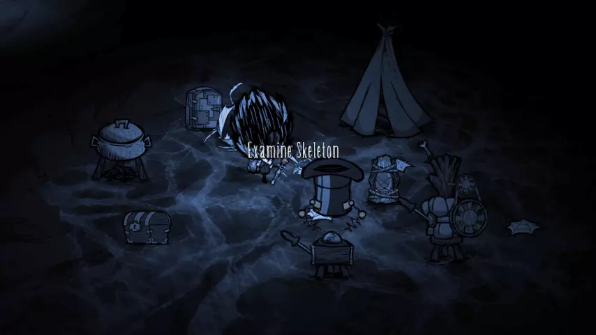 技巧: • 进入永夜章节前解锁捕虫网,或者准备好一组萤火虫,因为矿灯帽需要充能,永夜关有萤火虫。 • 携带肉干进入永夜关可以很好地补充饱食度和精神值。 • 推荐携带进入永夜关的四格物品:金子、行动手杖、一组肉干、一组蜘蛛丝。 • 吃烤熟的蘑菇可以增加精神值;制作高礼帽也可以减少精神值下降速度。 • 可能会有方尖碑拦住去路,需要玩家控制精神值通过。 • 在沼泽地形上移动时最好装备防具,因为黑暗中不容易看清触手的位置。 • 资源稀缺,尽量快速通过此关,必要时可以吃烤熟的怪物肉来恢复饱食度。 7. 尾声:将军 固定出现在第6章 “好了,就是这样。你找到我了。”“现在,你打算怎么做?”——麦斯威尔向玩家打招呼 剧情关卡,不剧透。 奇遇 奇遇是世界生成时随机出现在地图某些地方的建筑组合。玩家通常可以得到一些十分有用的道具,不过也有一些奇遇是陷阱,会给玩家带来危机。我们可以通过一些方法避免激活陷阱而获取道具。 洞穴营地