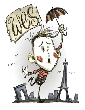 韦斯 昵称:默剧者 座右铭:"..." 精神值:150 生命值:113 饱食度:113 空手伤害:0.75倍 能力: 1. 不会说话(野狗来袭等一些游戏事件无法通过文字显示提醒玩家) 2. 很难生存(低三维,更容易饿) 3. 会吹气球(消耗5点精神值吹一个气球,怪物碰到会爆炸造成5点伤害,气球爆炸有连锁反应) 总结: 韦斯纯粹是给后期高手玩家增加难度和游戏性的一个人物。他会比其他角色更容易饿(饱食度下降速度快25%)。较低的三维和伤害倍率让他的生存成为一个挑战。只推荐高手玩家使用。