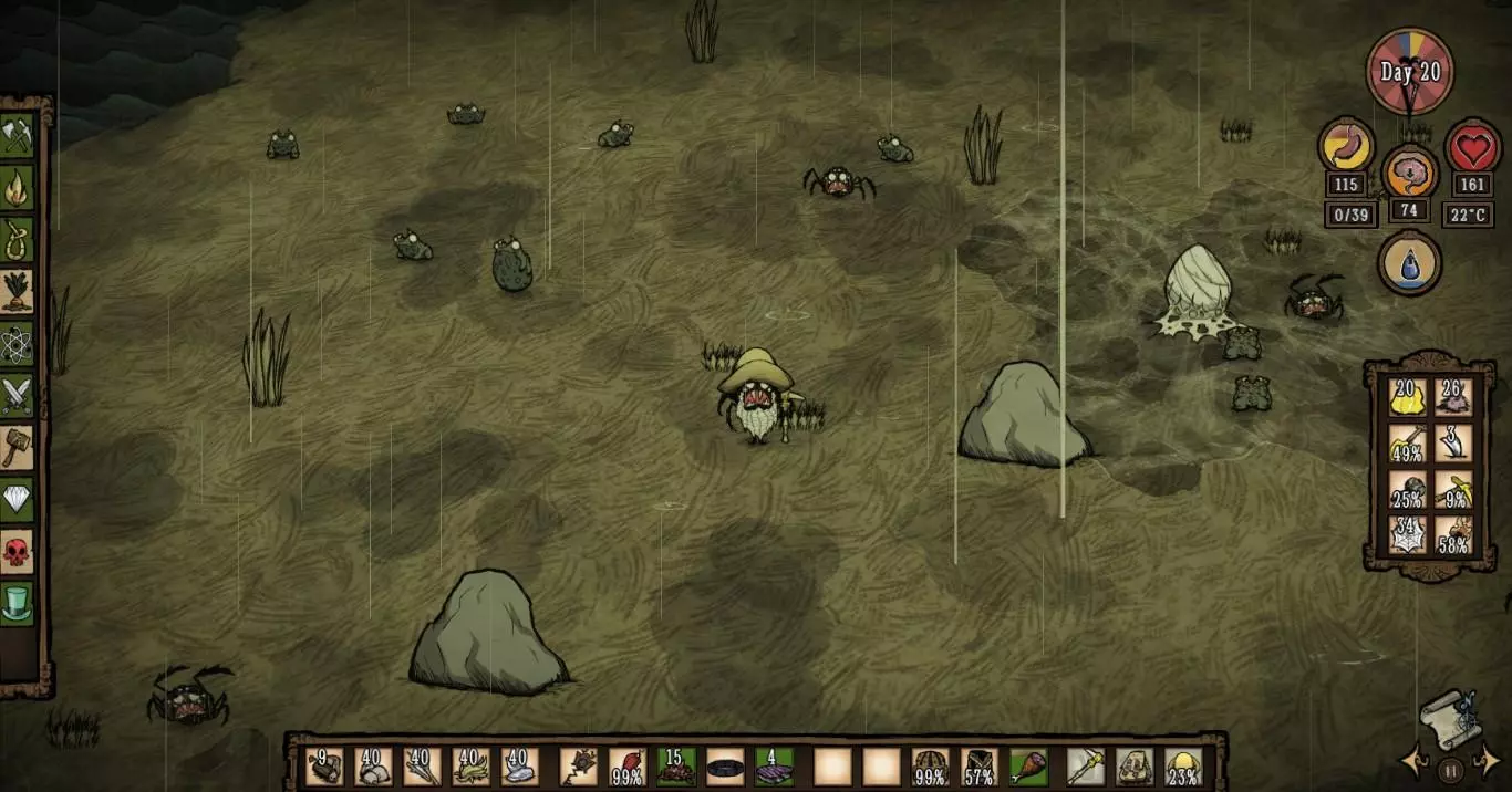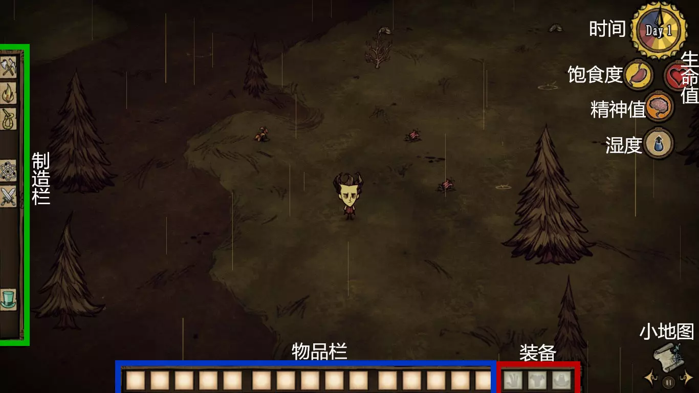 湿度:DLC新增的基础数值,显示在精神值下方。下雨会增加湿度,降低携带物使用效率(柴火)。穿着湿的衣服帽子,精神值会持续下降,角色身体温度也会降低。减少湿度的方法有:穿防水的衣服帽子,打伞,靠近篝火。如果使用机器人,湿度降为0之前会持续掉血。 基础操作 WASD操纵人物移动,Q和E是旋转视角。游戏中按ESC呼出菜单,【存档并退出】是存档并退出。 Shift查看物品,Tab键是呼出小地图(小地图界面游戏时间处于暂停状态,所以可以按Tab来暂停) 空格是捡取物品。F键是主动攻击身边的生物,按住F可以持续攻击。 鼠标左键:选取。放在生物上点左键为攻击。Ctrl+左键点击生物是强制攻击(对影怪无效),Ctrl+左键点击物品是拆分。 鼠标右键:使用。可以装备物品和吃东西。 季节变更 游戏开局是随机春天或者秋天,然后四季轮回。推荐新手玩家调成秋天开局,毕竟DLC中的夏天比冬天困难许多。(世界->季节开始)