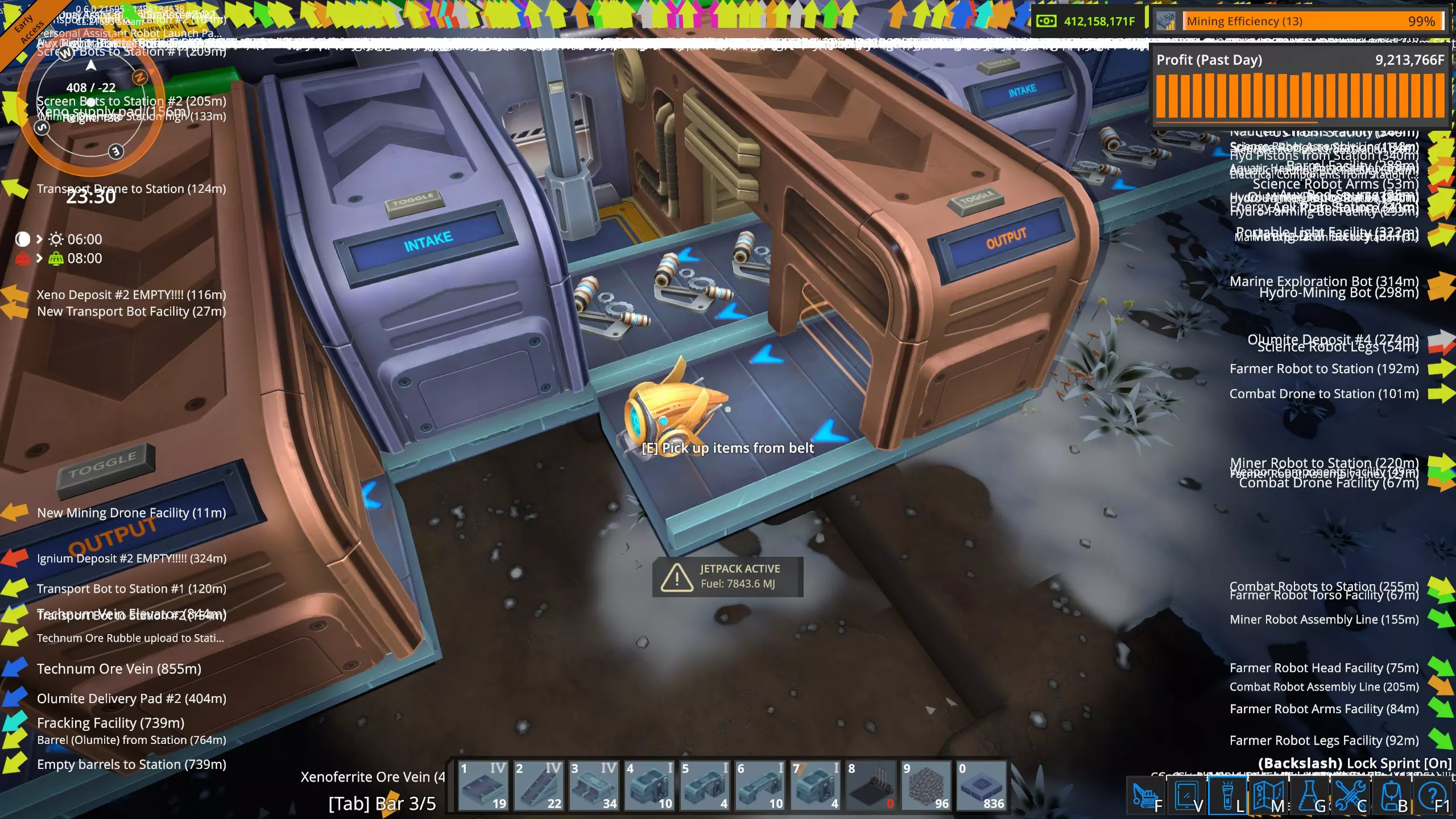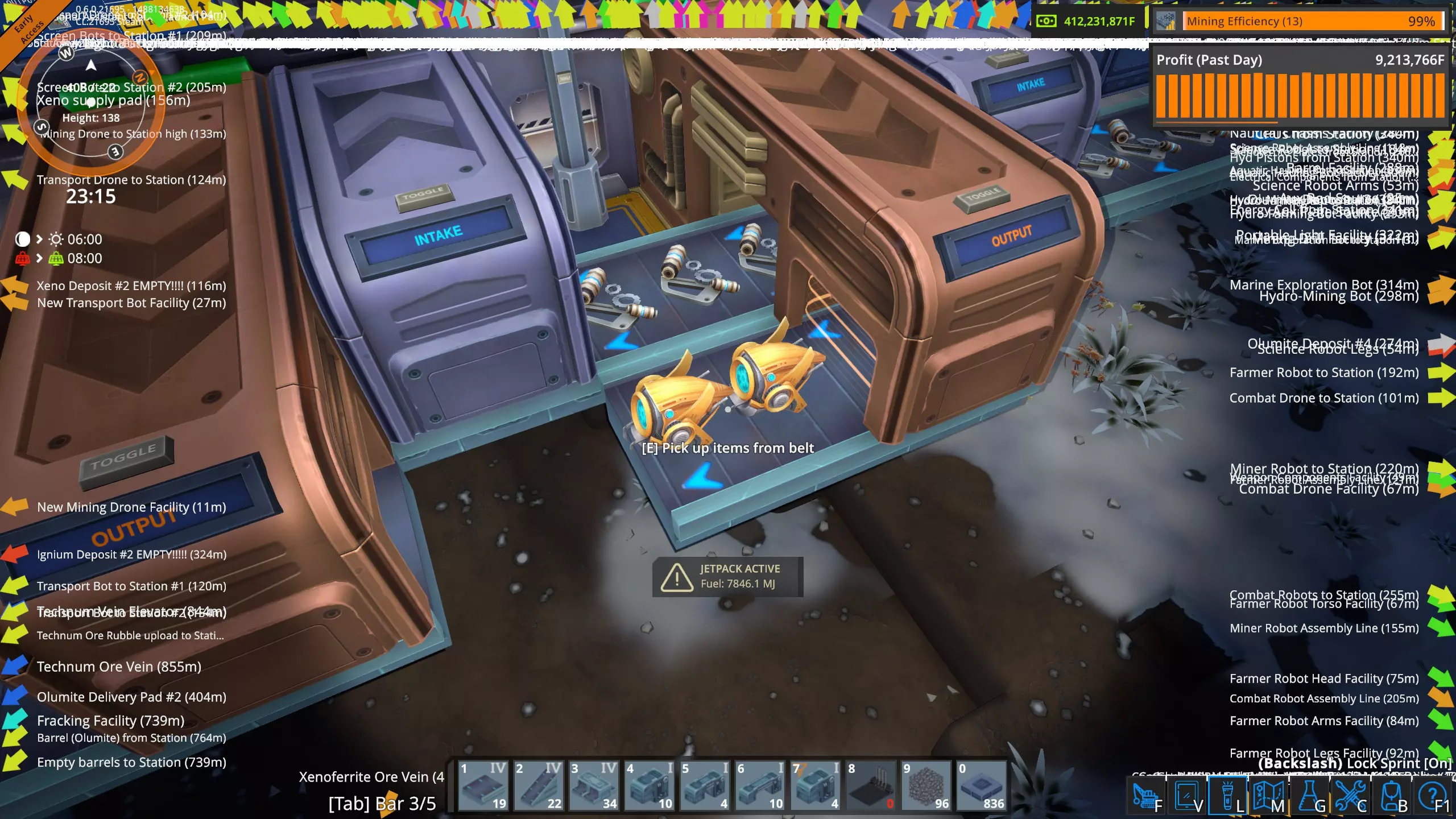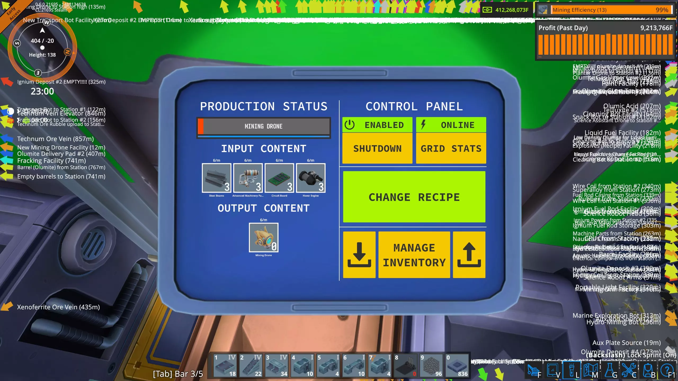 采矿无人机研究数据 仔细观察可以发现,采矿无人机的生产效率显示为48%,这可能有点误导性。实际上,它比基础值高出100%,最终数值为148%。换句话说,当你首次生产采矿无人机时,效率为100%,而现在则提升了48%。好吧,这确实有点令人困惑。简单来说,我们现在制造无人机的效率比以前提高了48%。 生产效率在工厂中的显示方式 回到星球表面,我们站在正在制造采矿无人机的装配机III旁边。让我们仔细看看该建筑的面板。