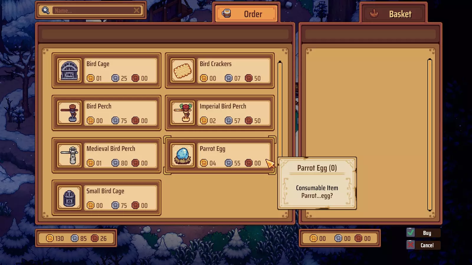 本指南将帮助你获取一只鸟并进行训练。 v0.5.4.6 一、需求条件 1. 游戏时间:第24天或更晚。神秘男子首次出现在第24天(星期三)。 2. 金币:13金币60银币(在未进行任何经验值升级/技能点加成的情况下为13g60s) 【议价升级】 【等级0(100%)】 【等级7满级(50%)】 鹦鹉蛋 9g10s 4g55s 鸟栖木 1g50s 75s 鸟饼干 每个15s×20次=3g 每个7s50c×20次=1g50s 总计 13g60s 6g80s 二、步骤一:获取鸟蛋 在星期三和星期四晚上8点(20:00)之后,从你的酒馆向南进入下一个区域。一直向南走,直到到达池塘/湖泊,然后向东进入下一个区域。