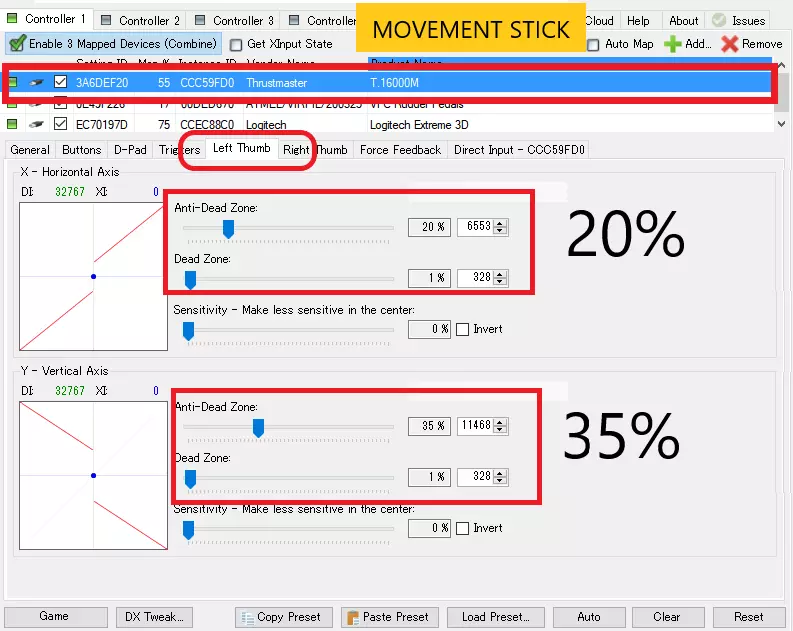 如果在绑定过程中控制器出现输出并造成干扰,请取消勾选第4项中描述的复选框。注意,更改后短时间内(约几秒钟)将无法进行映射。 设置控制器的防死区 所有游戏(不仅限于Steam游戏)默认都有死区,这意味着细微输入不会被识别。这种效果在摇杆上尤为明显,因为摇杆的移动量较大。 在底部的左(右)摇杆选项卡中更改防死区和死区数值。 摇杆的输出应按以下方式检查: Steam端的检查仅作参考,请在游戏中检查并进行调整。由于游戏端的死区已确认大于预期,建议将防死区增加约12000(35%或更高)。移动摇杆的水平轴应调小,其他轴则建议设为大于12000以提升易用性。推荐设置:防死区6-35%(2000【Steam端最小值】~12000),死区1%(328)。
