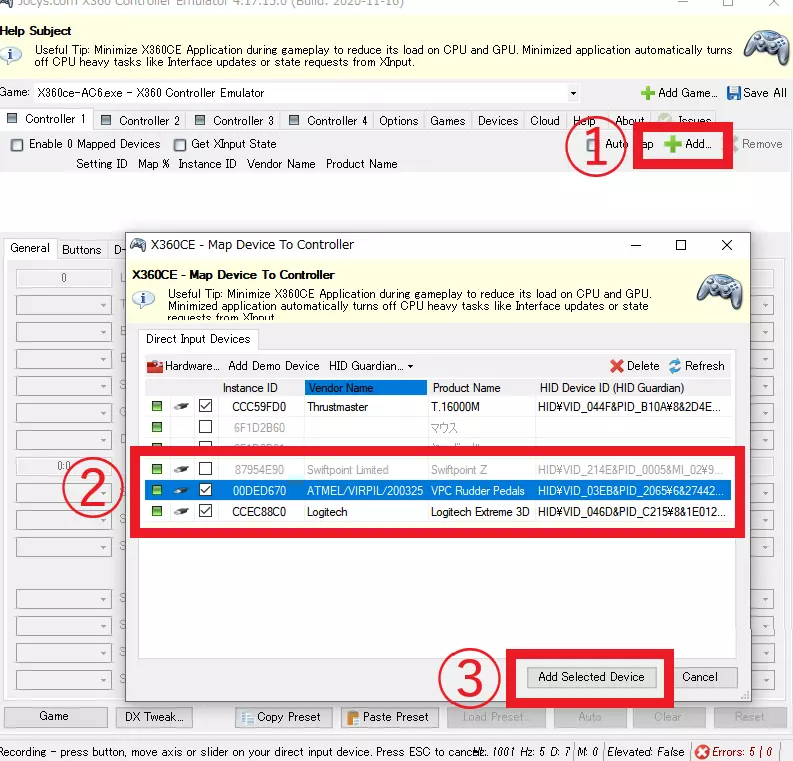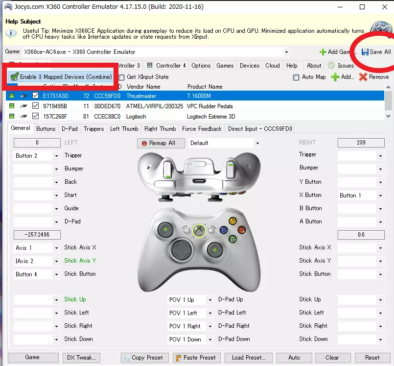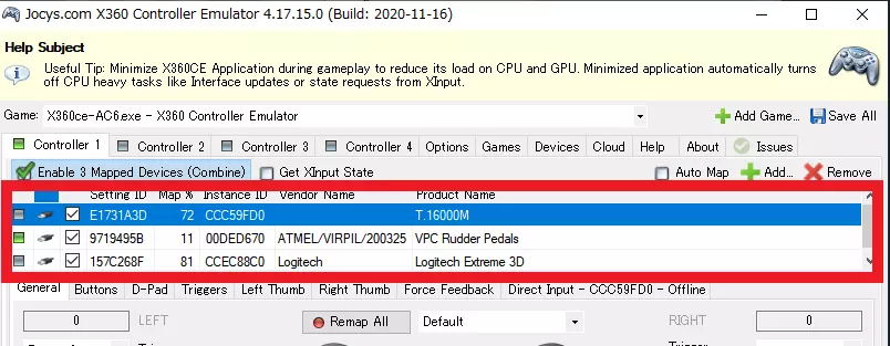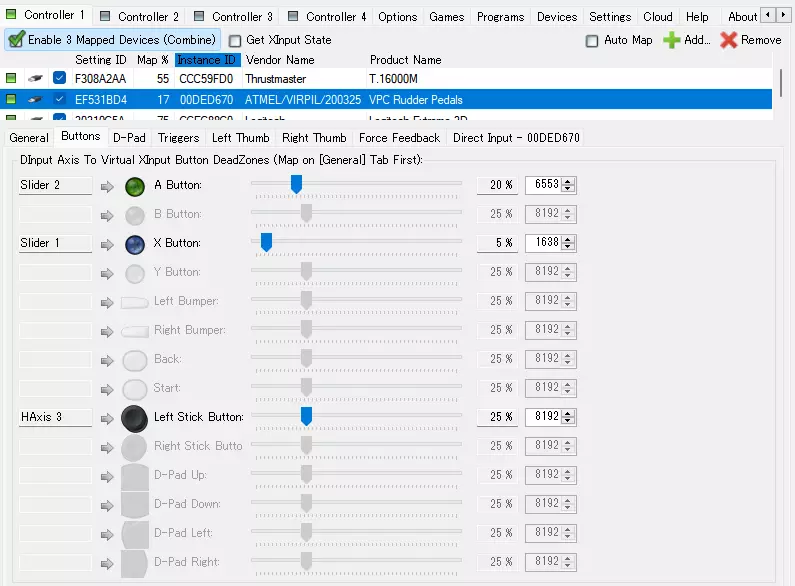 3. 执行按键绑定(映射)。 从顶部已添加控制器列表中选择(点击)你想要绑定的控制器,然后在底部进行设置。 为每个控制器都执行此操作。 注意:控制器列以蓝色选中,而非通过勾选框选择。