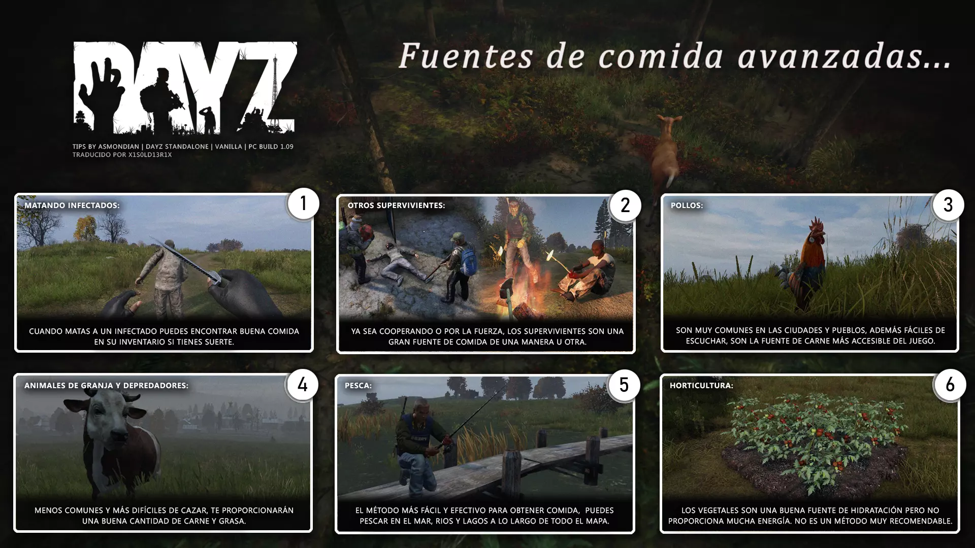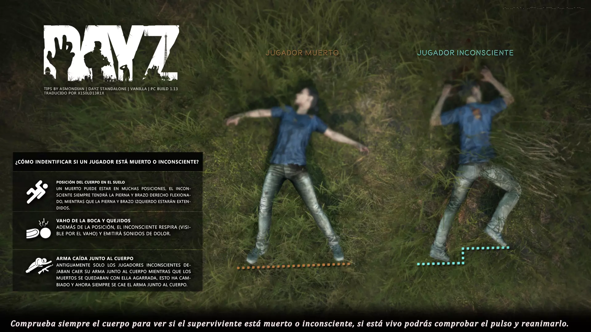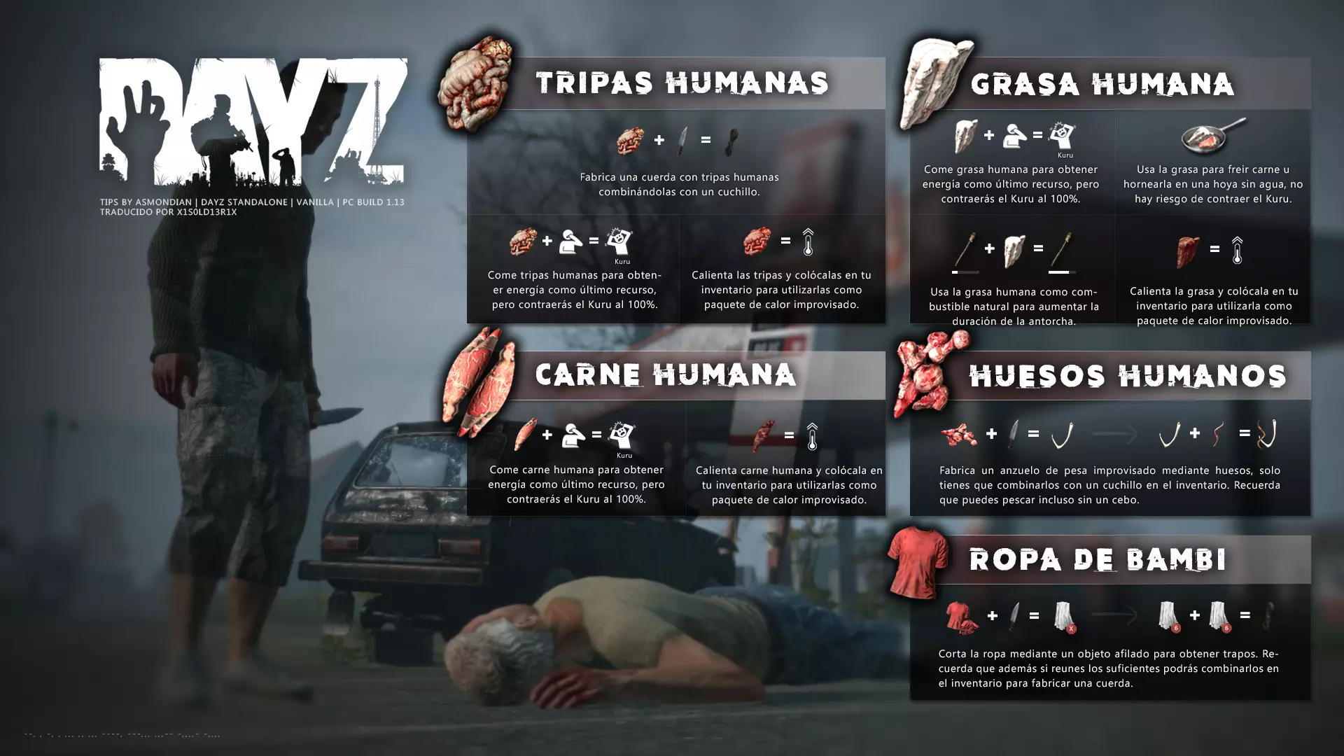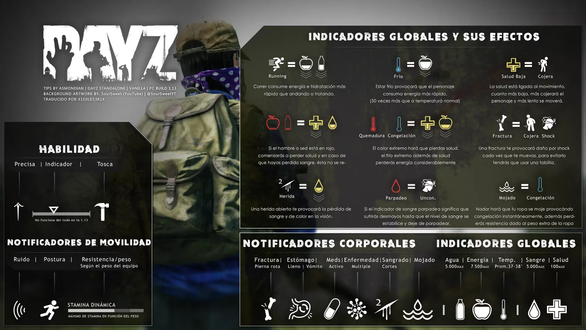 Aquí iré informando de las futuras actualizaciones de la guía. · 23/03/2021 - Guía actualizada hasta la versión 1.11 · 29/05/2021 - Guía actualizada hasta la versión 1.12 También se ha añadido una segunda sección de servers recomendados con el mapa de Namalsk · 13/06/2021 - Añadidos varios servers recomendados de Esseker y añadido un nuevo server recomendado para Chernarus (Invicta server) · 03/07/2021 - Actualizada la imagen principal de la sección "[Primeros pasos] Comida" con los nuevos tipos de comida. Añadida una nueva infografía en "[Info] Horticultura" con más datos significativos. · 04/07/2021 -Actualizada la sección "[Primeros pasos] Comida" con una imagen actualizada de los valores de la carne. Añadido un consejo con infografía de Asmondian en la sección " [Info] Caza" sobre como aprovechar los cadáveres humanos para nuestra supervivencia. · 04/07/2021 - Se están actualizando las infografías de Asmondian a la 1.13 que contienen nueva información, es algo que llevará algún tiempo. · 18/07/2021 - Se ha creado un grupo de Steam para la comunidad hispanohablante de DayZ, es un punto de encuentro para todos los supervivientes donde contar nuestras historias, consultar dudas, problemas y todo lo relacionado sobre el juego. https://steamcommunity.com/groups/DayZ-ESP · 5/08/2021 - Traducidas las infografías de la sección "[Protección] Chalecos y cascos" y "[Sistema inmunitario] Enfermedades" · 7/08/2021 Añadido nuevo server Livonia a recomendados: [GER] TheVoid | Hardcore | Organic RP | 1PP |: 5.230.84.31:2302 Es un Role Play Orgánico muy recomendable y bastante popular a pesar de estar recién abierto. · 13/08/2021 Añadido nuevo server Chernarus a recomendados: 14 DIAS | NEVER ZURRENDER | PVP | ORGANIC RP: 138.201.83.45:2304 Servidor semi-RP Orgánico en español, se ha añadido de manera excepcional por ser un buen sitio para aprender a jugar para aquellos que tengan menos paciencia, el server da bastantes facilidades como un mapa, comida extra y demás añadidos que desde aquí no solemos recomendar, sin embargo está bastante bien para empezar a jugar ya que no es un server Hardcore y además tiene una buena comunidad. · 14/08/2021 - Actualizadas infografías de las medicinas en la sección: [Medicamentos] Clases, [Reparación] Reparar loot, [Primeros pasos] Comida y [Shock] Inconsciencia · 17/08/2021 - Añadida nueva info a la sección [Daños] Dolor que no había sido incluida, básicamente que la morfina es un remedio muy efectivo contra el dolor. · 11/09/2021 - Guía actualizada hasta la versión 1.13, Añadida nueva sección médica llamada [Enfermedad] Heridas infectadas. · 27/10/2021 - Creada sección [Enfermedad] Envenenamiento Tóxico en la guía médica para conocer lo relativo a esta enfermedad. · 30/10/2021 - Creada sección [Info] Zona Tóxica en la guía de supervivencia donde se revelan todos los datos relativos a las zonas contaminadas y actualizada la lista de servers recomendados. · 31/10/2021 - Guía actualizada a la 1.14 en su mayor parte, lo cierto es que no tengo tiempo para completarla como me gustaría pero cuando lo disponga lo haré, añadido nuevo consejo en [Combate] Nociones avanzadas 2 para matar a los zombies de una puñalada, también se ha actualizado la sección de Trampas de la guía de armas y combate. · 15/01/2022 - Actualizadas las secciones de armas de la guía de armamento y combate, se han añadido las armas que faltaban. Actualizada la sección [Crafting] Armas recortadas. · 16/01/2022 - Actualizada la sección [Sangre] Heridas con la nueva info sobre infecciones en los cortes. · 17/01/2022 - Creada nueva sección con los tipos de zombies en la guía básica. · 03/04/2022 - Editada sección [Reparación] Reparar loot de la guía de crafting (básicamente que las máscaras de gas se pueden reparar con Epoxy y el traje NBQ con el kit de reparación de neumáticos. NOTA: Hacer las trampas para peces. · 20/04/2022 - Actualizada la sección de servers, se han incluido nuevos servidores y eliminado las comunidades cerradas, además de actualizas algunas IPs, la mayor novedad es que ha vuelto el servidor DayZ Core de Livonia y ha tenido una gran acogida. · 30/04/2022 -Actualizada la sección de "[Crafting] Básico" de la guía de crafting y loot, se han incluido un par de infografías de Asmondian. · 02/05/2022 - Actualizada la sección de "[Info] Pesca" de la guía de supervivencia, se han incluido las trampas para peces, lo mismo con [Info] Caza, se ha incluido el lazo trampa para conejos y gallinas, también [Info]La cocina (2ª Parte), en ella se ha actualizado el método de cocina "Hervido" con nueva info y por último mencionar que los helicrash cuando spawnean emiten un ruido estrellándose que permite escucharlos, con esto la guía queda completamente actualizada a la versión 1.14 · 07/05/2022 - Voy a tratar de rehacer todas las secciones de la guía para mejorarla, de momento he comenzado con la básica sección por sección. · 20/05/2022 - Guía actualizada completamente a la 1.15 · 10/06/2022 -Actualizada la sección [Info] Zombies 1/1 añadiendo la alarma como método de distracción, actualizada guía con nueva info: es posible beber con las manos manchadas de sagre sin enfermar si se hace desde un recipiente, nueva info sobre la reparación de loot y ahora es posible crear una tablilla para fracturas mediante cinta aislante y palos cortos. Actualizada la guía completamente a la 1.16. · 23/01/2023 - Actualizado servidores recomendados · 02/02/2023 - Estoy actualizando la guía lentamente, ya que algunas partes han quedado obsoletas, actualmente hay datos erróneos debido a que se han cambiado mecánicas. Introducción
