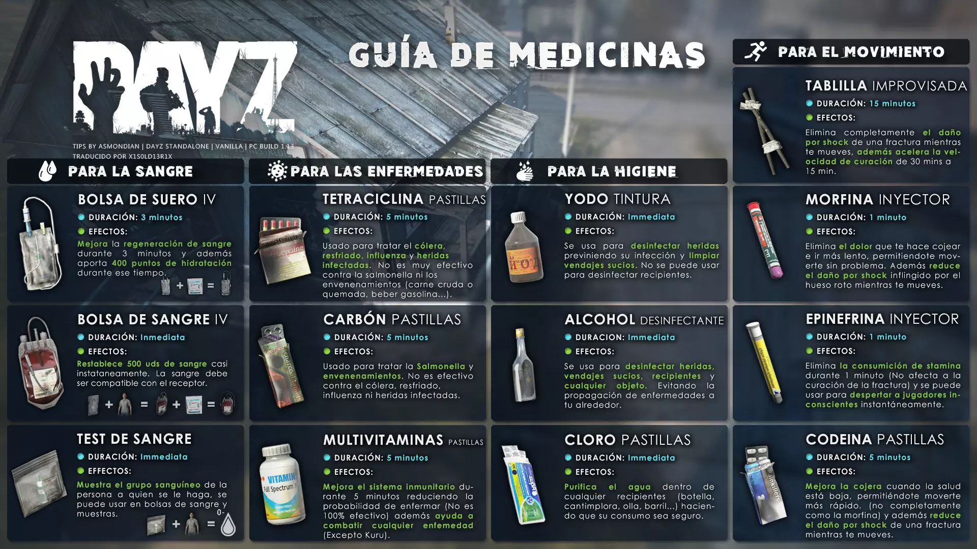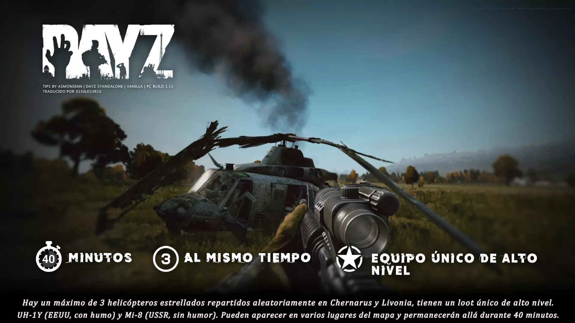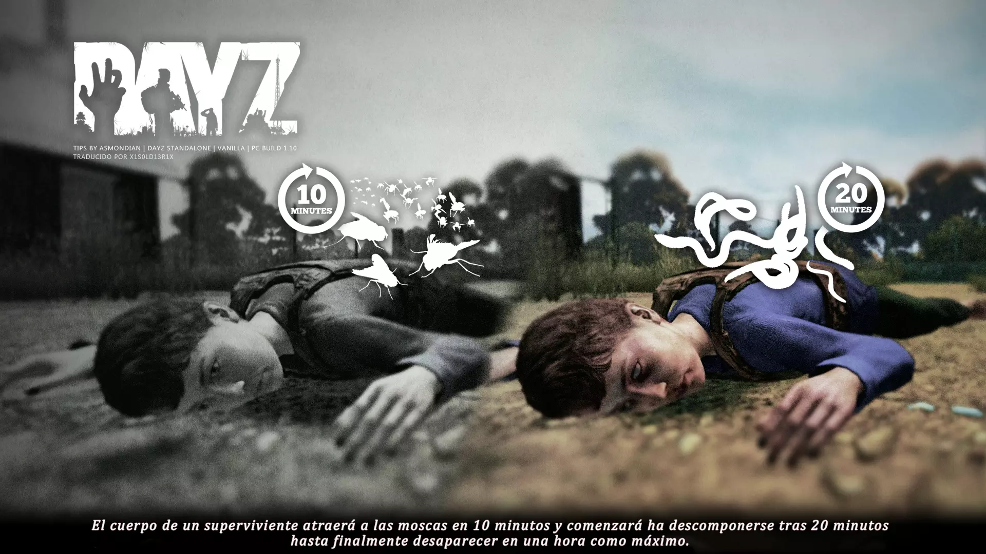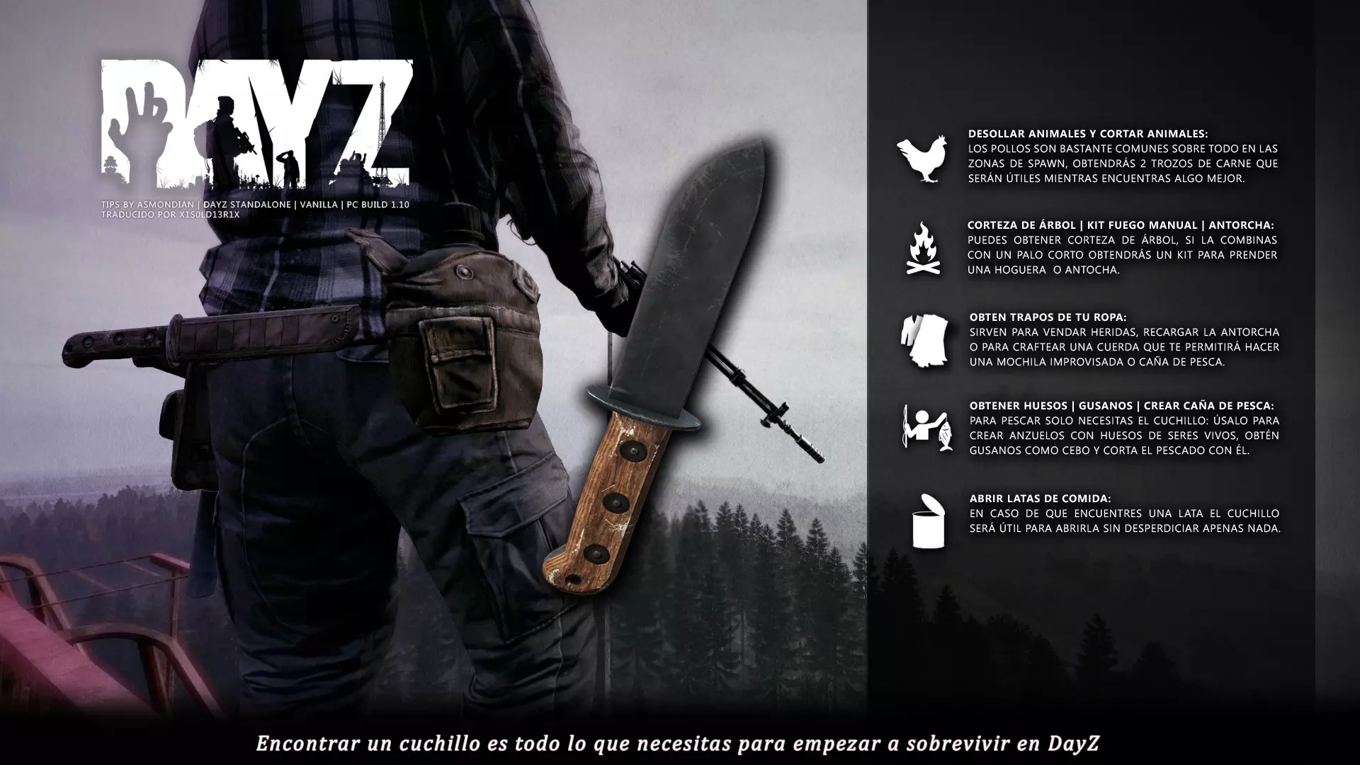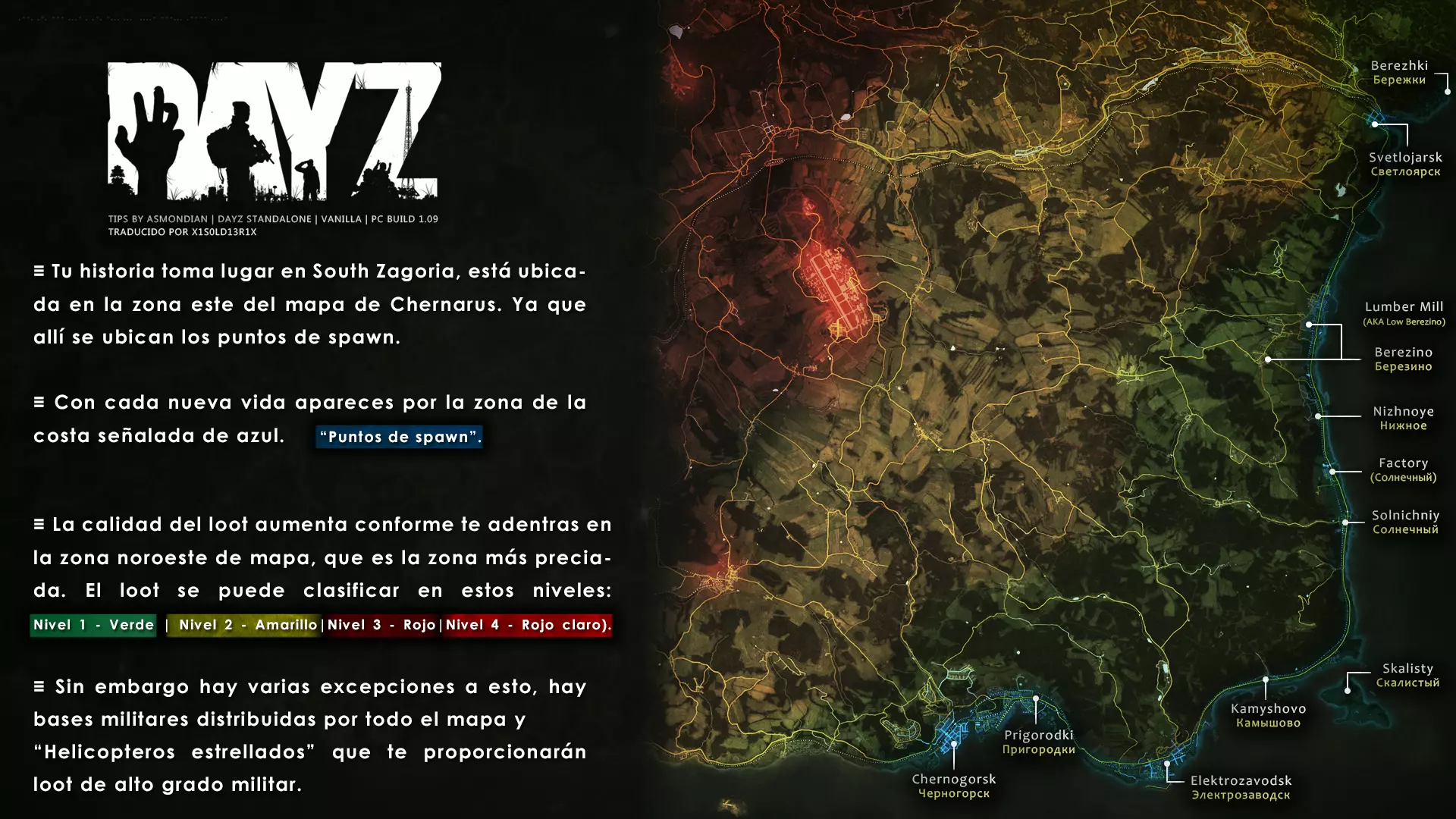 Aquí iré informando de las futuras actualizaciones de la guía. · 23/03/2021 - Guía actualizada hasta la versión 1.11 · 29/05/2021 - Guía actualizada hasta la versión 1.12 También se ha añadido una segunda sección de servers recomendados con el mapa de Namalsk · 13/06/2021 - Añadidos varios servers recomendados de Esseker y añadido un nuevo server recomendado para Chernarus (Invicta server) · 03/07/2021 - Actualizada la imagen principal de la sección "[Primeros pasos] Comida" con los nuevos tipos de comida. Añadida una nueva infografía en "[Info] Horticultura" con más datos significativos. · 04/07/2021 -Actualizada la sección "[Primeros pasos] Comida" con una imagen actualizada de los valores de la carne. Añadido un consejo con infografía de Asmondian en la sección " [Info] Caza" sobre como aprovechar los cadáveres humanos para nuestra supervivencia. · 04/07/2021 - Se están actualizando las infografías de Asmondian a la 1.13 que contienen nueva información, es algo que llevará algún tiempo. · 18/07/2021 - Se ha creado un grupo de Steam para la comunidad hispanohablante de DayZ, es un punto de encuentro para todos los supervivientes donde contar nuestras historias, consultar dudas, problemas y todo lo relacionado sobre el juego. https://steamcommunity.com/groups/DayZ-ESP · 5/08/2021 - Traducidas las infografías de la sección "[Protección] Chalecos y cascos" y "[Sistema inmunitario] Enfermedades" · 7/08/2021 Añadido nuevo server Livonia a recomendados: [GER] TheVoid | Hardcore | Organic RP | 1PP |: 5.230.84.31:2302 Es un Role Play Orgánico muy recomendable y bastante popular a pesar de estar recién abierto. · 13/08/2021 Añadido nuevo server Chernarus a recomendados: 14 DIAS | NEVER ZURRENDER | PVP | ORGANIC RP: 138.201.83.45:2304 Servidor semi-RP Orgánico en español, se ha añadido de manera excepcional por ser un buen sitio para aprender a jugar para aquellos que tengan menos paciencia, el server da bastantes facilidades como un mapa, comida extra y demás añadidos que desde aquí no solemos recomendar, sin embargo está bastante bien para empezar a jugar ya que no es un server Hardcore y además tiene una buena comunidad. · 14/08/2021 - Actualizadas infografías de las medicinas en la sección: [Medicamentos] Clases, [Reparación] Reparar loot, [Primeros pasos] Comida y [Shock] Inconsciencia · 17/08/2021 - Añadida nueva info a la sección [Daños] Dolor que no había sido incluida, básicamente que la morfina es un remedio muy efectivo contra el dolor. · 11/09/2021 - Guía actualizada hasta la versión 1.13, Añadida nueva sección médica llamada [Enfermedad] Heridas infectadas. · 27/10/2021 - Creada sección [Enfermedad] Envenenamiento Tóxico en la guía médica para conocer lo relativo a esta enfermedad. · 30/10/2021 - Creada sección [Info] Zona Tóxica en la guía de supervivencia donde se revelan todos los datos relativos a las zonas contaminadas y actualizada la lista de servers recomendados. · 31/10/2021 - Guía actualizada a la 1.14 en su mayor parte, lo cierto es que no tengo tiempo para completarla como me gustaría pero cuando lo disponga lo haré, añadido nuevo consejo en [Combate] Nociones avanzadas 2 para matar a los zombies de una puñalada, también se ha actualizado la sección de Trampas de la guía de armas y combate. · 15/01/2022 - Actualizadas las secciones de armas de la guía de armamento y combate, se han añadido las armas que faltaban. Actualizada la sección [Crafting] Armas recortadas. · 16/01/2022 - Actualizada la sección [Sangre] Heridas con la nueva info sobre infecciones en los cortes. · 17/01/2022 - Creada nueva sección con los tipos de zombies en la guía básica. · 03/04/2022 - Editada sección [Reparación] Reparar loot de la guía de crafting (básicamente que las máscaras de gas se pueden reparar con Epoxy y el traje NBQ con el kit de reparación de neumáticos. NOTA: Hacer las trampas para peces. · 20/04/2022 - Actualizada la sección de servers, se han incluido nuevos servidores y eliminado las comunidades cerradas, además de actualizas algunas IPs, la mayor novedad es que ha vuelto el servidor DayZ Core de Livonia y ha tenido una gran acogida. · 30/04/2022 -Actualizada la sección de "[Crafting] Básico" de la guía de crafting y loot, se han incluido un par de infografías de Asmondian. · 02/05/2022 - Actualizada la sección de "[Info] Pesca" de la guía de supervivencia, se han incluido las trampas para peces, lo mismo con [Info] Caza, se ha incluido el lazo trampa para conejos y gallinas, también [Info]La cocina (2ª Parte), en ella se ha actualizado el método de cocina "Hervido" con nueva info y por último mencionar que los helicrash cuando spawnean emiten un ruido estrellándose que permite escucharlos, con esto la guía queda completamente actualizada a la versión 1.14 · 07/05/2022 - Voy a tratar de rehacer todas las secciones de la guía para mejorarla, de momento he comenzado con la básica sección por sección. · 20/05/2022 - Guía actualizada completamente a la 1.15 · 10/06/2022 -Actualizada la sección [Info] Zombies 1/1 añadiendo la alarma como método de distracción, actualizada guía con nueva info: es posible beber con las manos manchadas de sagre sin enfermar si se hace desde un recipiente, nueva info sobre la reparación de loot y ahora es posible crear una tablilla para fracturas mediante cinta aislante y palos cortos. Actualizada la guía completamente a la 1.16. · 23/01/2023 - Actualizado servidores recomendados · 02/02/2023 - Estoy actualizando la guía lentamente, ya que algunas partes han quedado obsoletas, actualmente hay datos erróneos debido a que se han cambiado mecánicas. Introducción